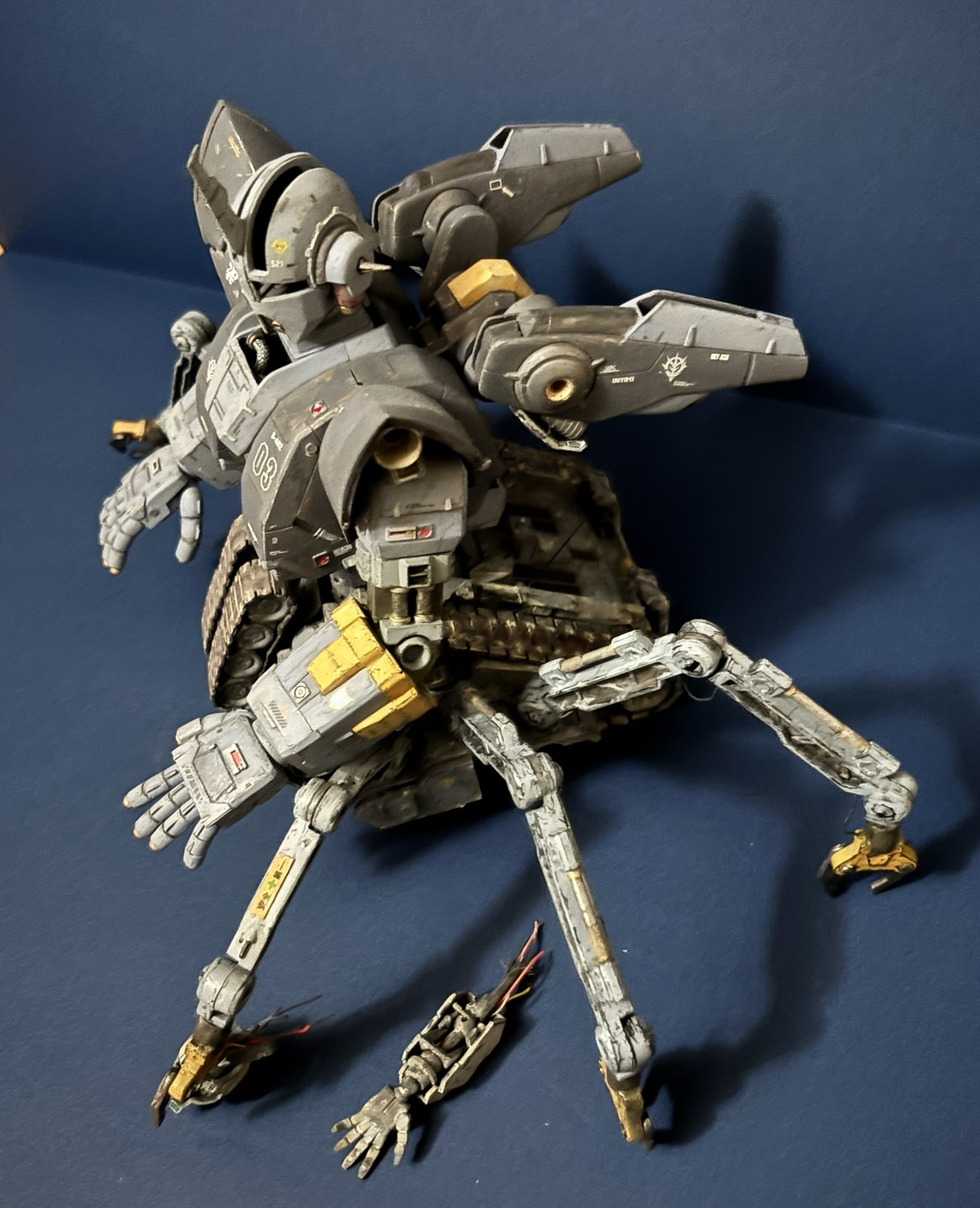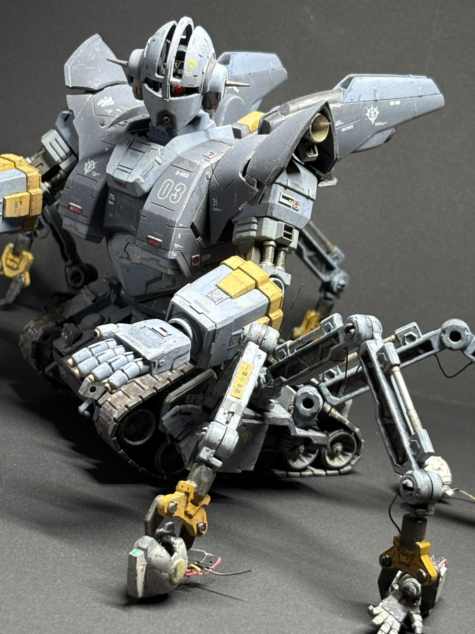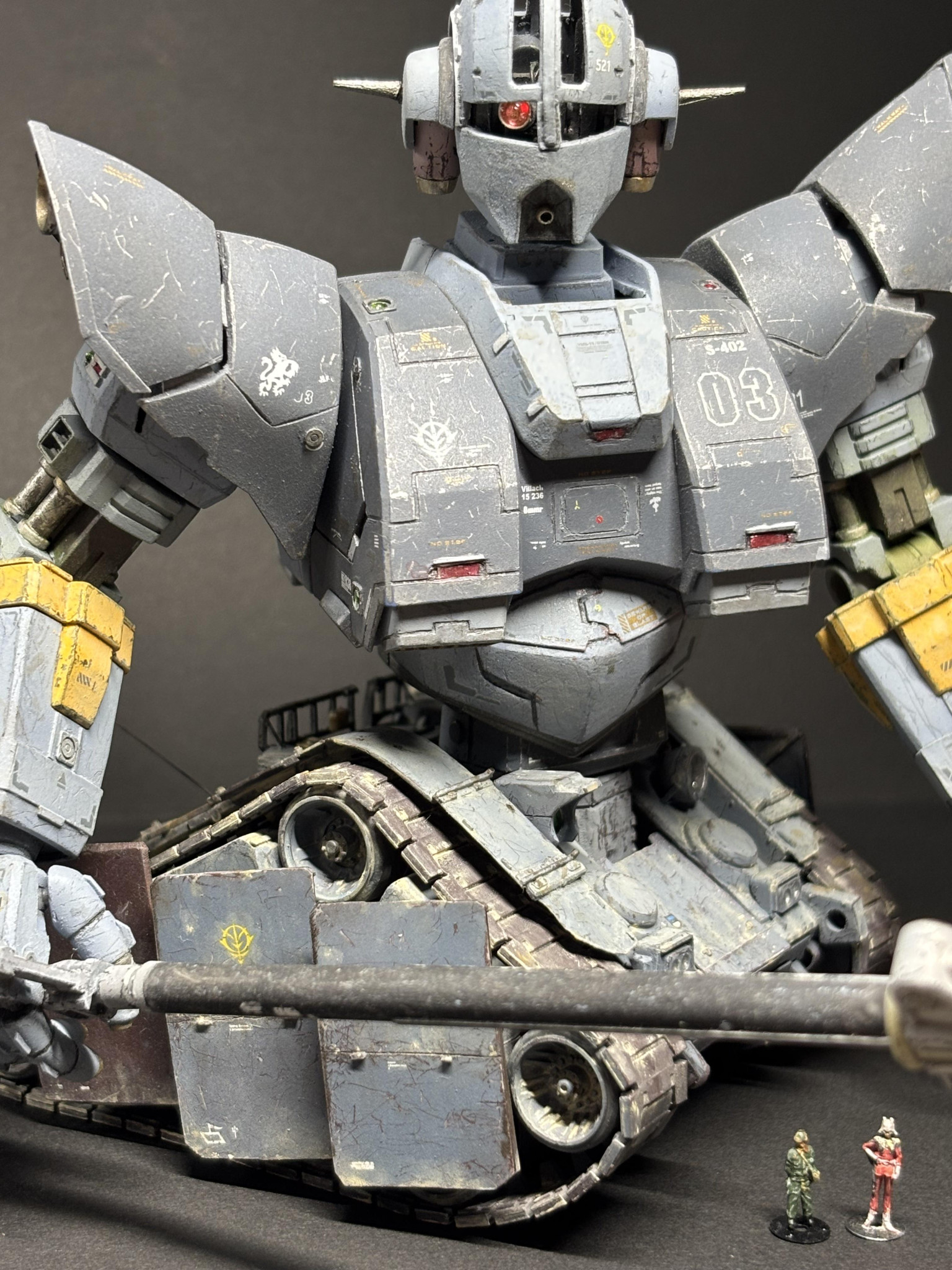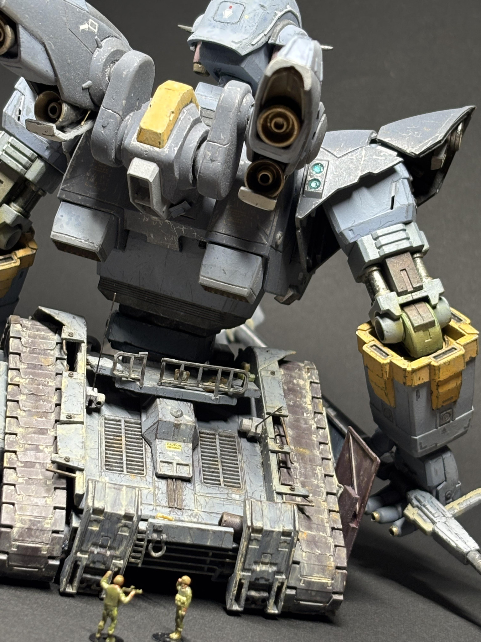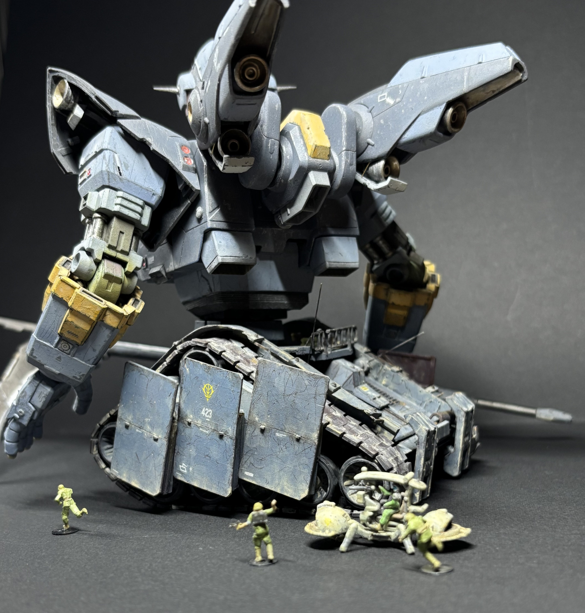 上半身のジオングは宇宙兵器です。脳内妄想で空軍の制空迷彩にして汚し控えめです。一方で、下半身ガンタンクは正統派パンツアーグレイに派手な砂汚れ。