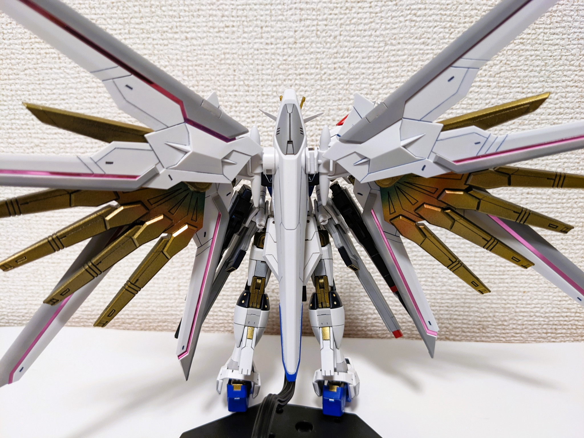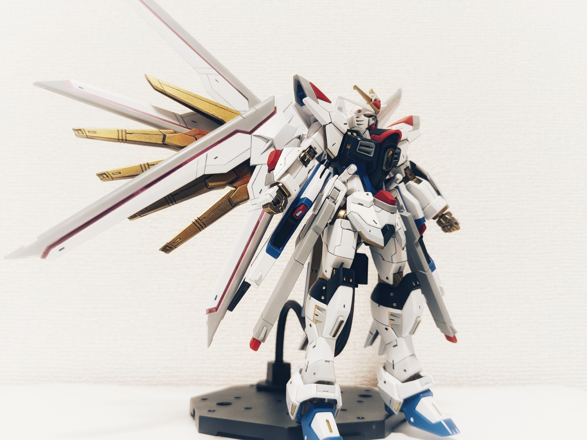 いつかは自分の手ですべてを選んでデザインをしたいものです。いろいろな先輩方のマイストの作品を拝見し、自ら選び参考にさせていただきました。今まで作成したガンプラの中でも一番長い時間がかかりましたが、スジボリや塗分けはある程度満足いく出来になったのかなと思います。最強のモビルスーツに似合うよう、細部にもゴールドを多く使ってみました。武器などを持たせたものはまた後程アップさせていただければと思います。