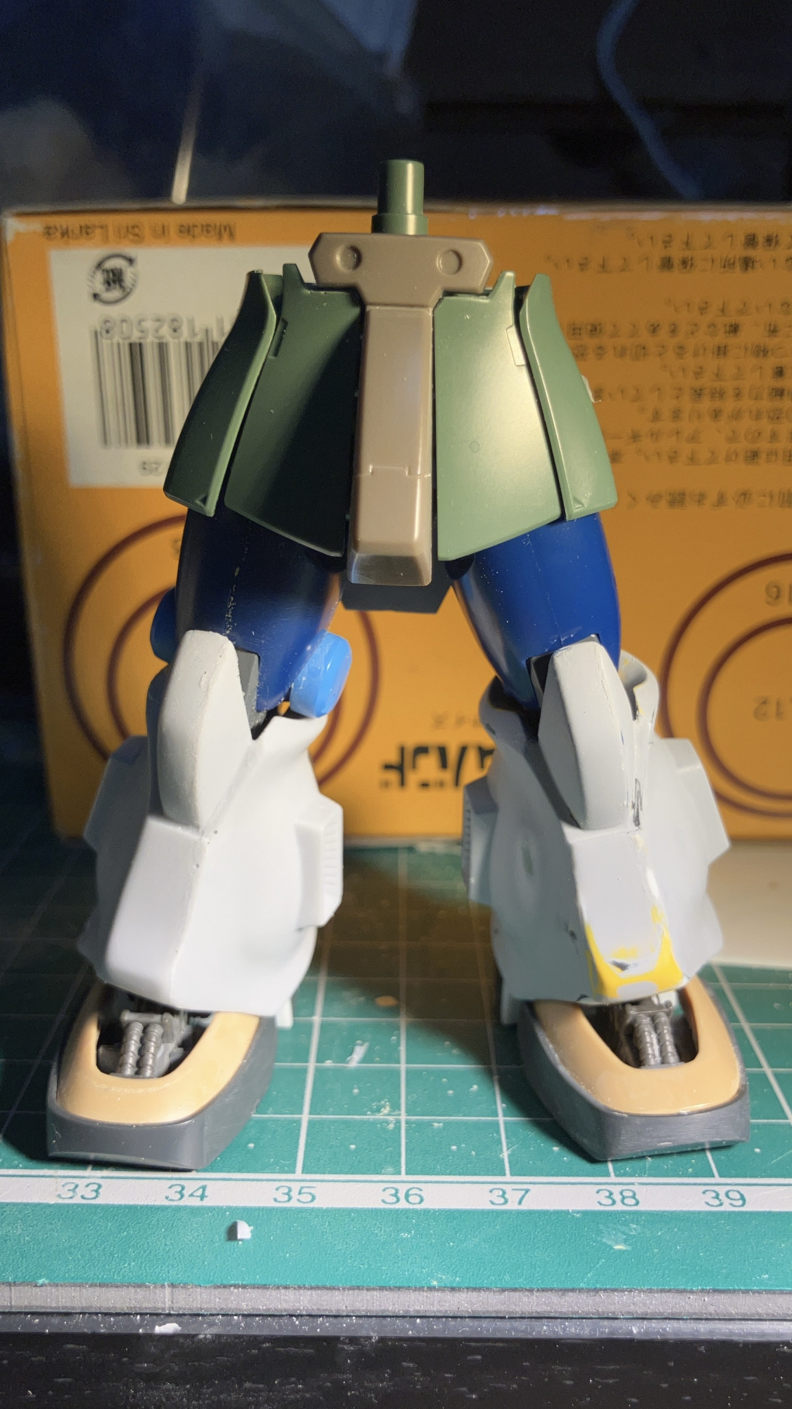 足から見ていきます、基本的にザク系のパーツを組み合わせていますが、足首には全く違うパーツが鎮座しています笑、鉄血系の…ルプスだったかな?パーツ置き換えに伴い、レッグスカート部分を干渉しない様に大幅にけずっています。