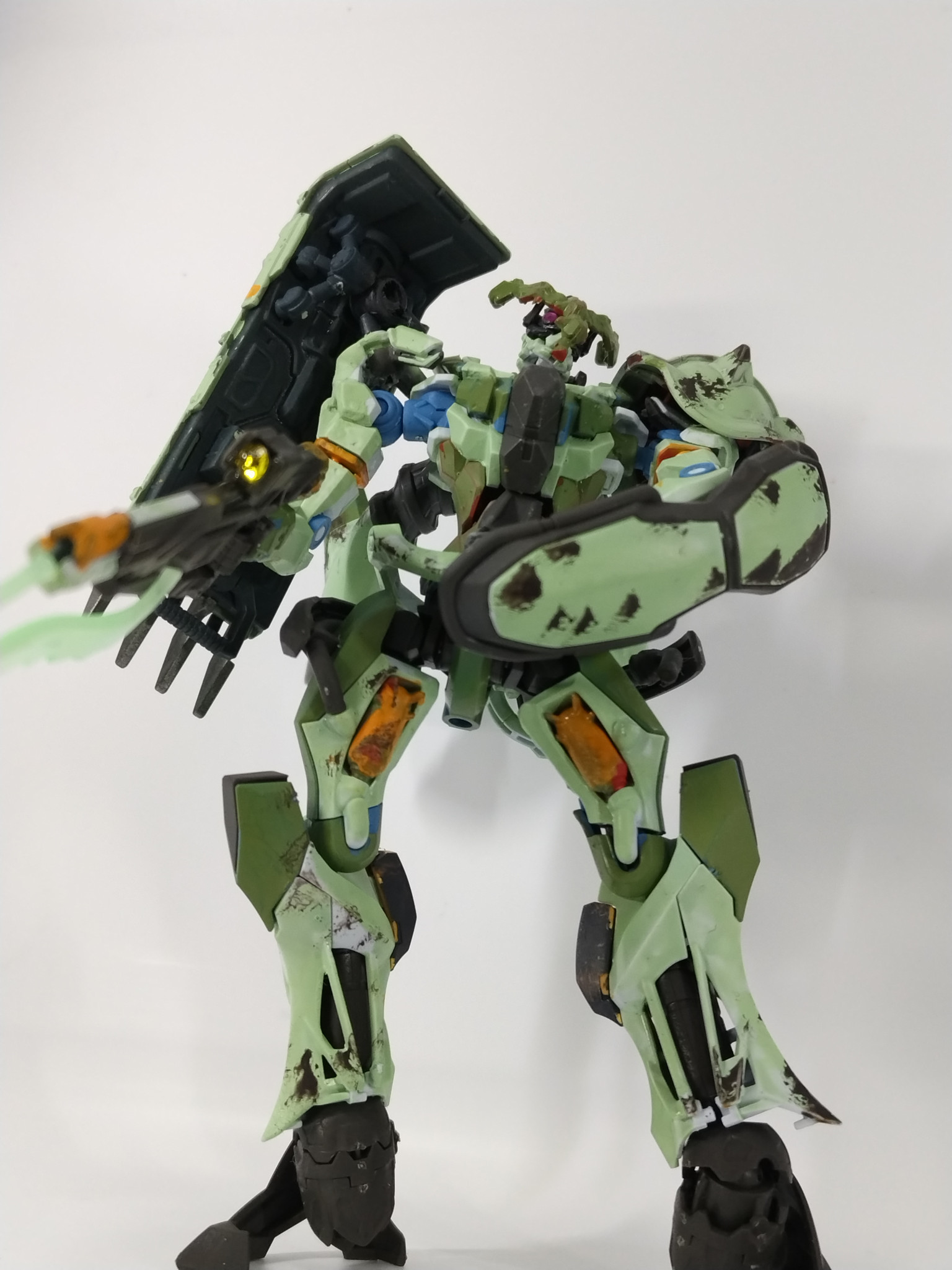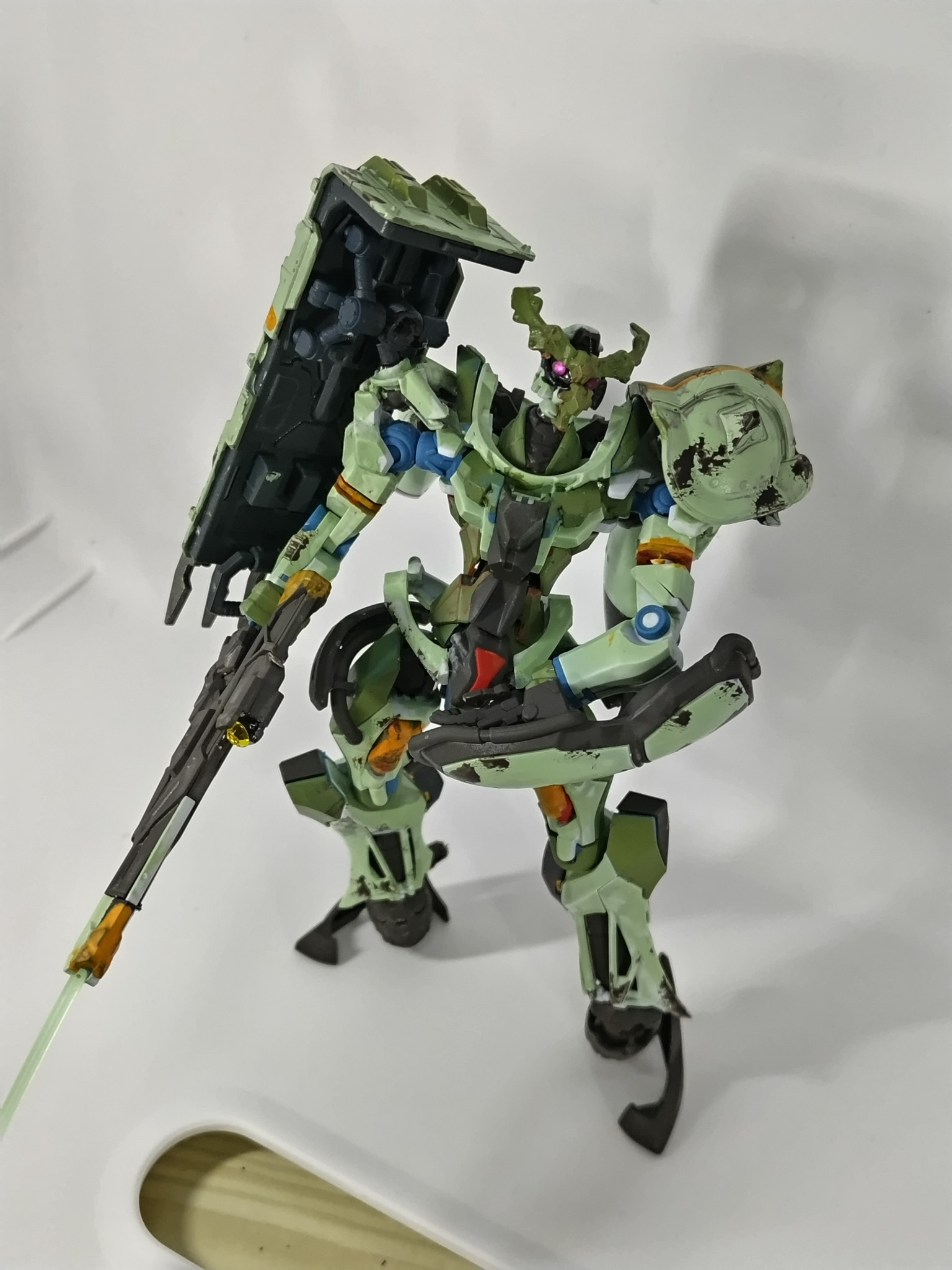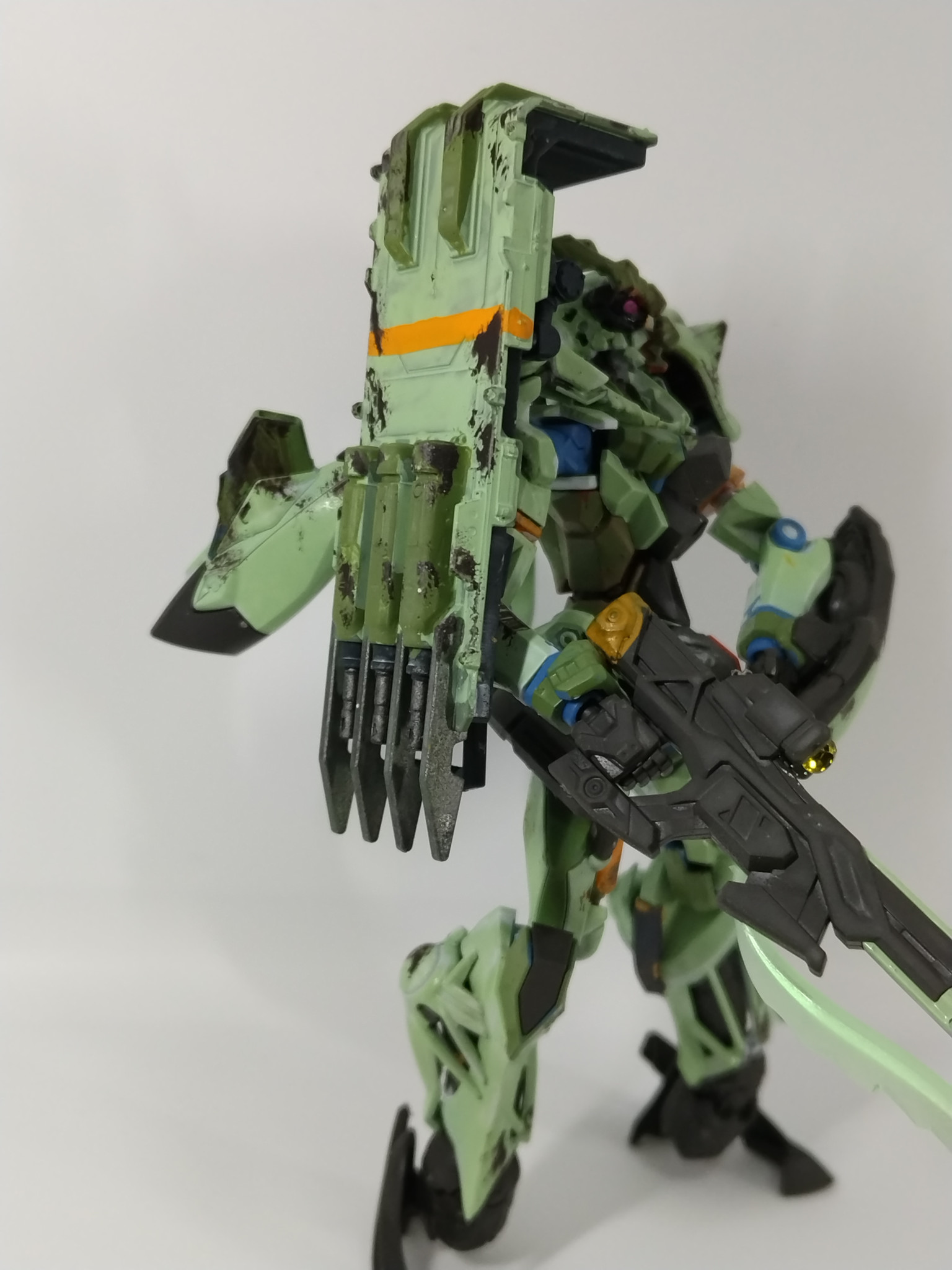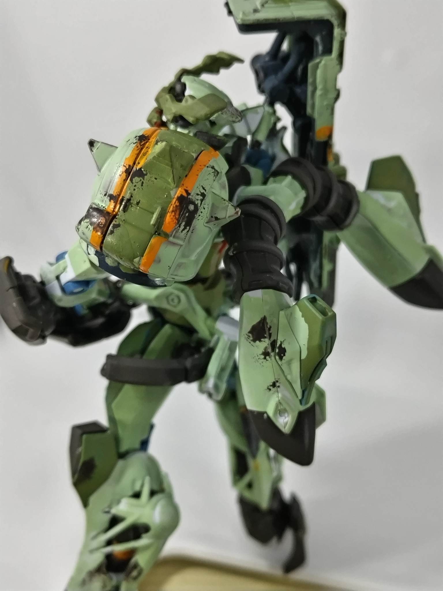 塗装は、水性ボトムズカラーATライトグリーン、ATグリーン、水性ガンダムカラーのファントムグレー、それとオレンジの帯はタミヤアクリルです。