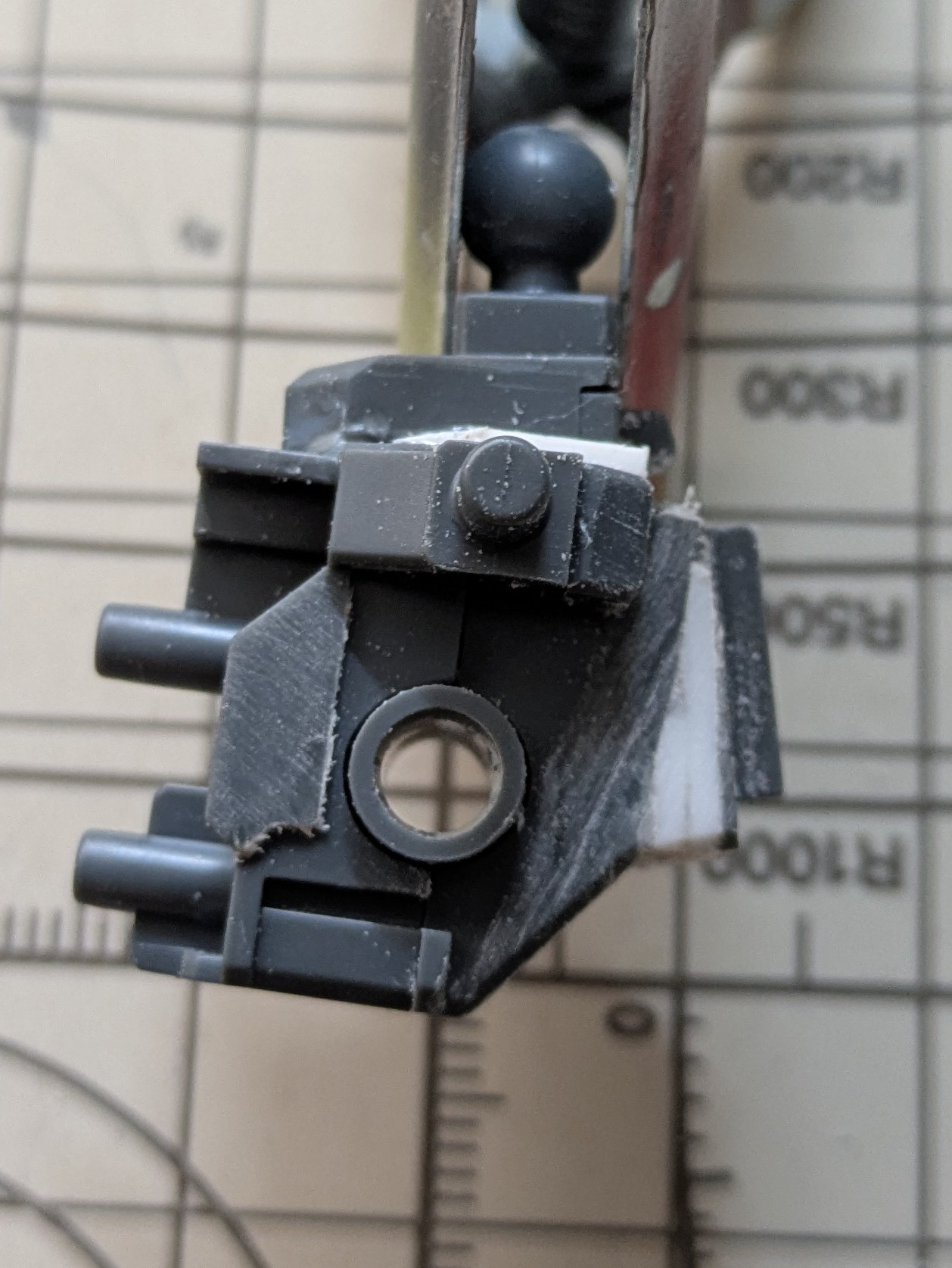 肘のガワラ曲げ工作。肘関節を切断して真鍮線で角度をつけて接着しただけ。動かそうと思わなければ簡単なのだ。