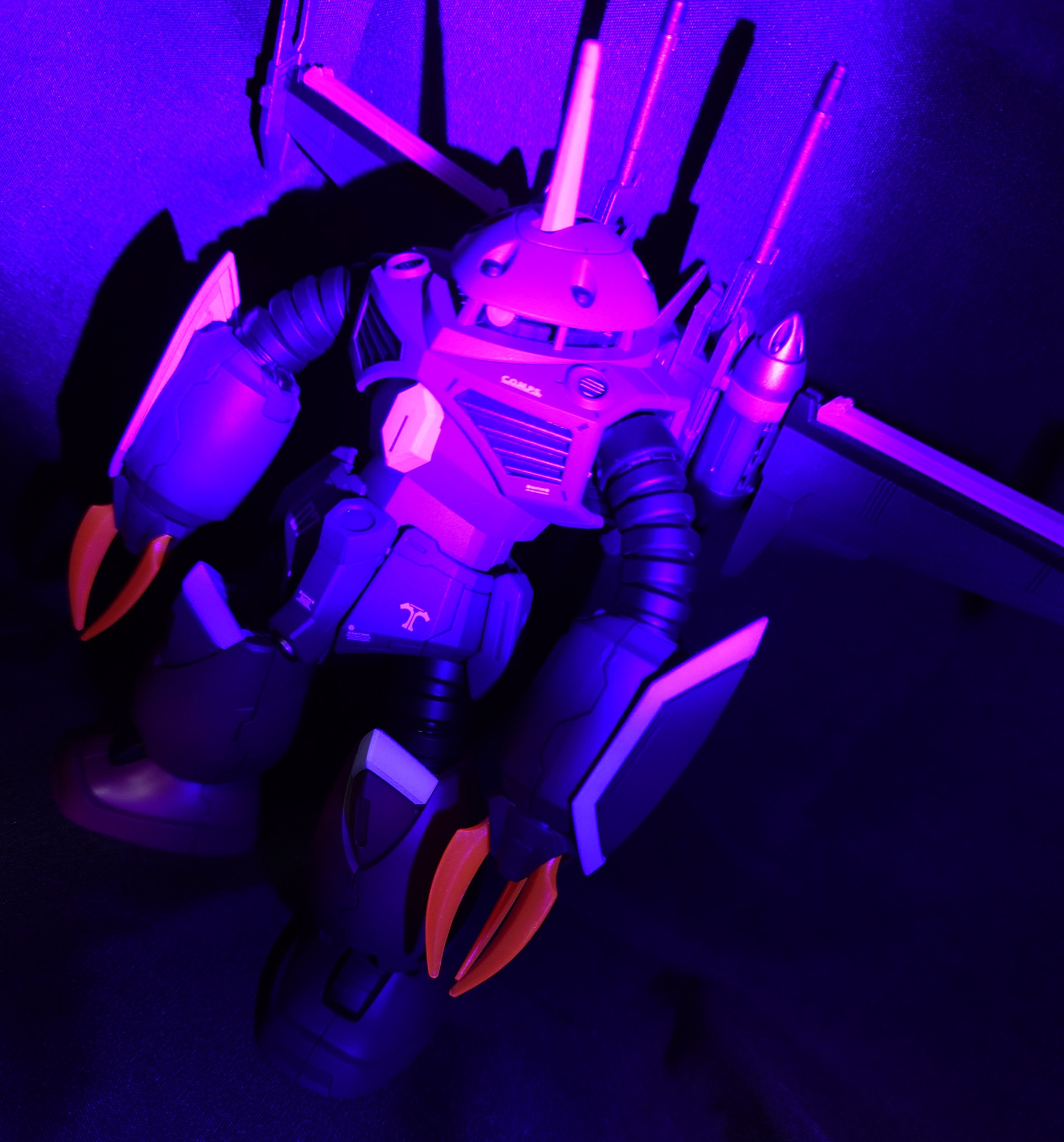 闇夜に浮かぶモノアイと爪。爪も蛍光樹脂でしたので、クリアだけ塗装しています。