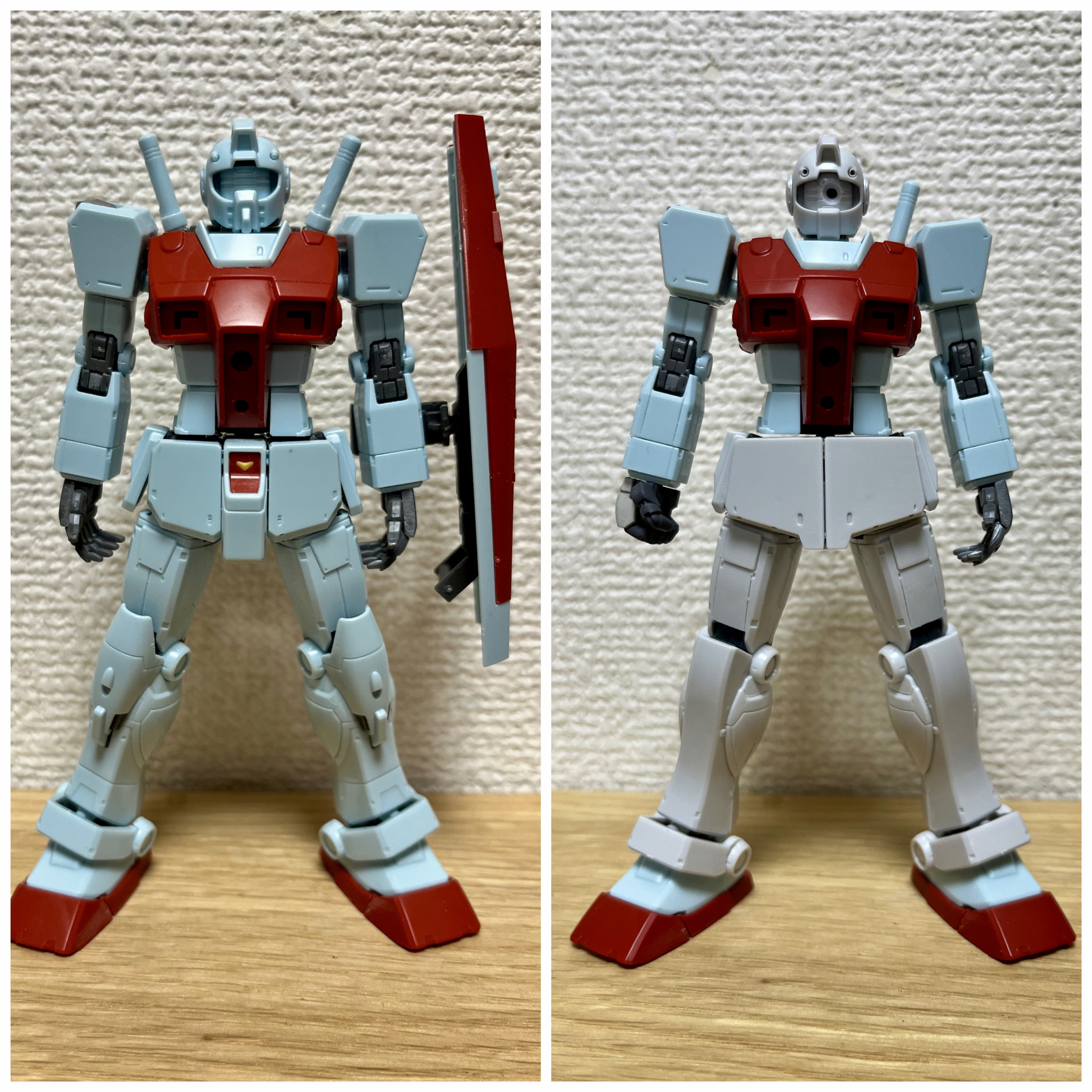 ミキシングの前後。前述しましたが、HG ジム・スループ(頭部、腰から下) と HG ジム ショルダー・キャノン装備/ミサイルポッド装備(胴体、腕、足首・スリッパ)でミキシングしてます。