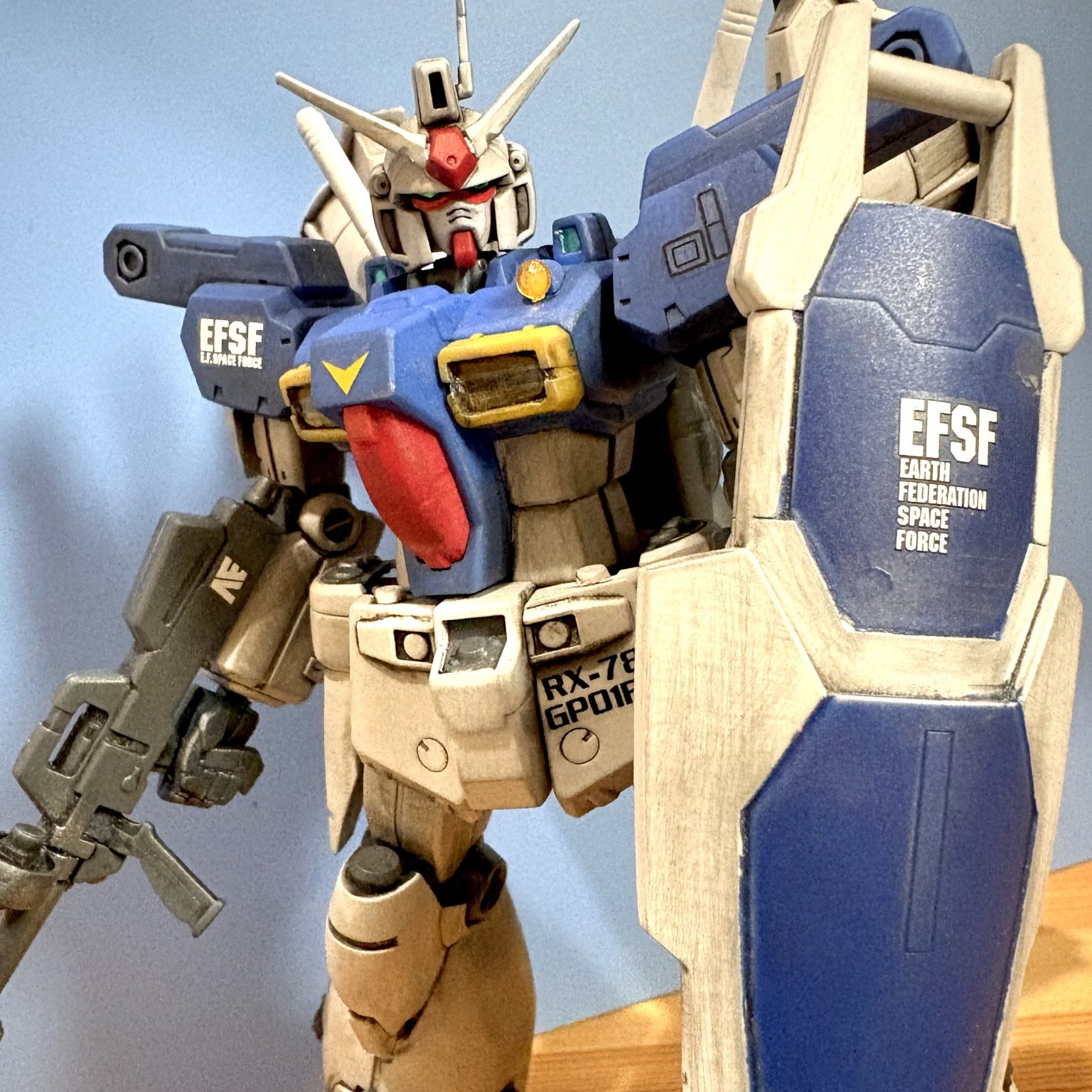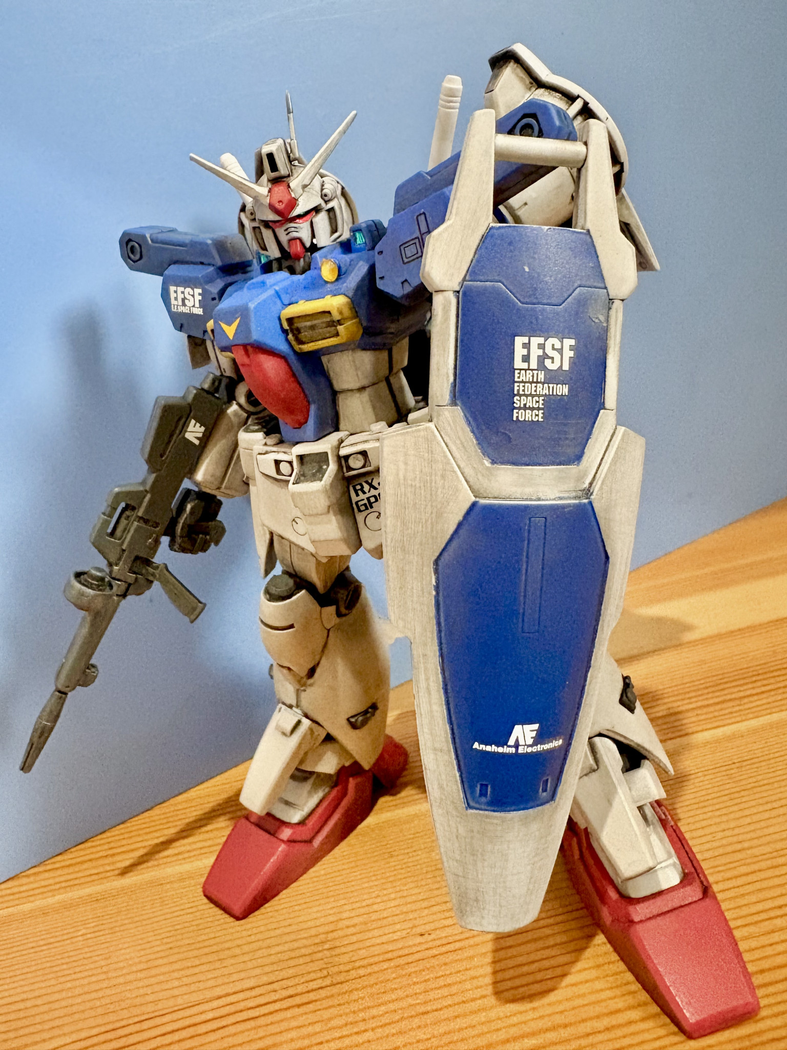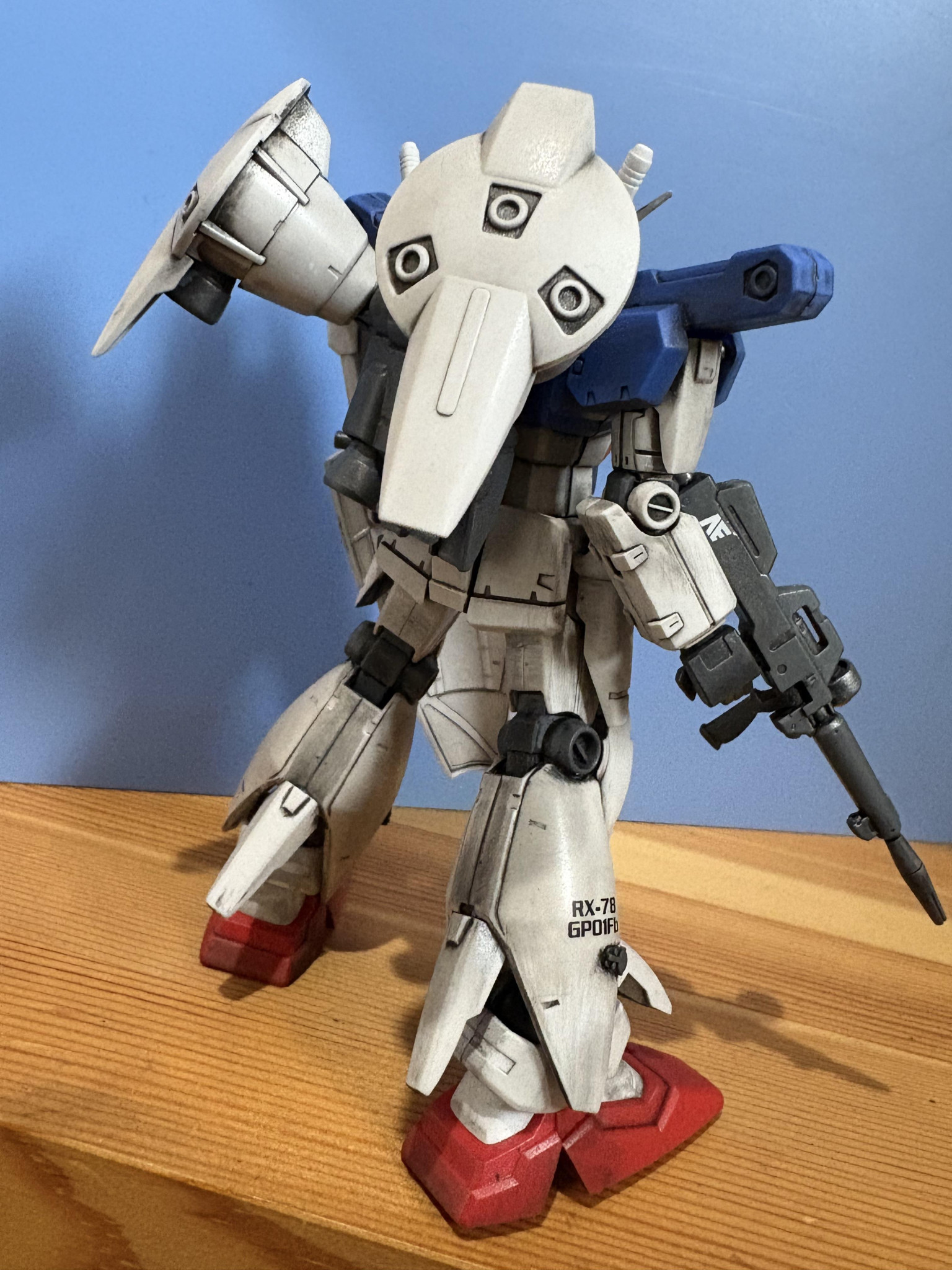 全体図☺️本来なら急制動かけたりする際に展開するはずのスラスターを除去して汚しただけで素組みに毛が生えたレベルですがまあ、思ってたよりいい仕上がりになったので満足😚
