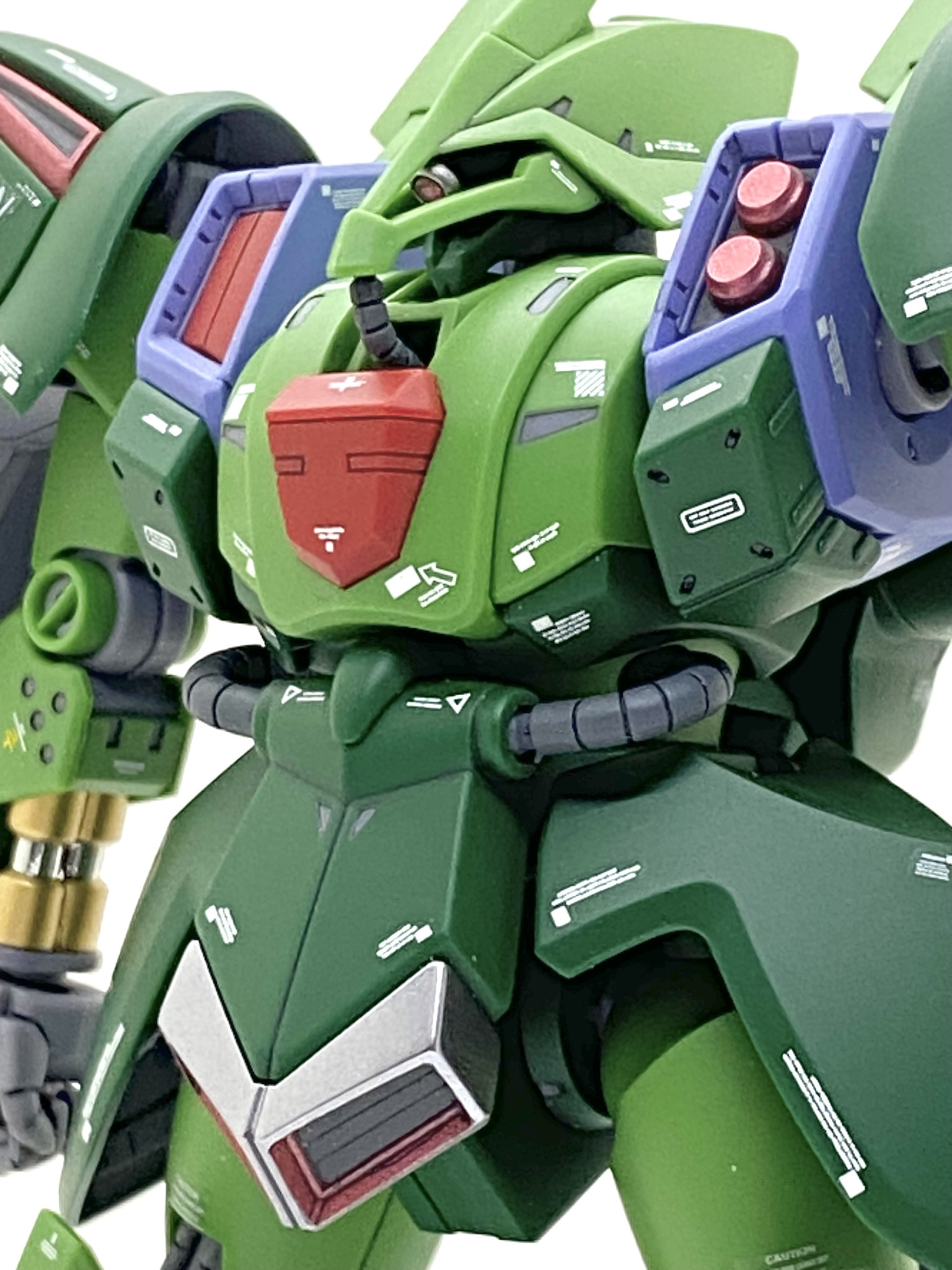 墨入れが終わるといよいよデカール貼りなのですが・・・ガルスJはやや大きめな機体なので次にやはり大きいドーベン・ウルフ作るから今回もMG サザビーVer.Kaのをメインに貼っていきます・・・同じジオン系のデザインなのでサイズが違っても違和感はありませんでした。ですがVer.Ka系デザインはCAUTIONと文字にあるデカールが殆ど無いのでここは悩みました。RE/100のマーキングシールには結構その手のシールがあるというのはバルギル作った時にわかっていたのでまだハンマ・ハンマやヤクト・ドーガのマーキングシールは部品請求出来ましたからそれらを頼み、主にハンマ・ハンマのをかなり使いました・・・関節周りはほぼこのシールです。シールも余白を丁寧にデザインナイフで切れば段差もクリアー吹くとわかりにくくなります。デカールと併用すれば効果はかなりあるので・・・最後にシリンダーをミラーフィニッシュシートを貼り完成です。