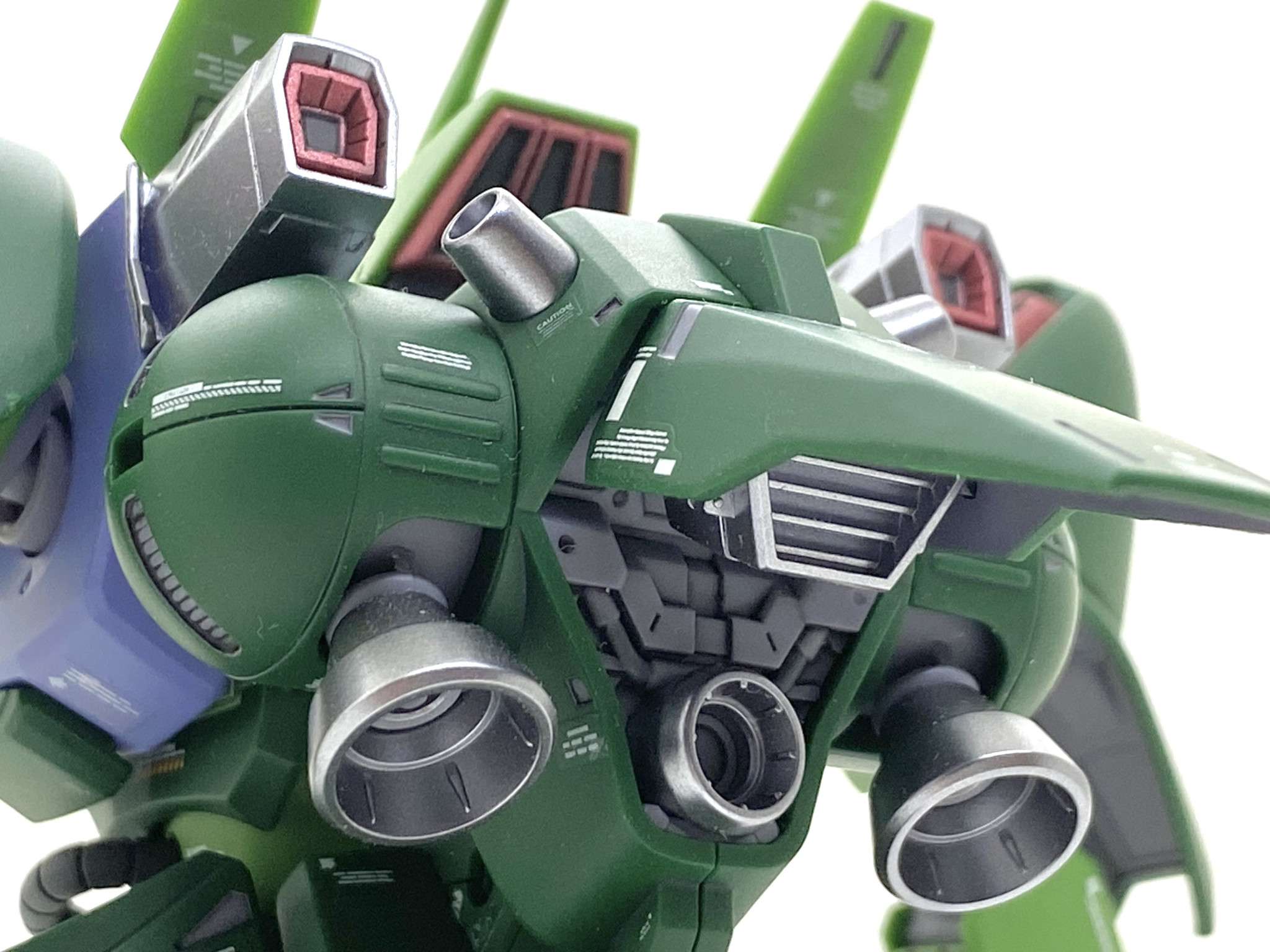 HGUC化されたガルスJは最新キットですから合わせ目が殆どなく、考えられたパーツ分割だと思いました。合わせ目消したのはエネルギー・ガンだけで足回りには多少あるのですが全部0.3mmのダンモ使って段落ちモールドにしました・・・膝の後ろにカバー見たいのがあり、ここは強度上で後ハメは非常に困難でこれなら無理なく作れます。スカート裏や足の裏、肩なんかは装甲裏が結構見えているので説明書通りに混色したグレーで塗り、MGみたいに装甲裏が別パーツみたいな雰囲気を出しました・・・小さい凹モールドなんかも全て子のグレーで塗ってます。赤いスラスター部分は艶消しメタリックにしたかったのでメタリックレッドを塗ってから、水性のガンダムエアリアルグレーを筆塗り、墨入れした後に先に艶消しクリアーを吹き、外側をフレームメタリック塗る箇所は丁寧にマスキングしてから吹いているので外側はメタリック、中は艶消しになり質感の違いを出しています。