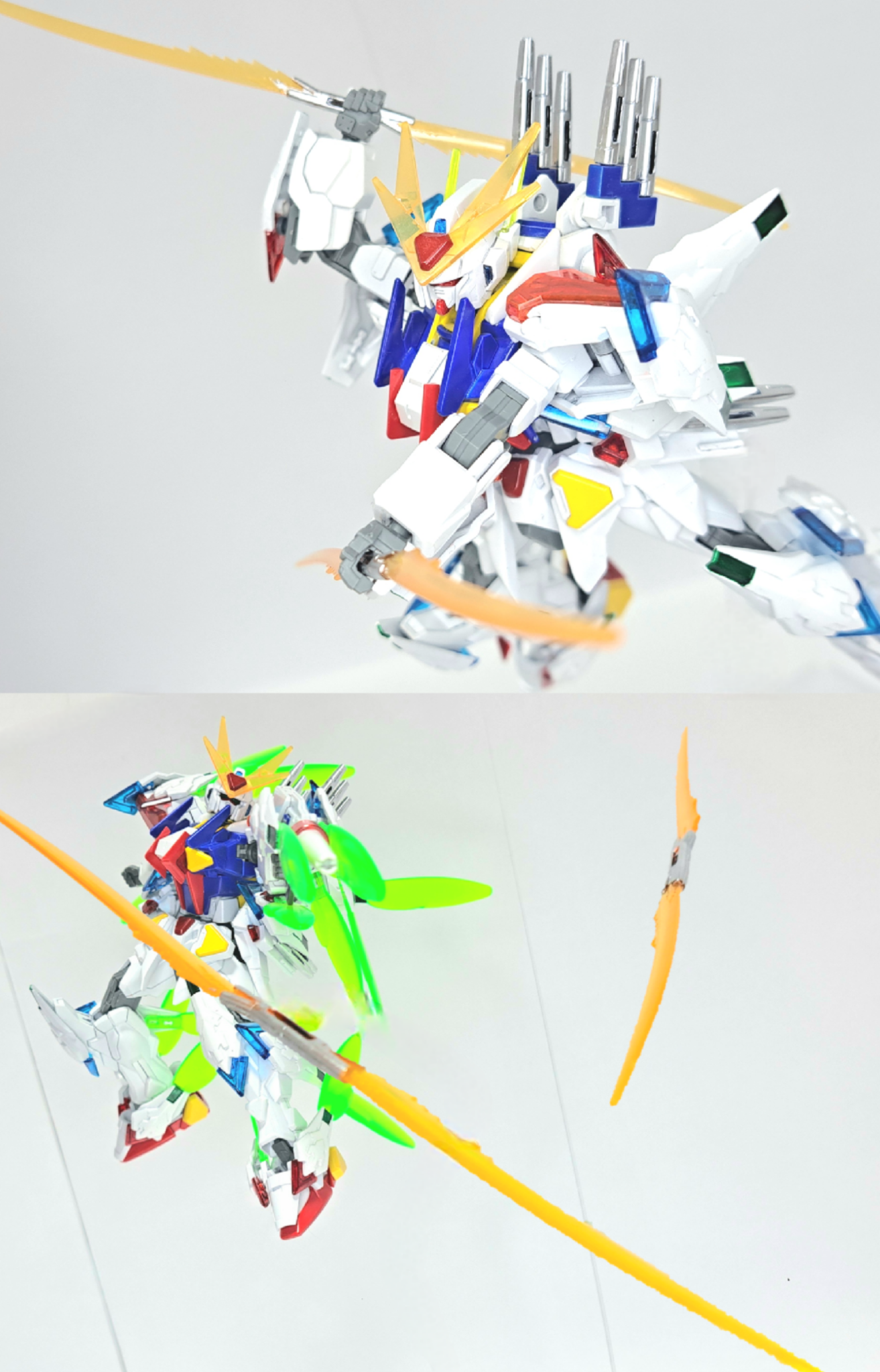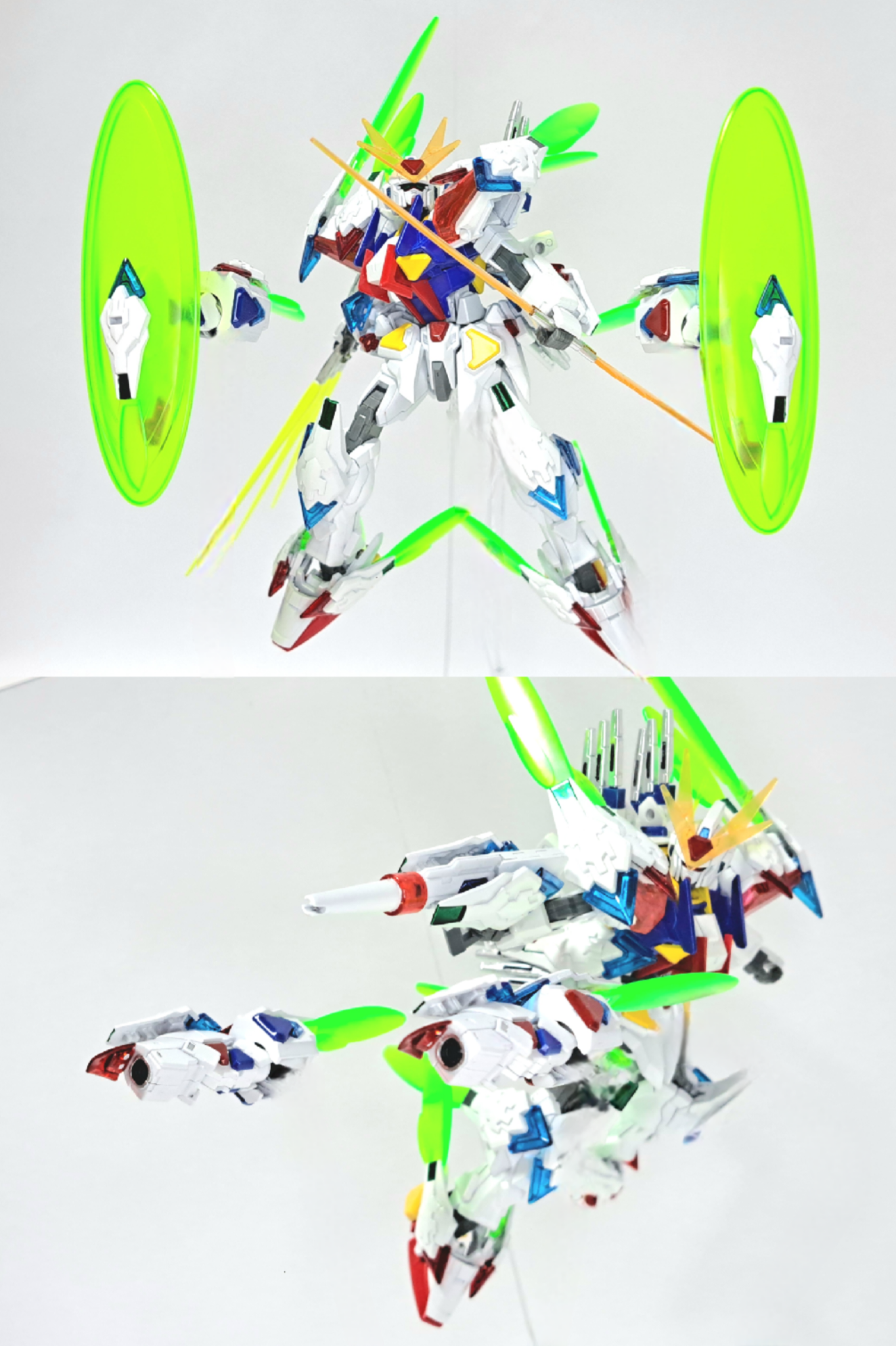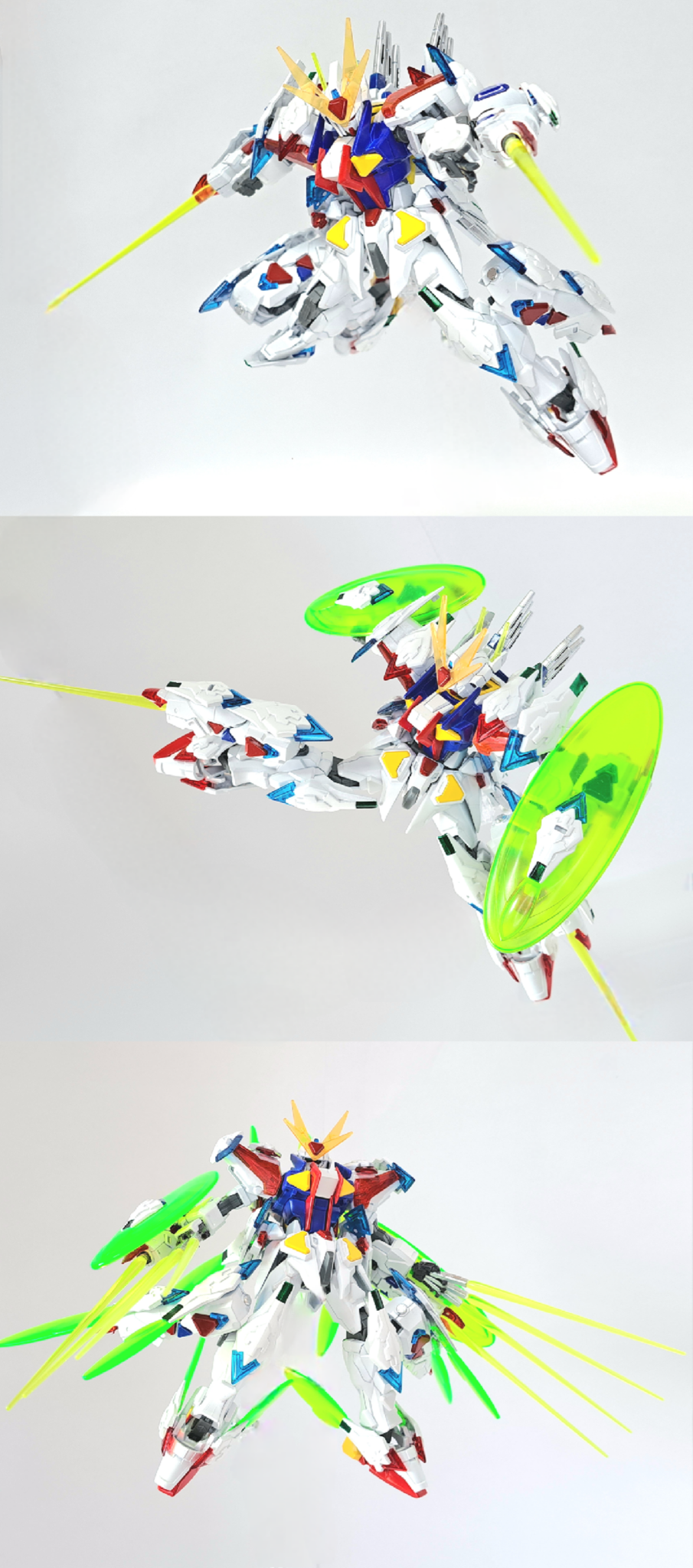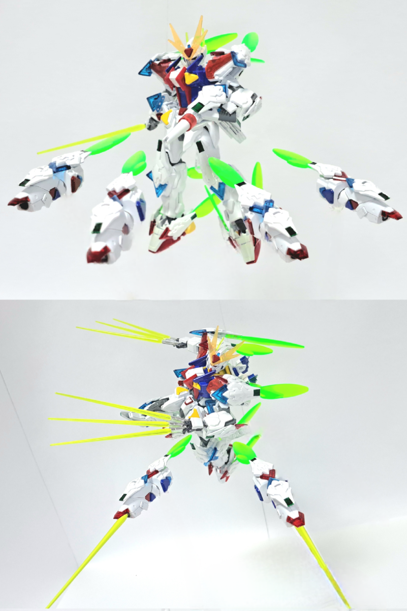 エクシードギャラクシーを素体にビギニング30のパーツを付けました。なるべくエクシードギャラクシーの面影が無くなるよう塗装しましたが、どうしても肩のクリアパーツ使いたかったのでそれはほぼそのままです。