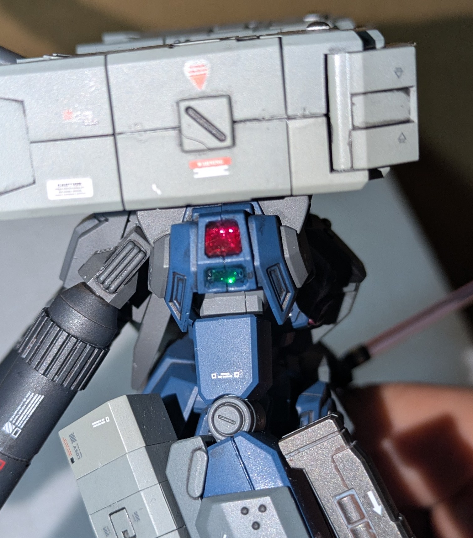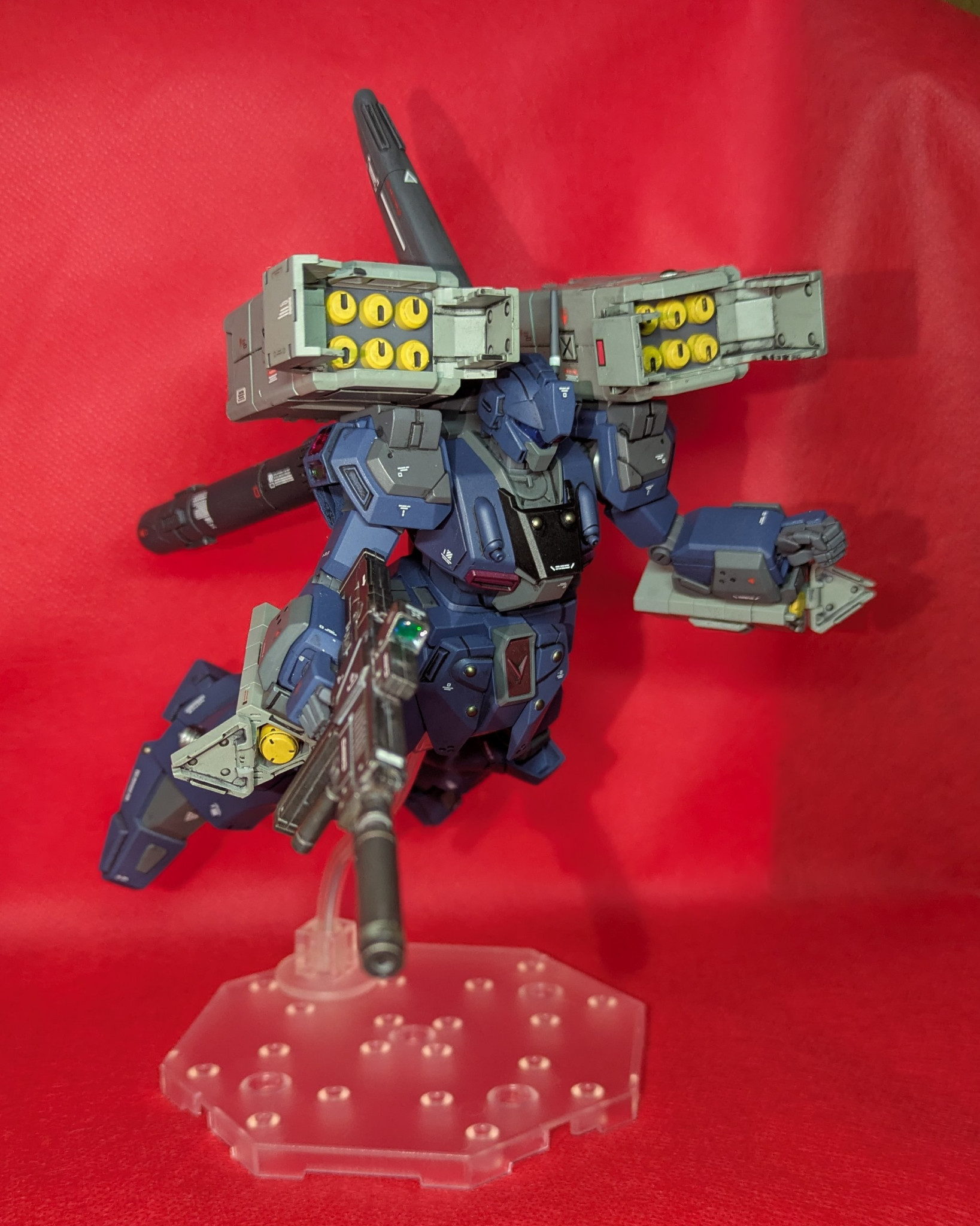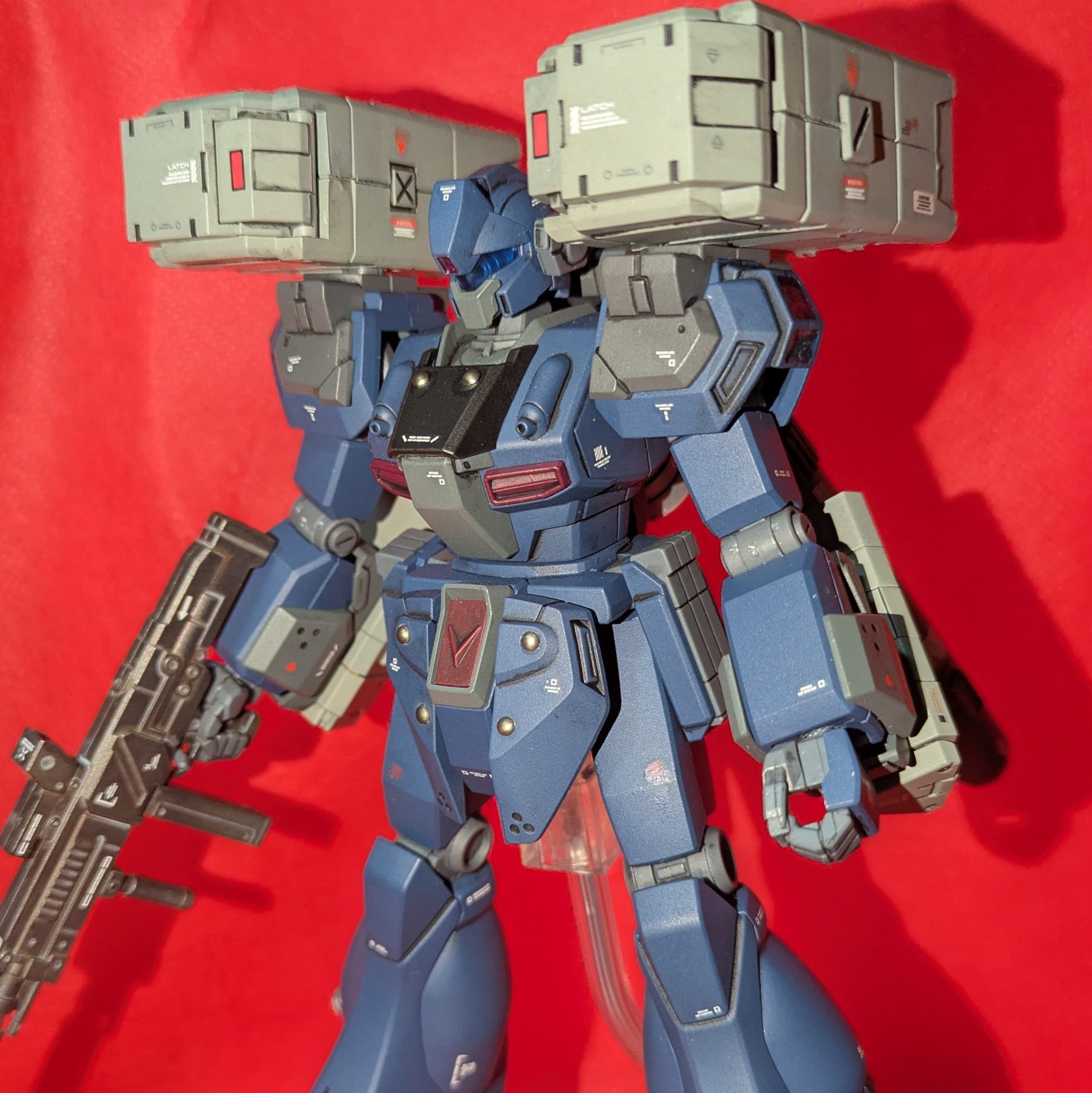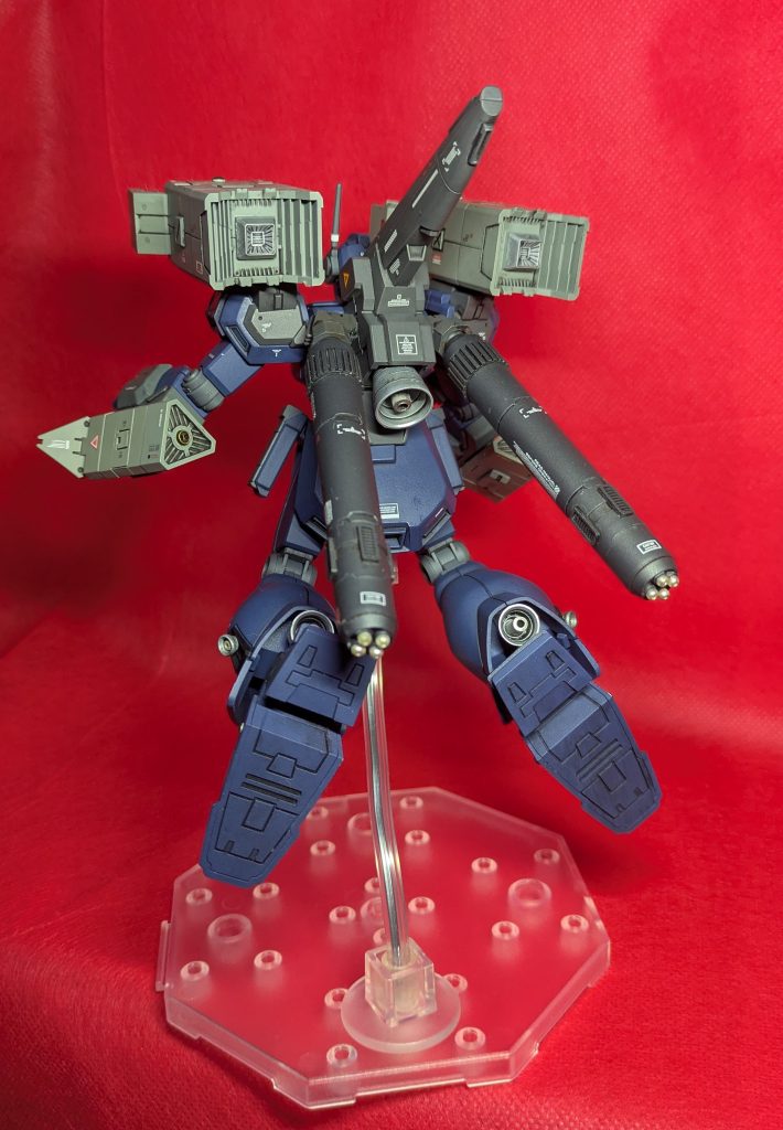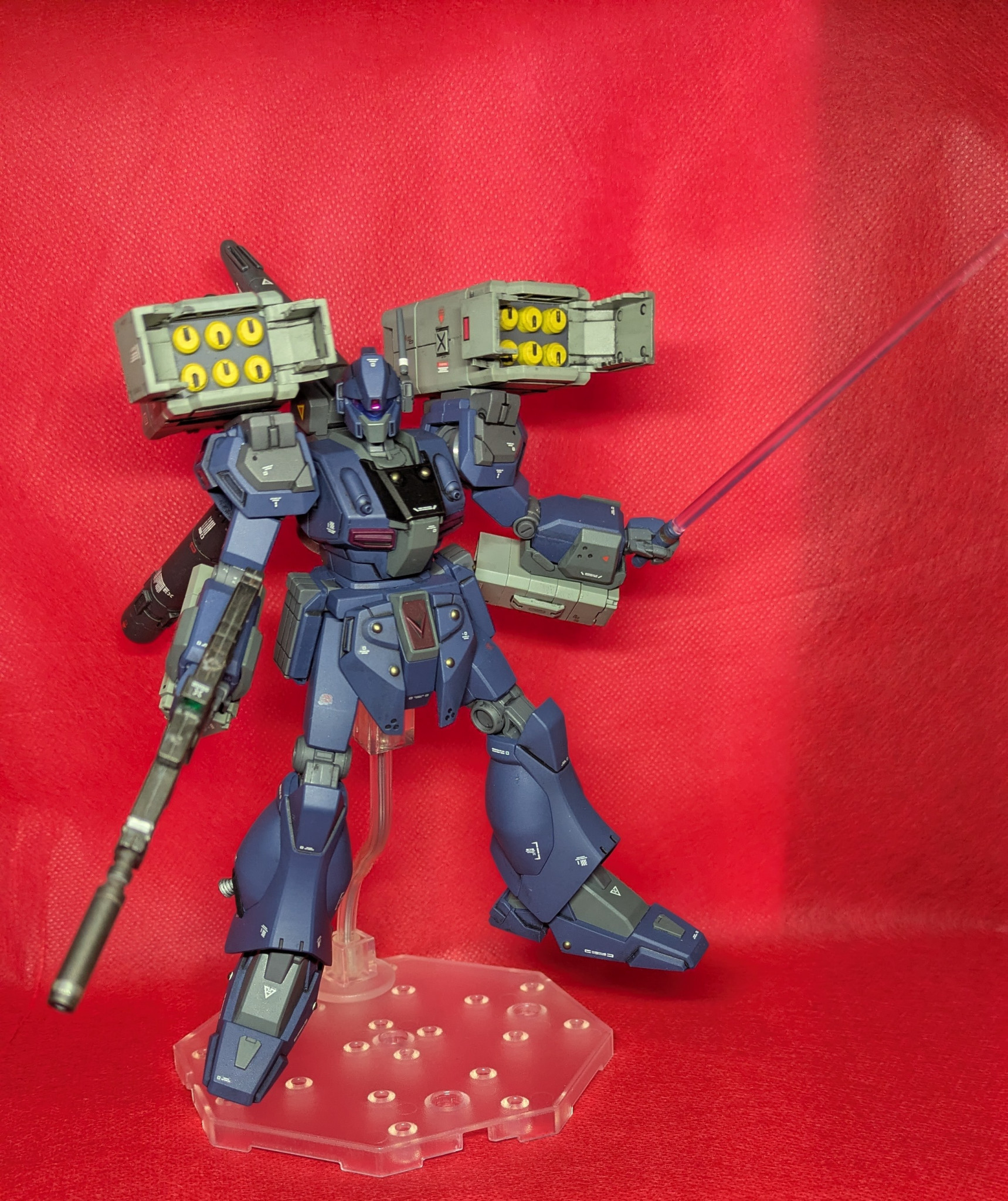 オリジナルバリエーションでヘビーアームズジェガンって物を考えてみました。当初の予定ではデカールはプレバンのジェガン祭りで入手した物を使用しようと考えていたのですが、年明けに送られてくるようなので今回は余っていたデカールで対応しました。ライフルはジェスタの物を流用。肩、腕 バーニア、プロペラントタンク等はコトブキヤさんのウェイポンユニットの転用。肩とオデコのカメラは100均デコレーションテープを下地にして赤や緑のレジンで色が鮮やかに出るようにしました。胸部等に使用しているメタルモールドも100均。あとは、足元にバーニアの追加とバーニア内部のメタルパーツ使用といったところです。