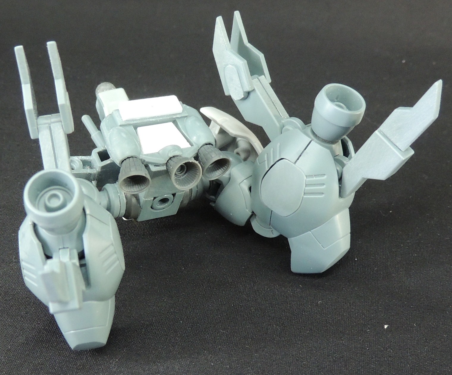 腰部サイドアーマーがフロントアーマーとリアアーマーの間に収まるようにするため、内部フレームの前後にプラ板を貼り付けて幅増しを行いました。また、サイドアーマーを本体側に寄せるため、取付基部を根元から切り離し、若干短縮化した後に位置を調整して接着しました。前後の幅増しと左右の幅詰め、それに伴う股間軸のオフセット工作により、プロポーションの変更を行うとともに、より踏ん張りのきいたポージングが可能となりました。
