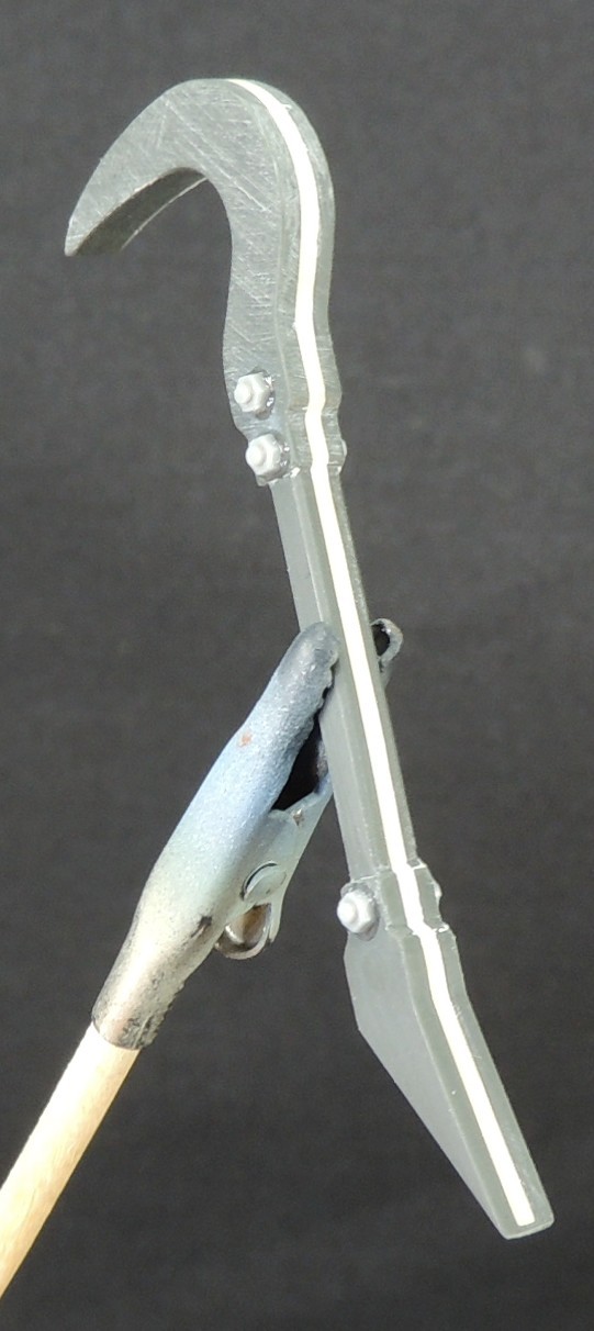 バールは肉抜き穴をエポキシパテで埋め、両端をヤスリで先鋭化しました。〇型のモールドは全て削り落とし、代わりにウェーブのR・リベット[角]を貼り付けています。1/144スケールなので人間の頭ほどのサイズのリベットとなりますが、解体作業等に用いるMS用工具の雰囲気を出すために使用することにしました。