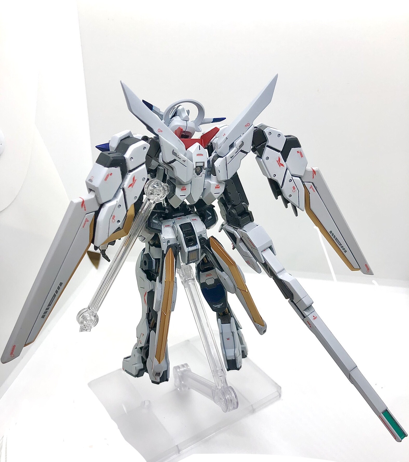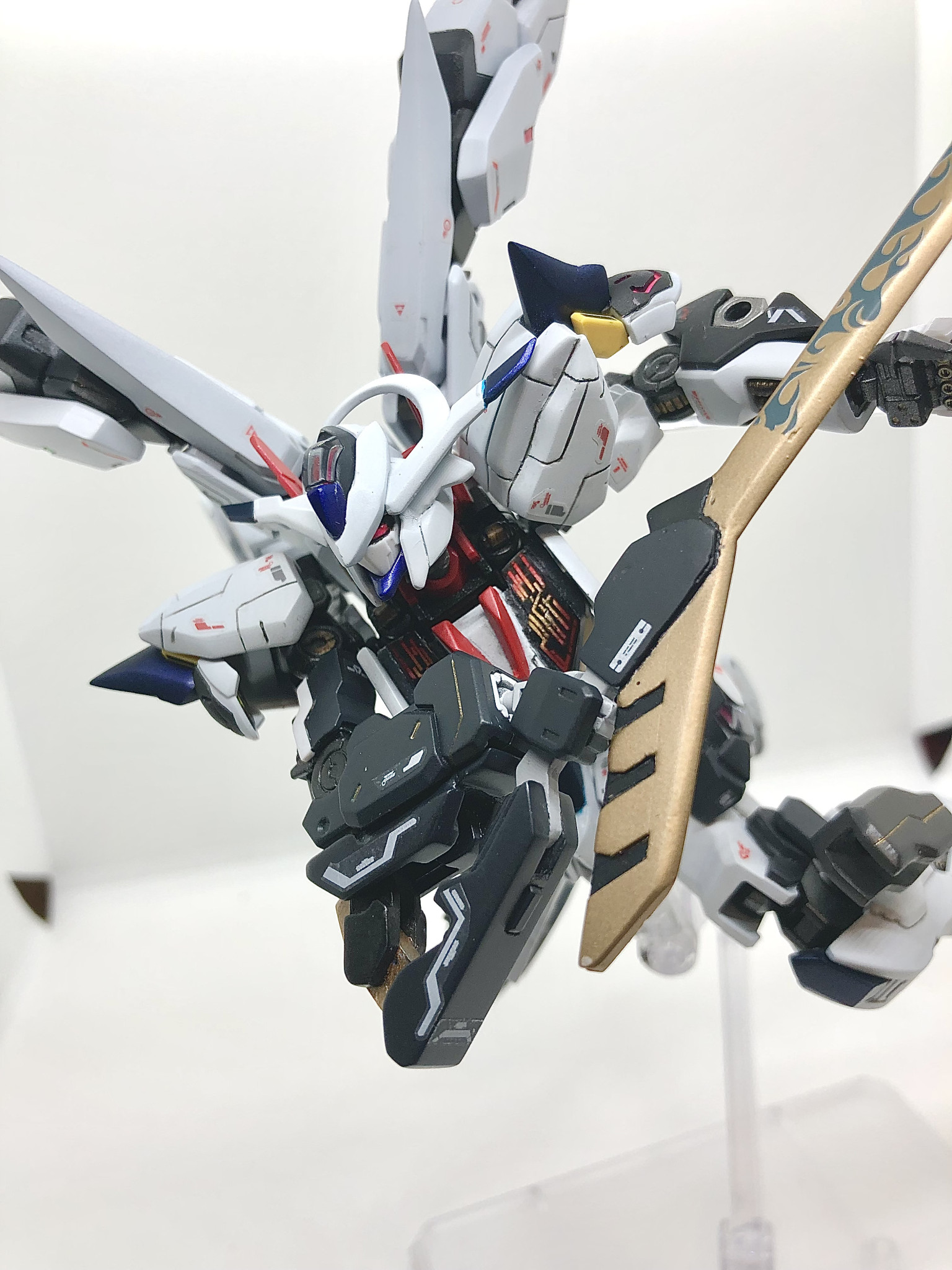 頭部とカラーリングがシュバルゼッテ、ガンビット展開時はエアリアル、戦法はファラクト、武器はキャリバーンと、水星ガンダムをバエルの元に集えた作品になりました。ガンビット展開は投稿者のパーメットスコア不足により叶いませんでした…接続を専用のものにしたのが悪手でしたね。