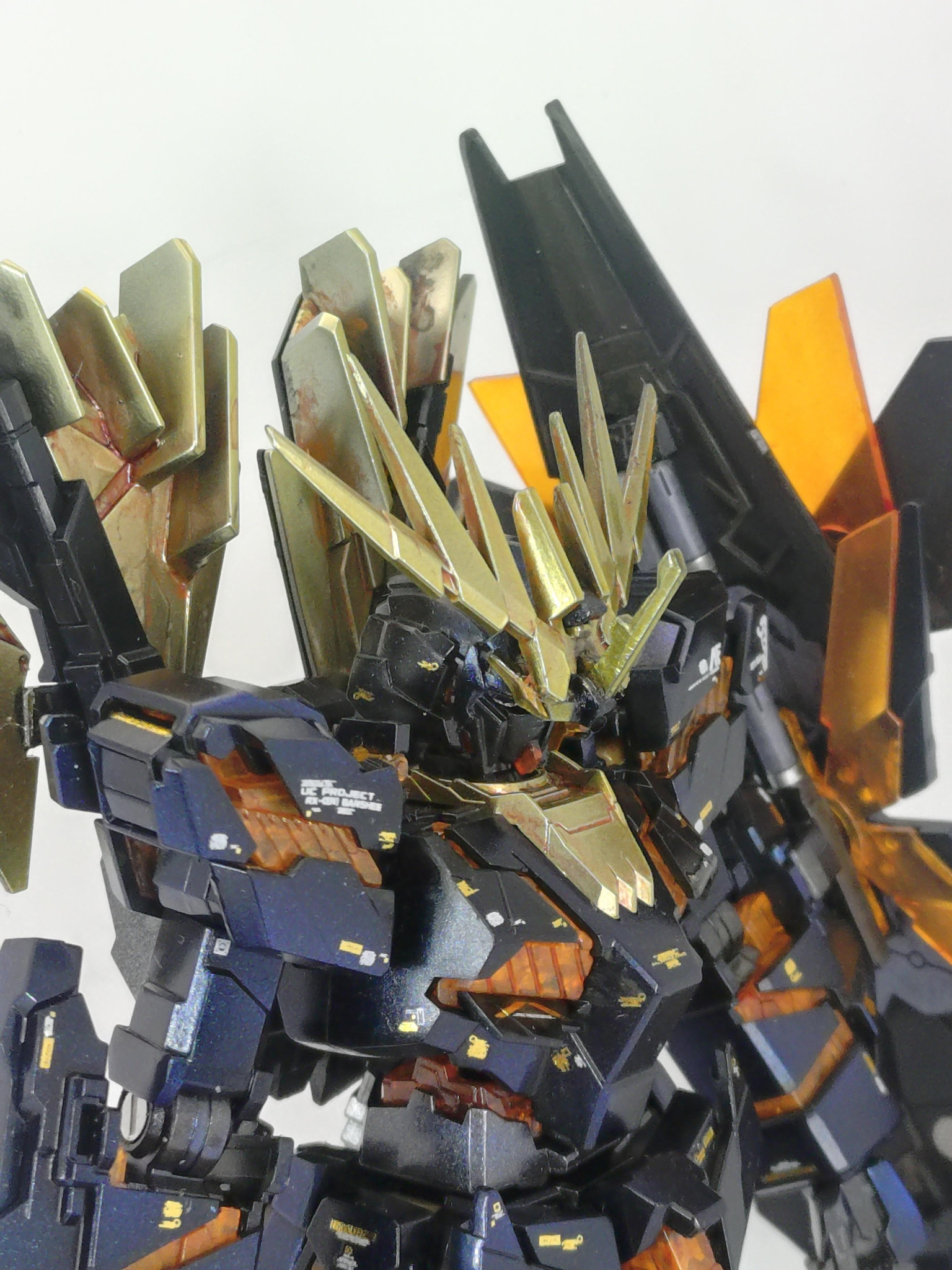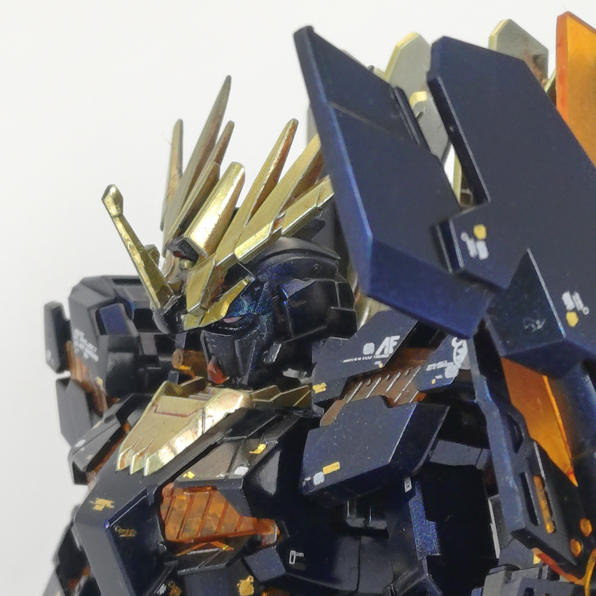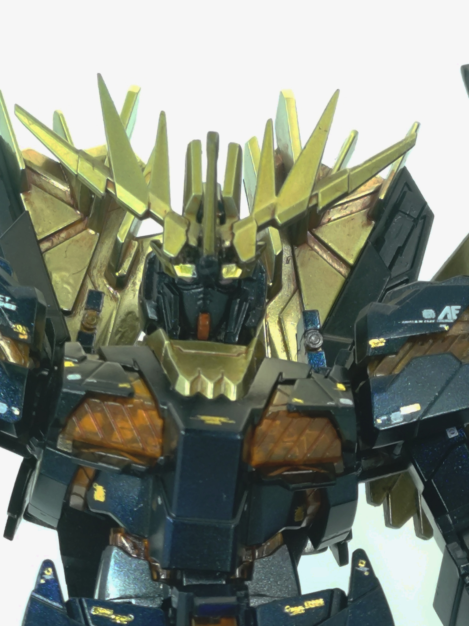 黒紺部分は黒下地にプリズムブルーブラック、エッジにMr.クリスタルカラーのサファイヤブルーを薄く吹きました。サイコフレーム部分は裏側をホワイトで塗って、表にクリスタルカラーのトパーズゴールドを薄く吹いてエナメルクリアーレッドで墨入れしました。