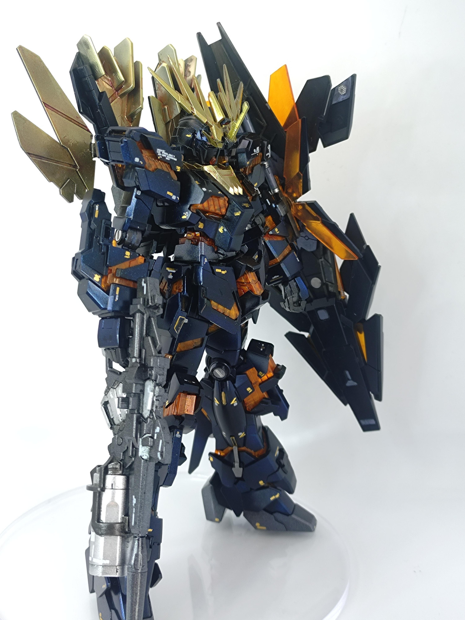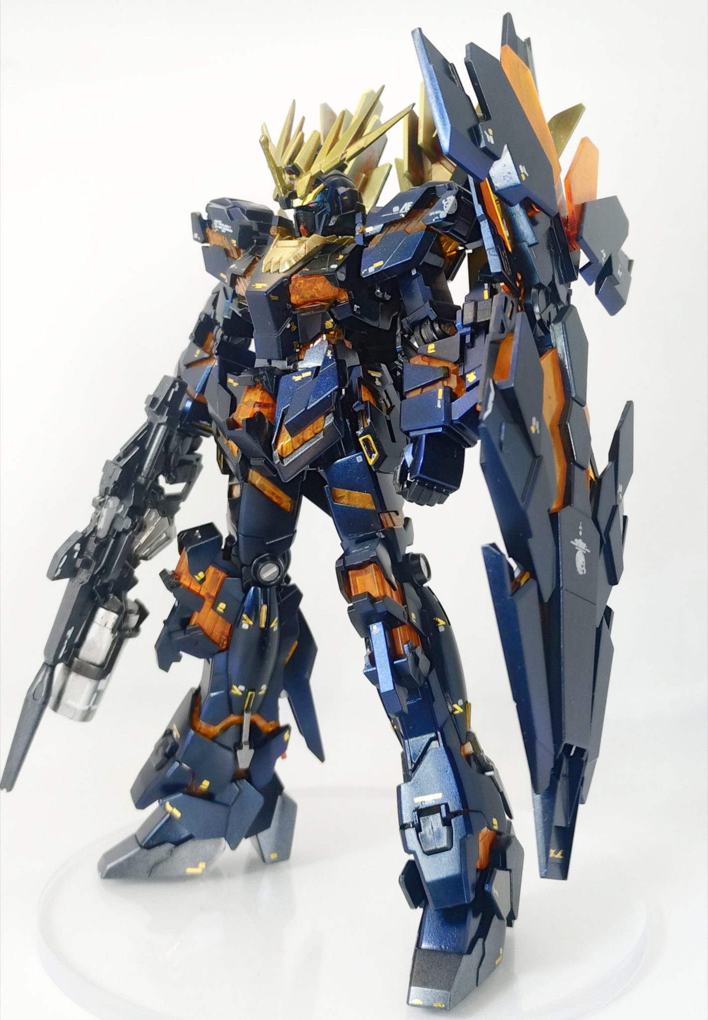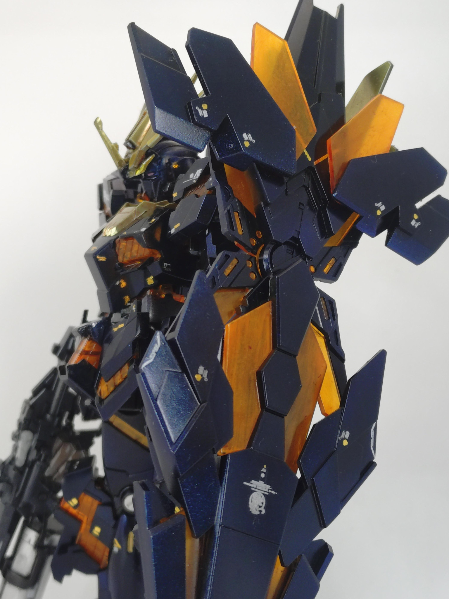 黒紺部分は黒下地にプリズムブルーブラック、エッジにMr.クリスタルカラーのサファイヤブルーを薄く吹きました。サイコフレーム部分は裏側をホワイトで塗って、表にクリスタルカラーのトパーズゴールドを薄く吹いてエナメルクリアーレッドで墨入れしました。