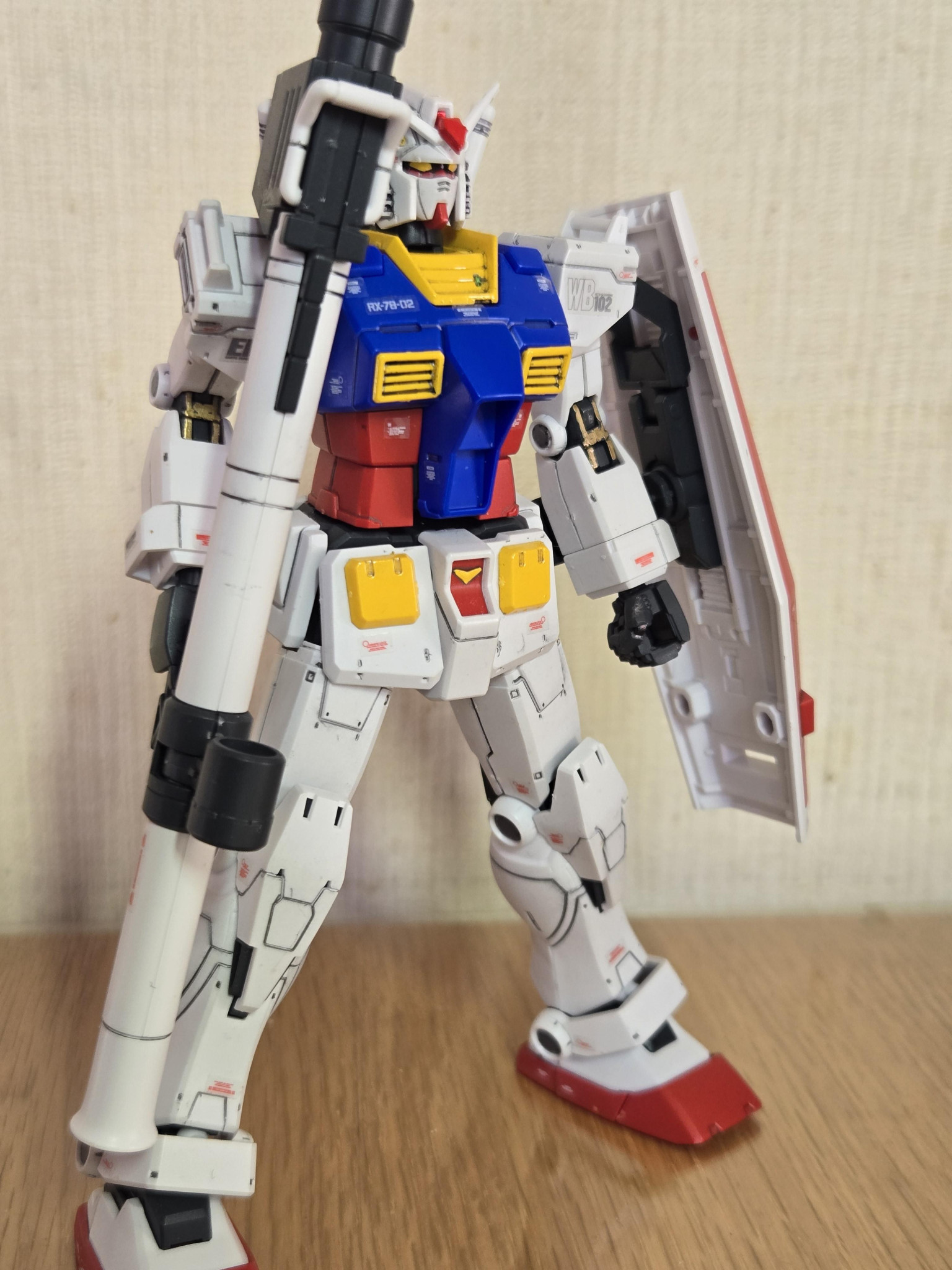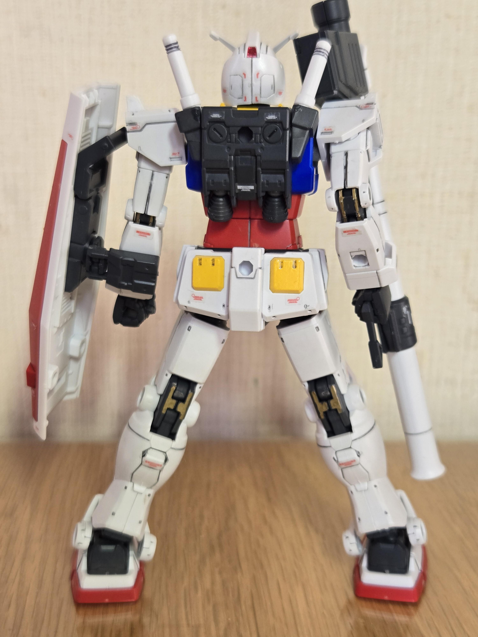 全塗装してスミ入れをしてあります。付属しているデカールも貼りました。このカラーリングは如何にも主役MSというイメージです。バズーカは大きくて破壊力がありそうです。