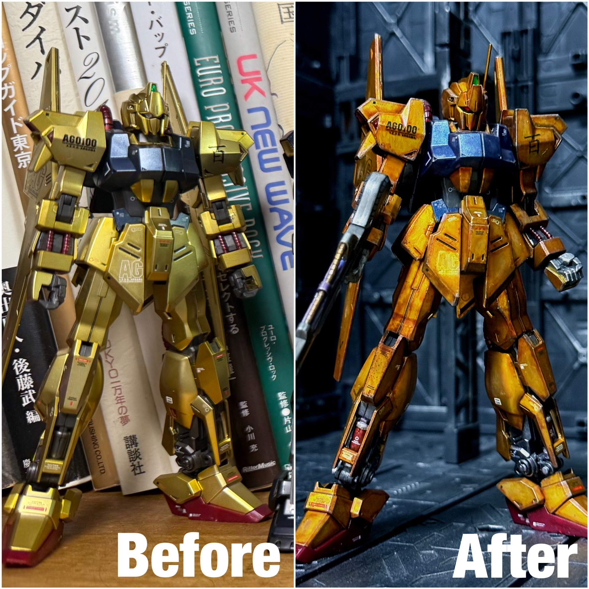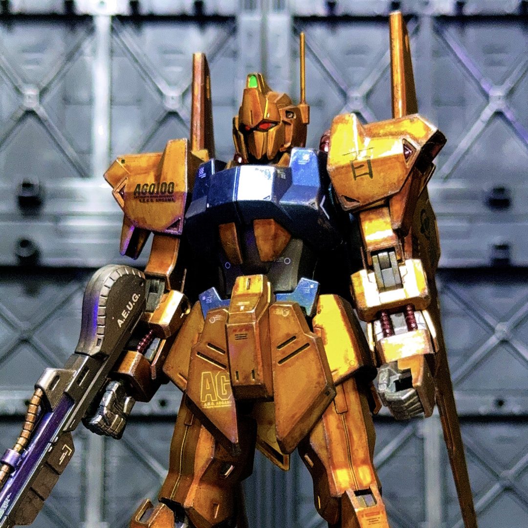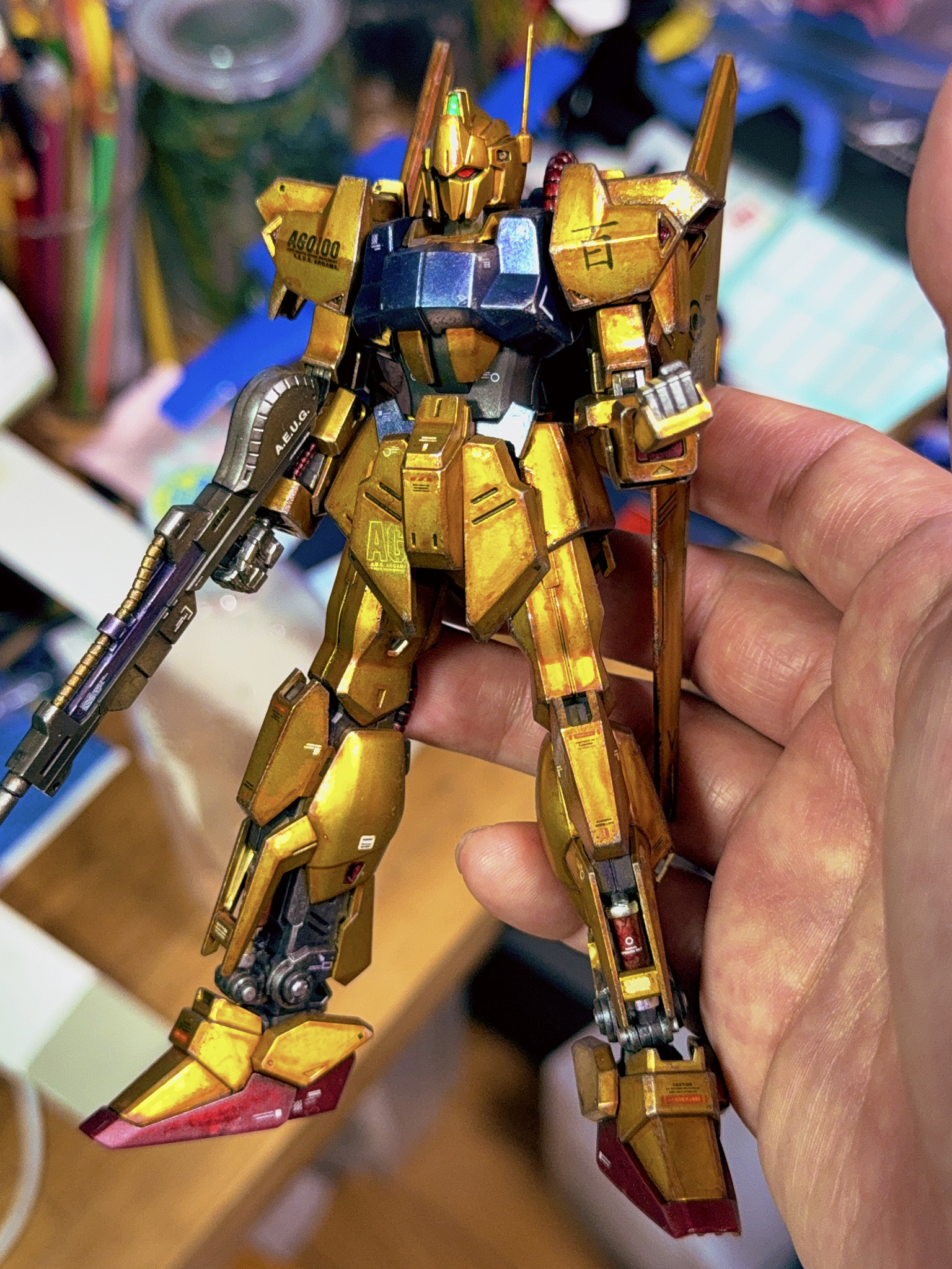 成型色がきれいなので、デカール貼ってきれいな百式のままでいいかなと放置してましたが、ふと衝動にかられて手を入れてみました。ゴールドのギラつきを維持したままどう汚しを入れるか悩んで、結果イメージに近い表情になったかなと思ってます✨