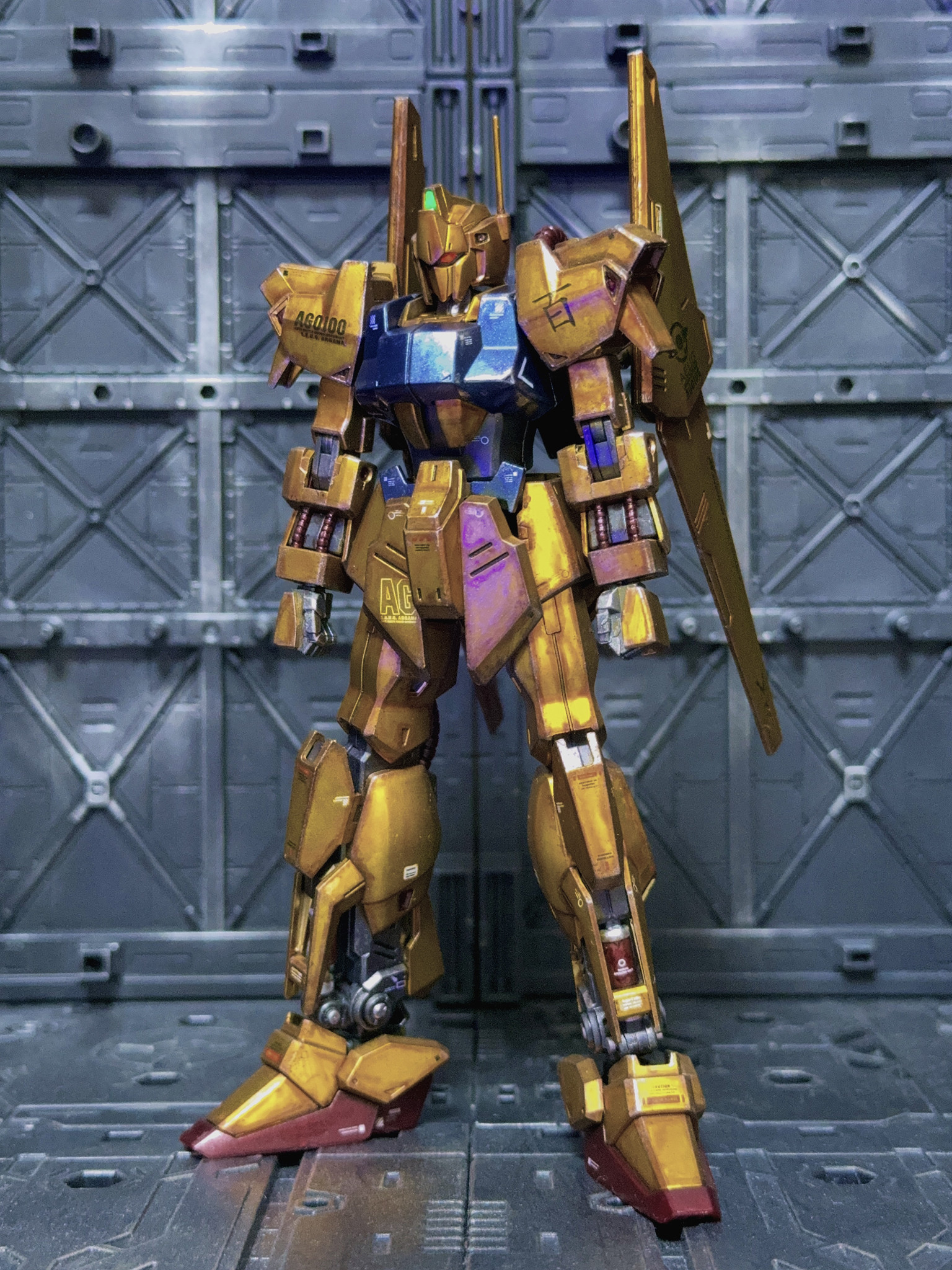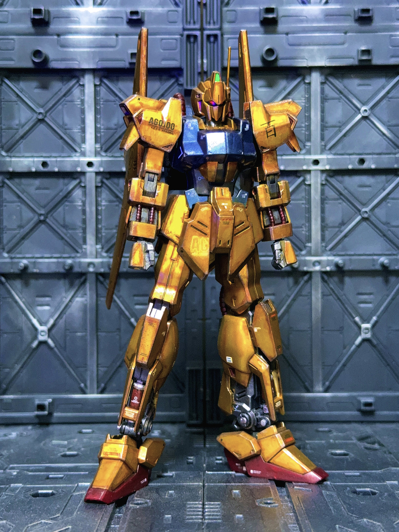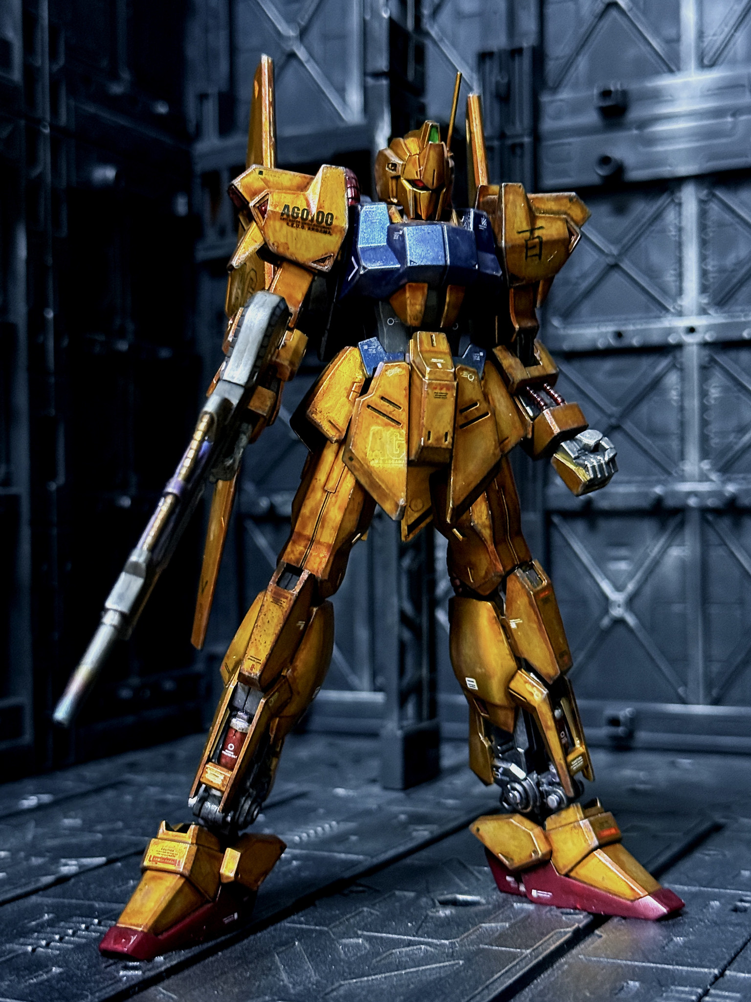 原作で百式は、地球上でも宇宙でもかなり酷使されてるイメージなので、ゴールドの輝きは残しつつ、サビやススをまとったZ終盤のコロニーレーザー決戦前の設定をイメージして仕上げてます。