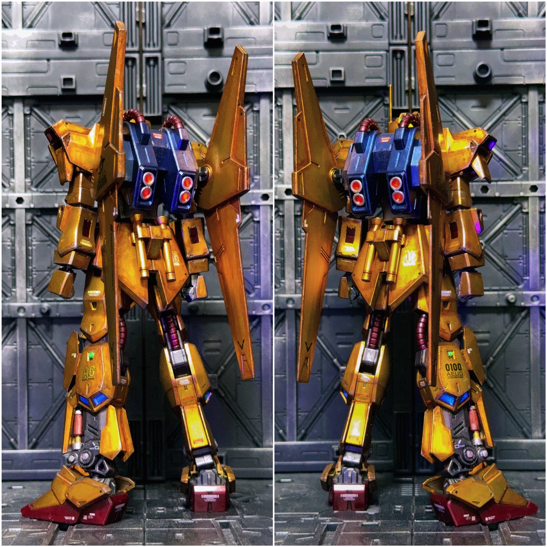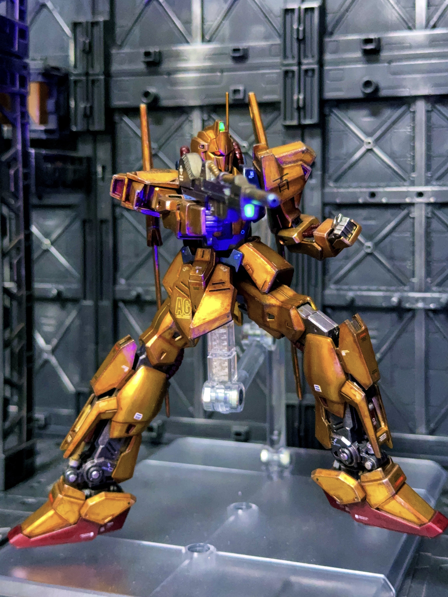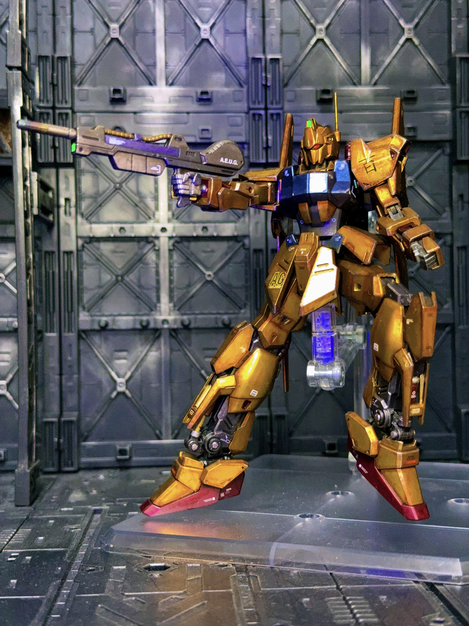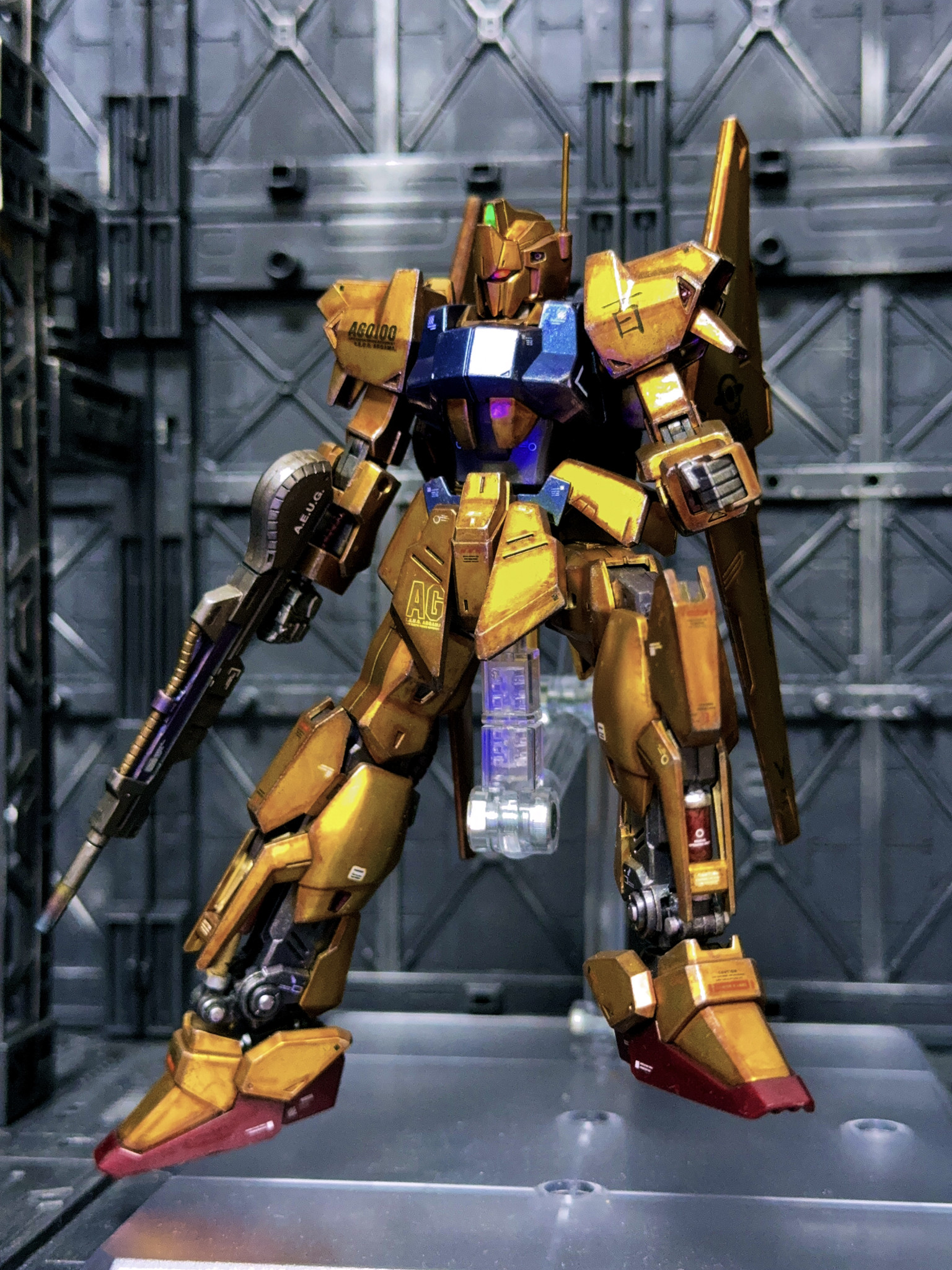 原作で百式は、地球上でも宇宙でもかなり酷使されてるイメージなので、ゴールドの輝きは残しつつ、サビやススをまとったZ終盤のコロニーレーザー決戦前の設定をイメージして仕上げてます。