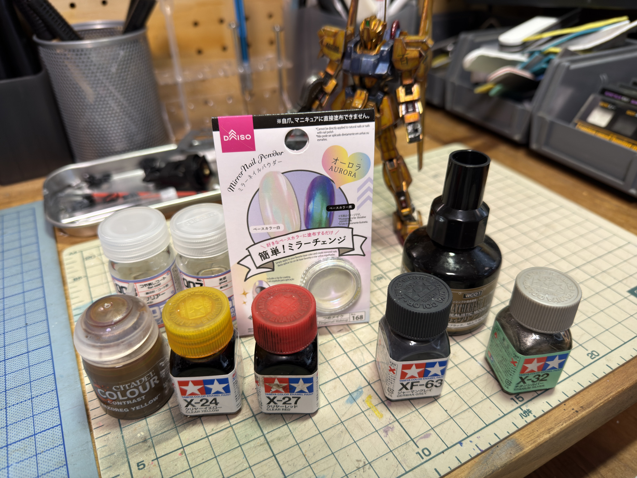 成型色の上から透明クリア光沢とつや消し混色した半光沢に100均ミラーパウダーを加えてエアブラシして偏光塗装
