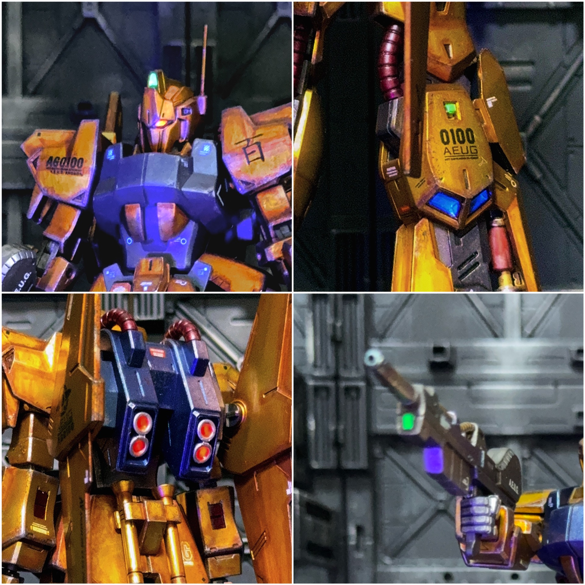頭部ツインアイ・センサー、ふくらはぎスラスター内部、バックパックバーニア内部、ビームライフルセンサー部にエナメル蛍光塗料を塗ってます。またあらかじめ蛍光塗料を塗った蛍光チップをふくらはぎのモールド部に仕込んでみました。