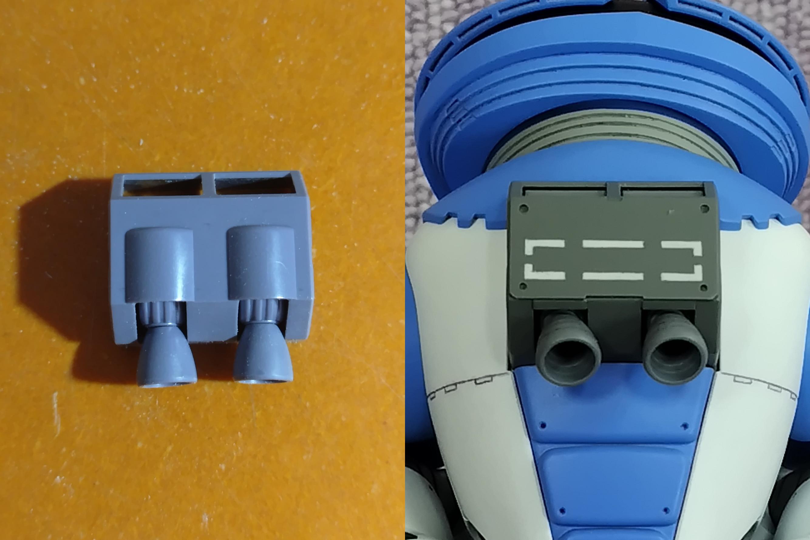 全体的な形状は弄っていませんが、ゲームのアッガイはバックパックが平たいので、左画像にある半円筒の部分を削ってプラ板を貼りました。