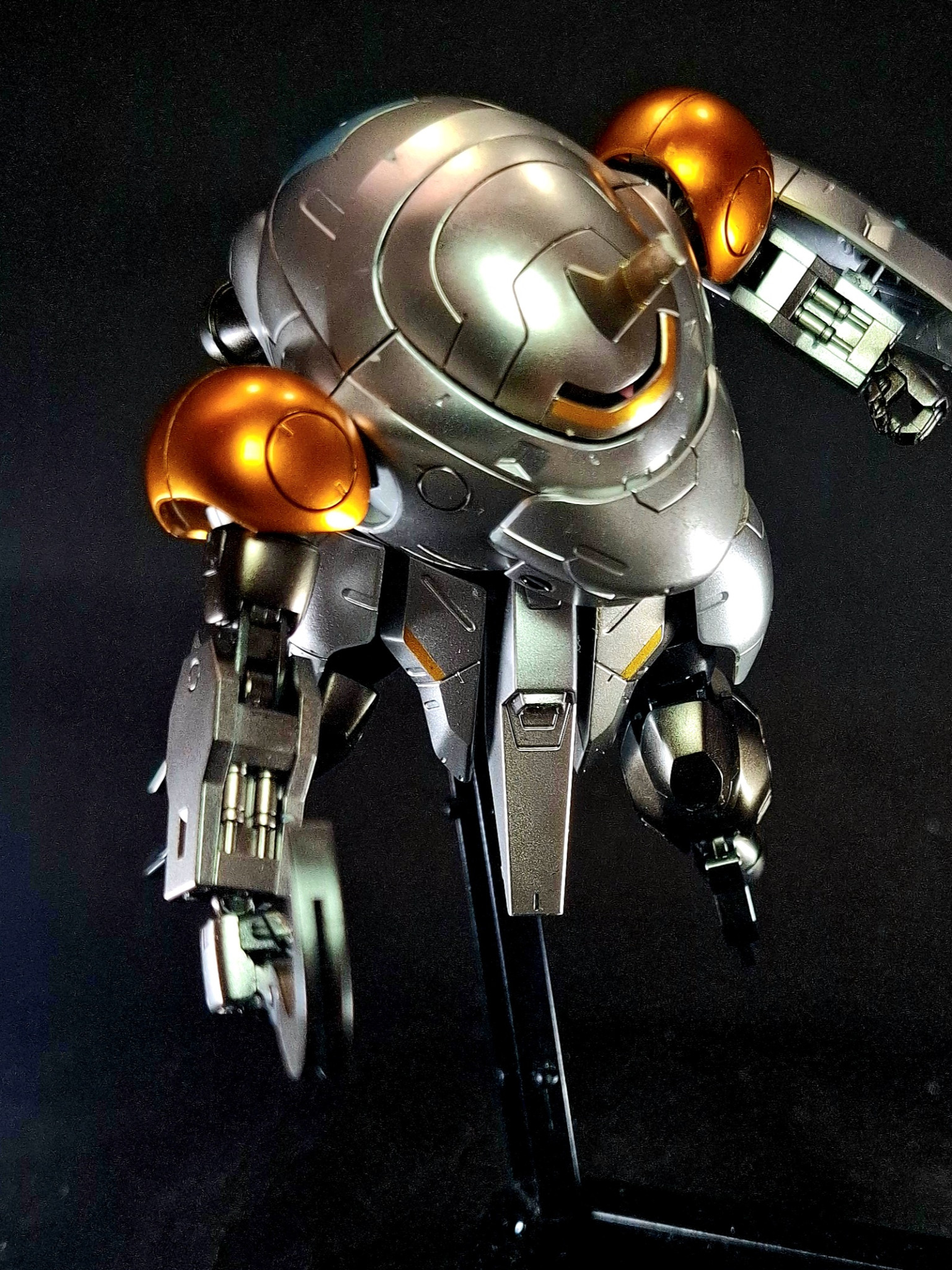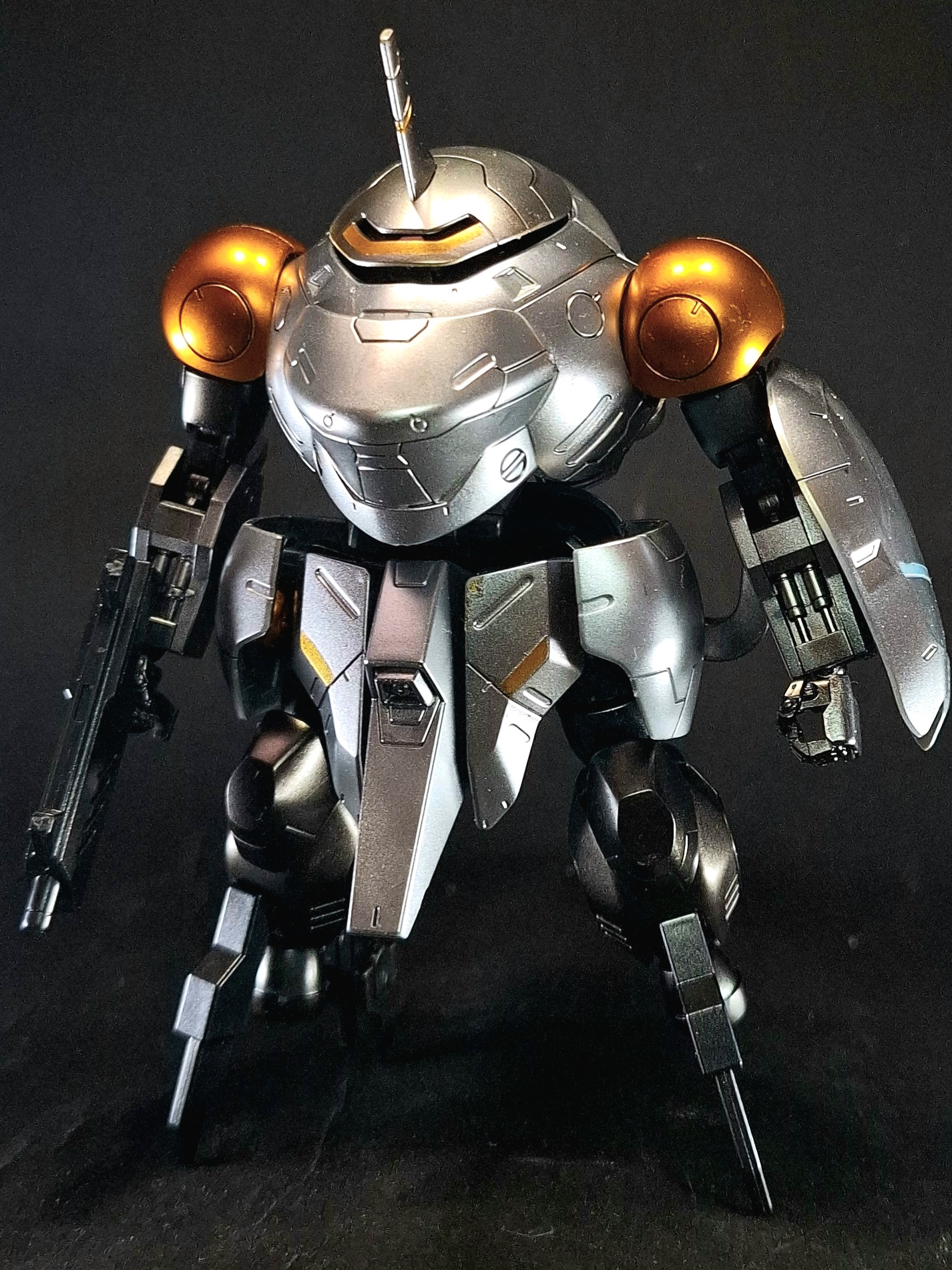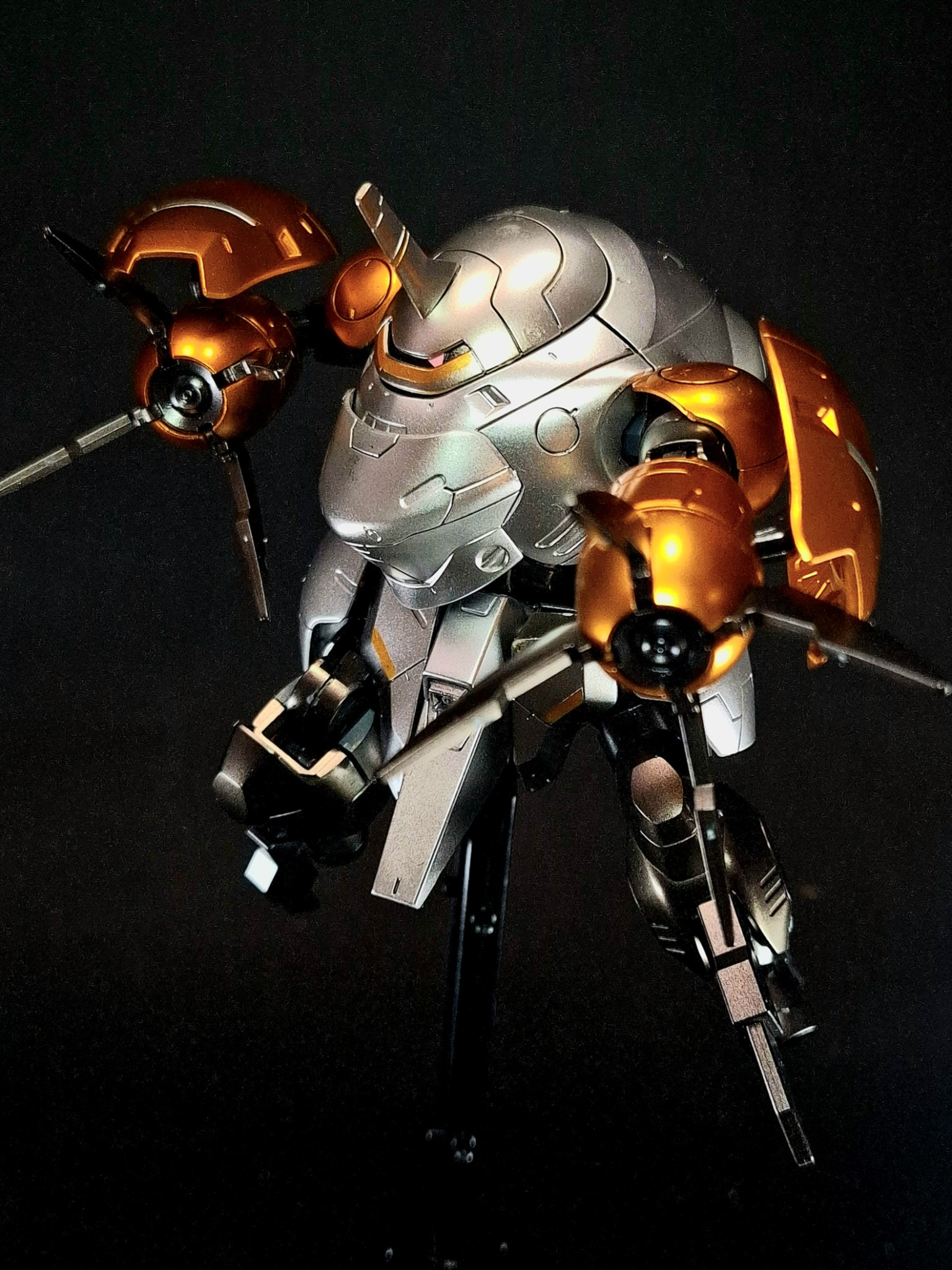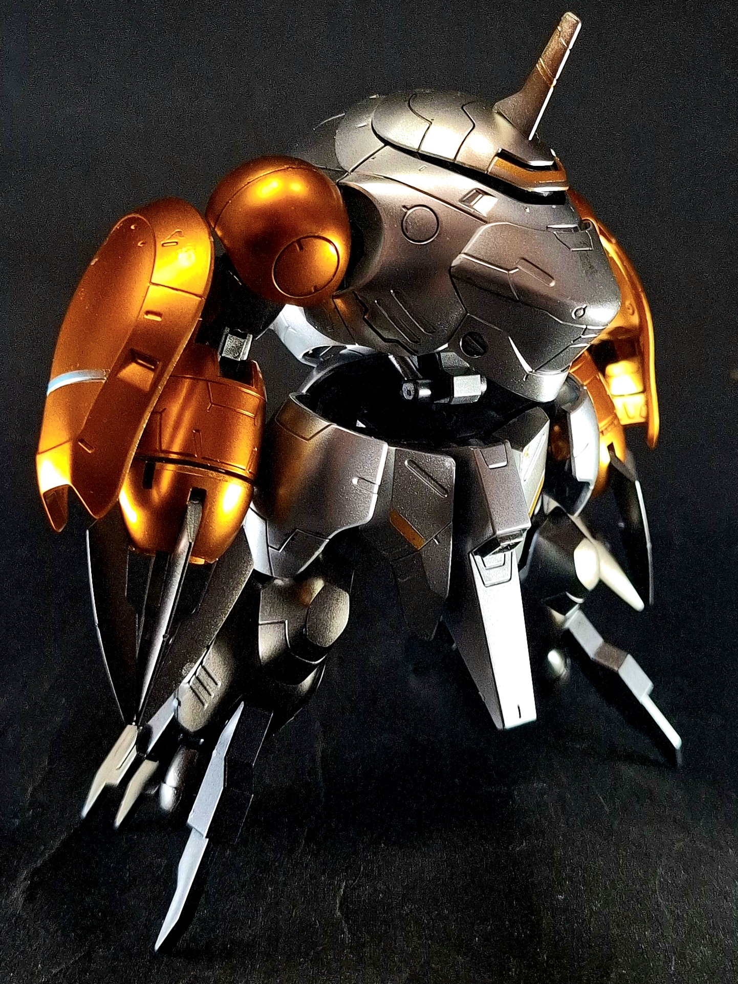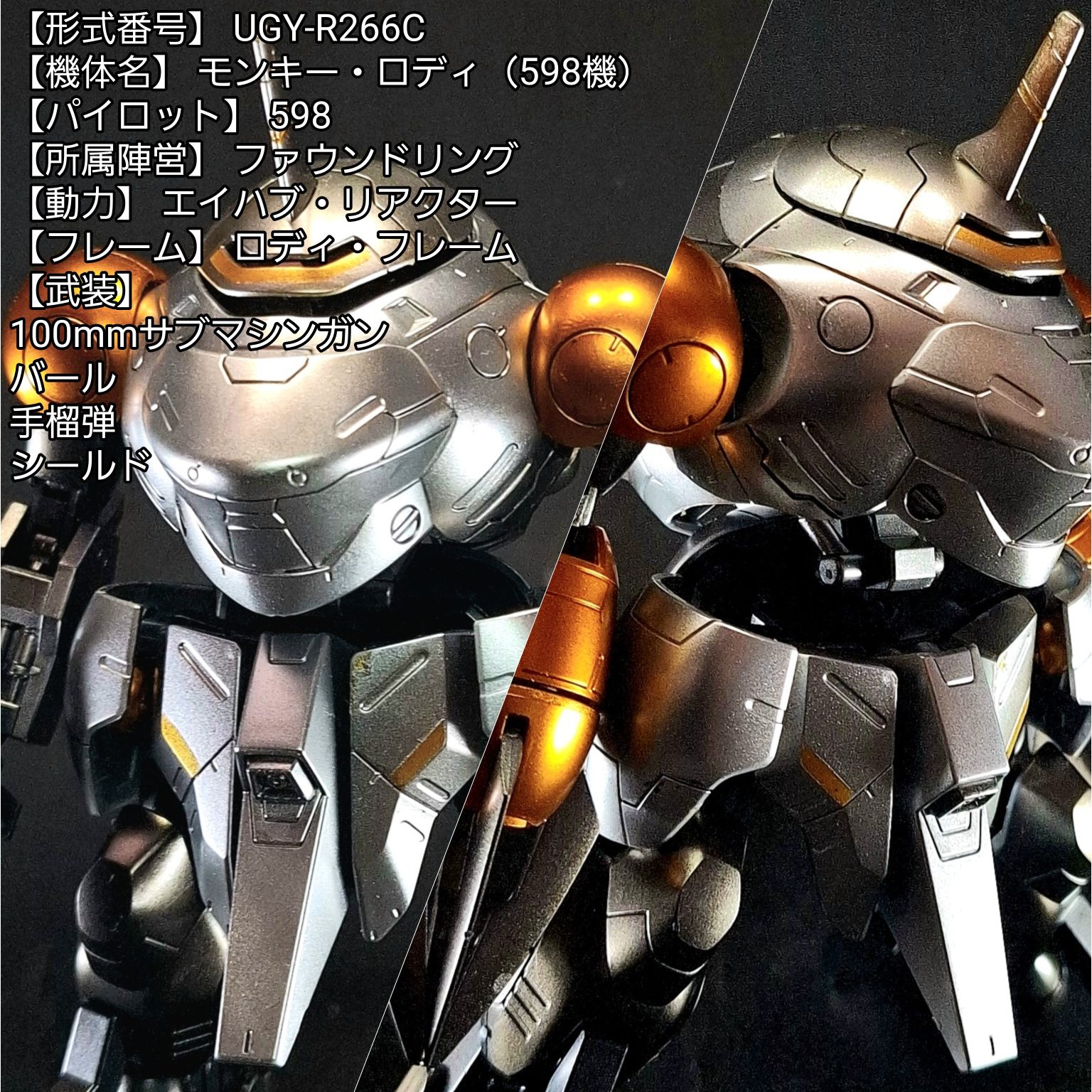 ファウンドリングの598が使用する隊長機は頭部の角とオレンジショルダーが特徴的で、角のオレンジ色の部分には鉄華団のマークが描かれている。
