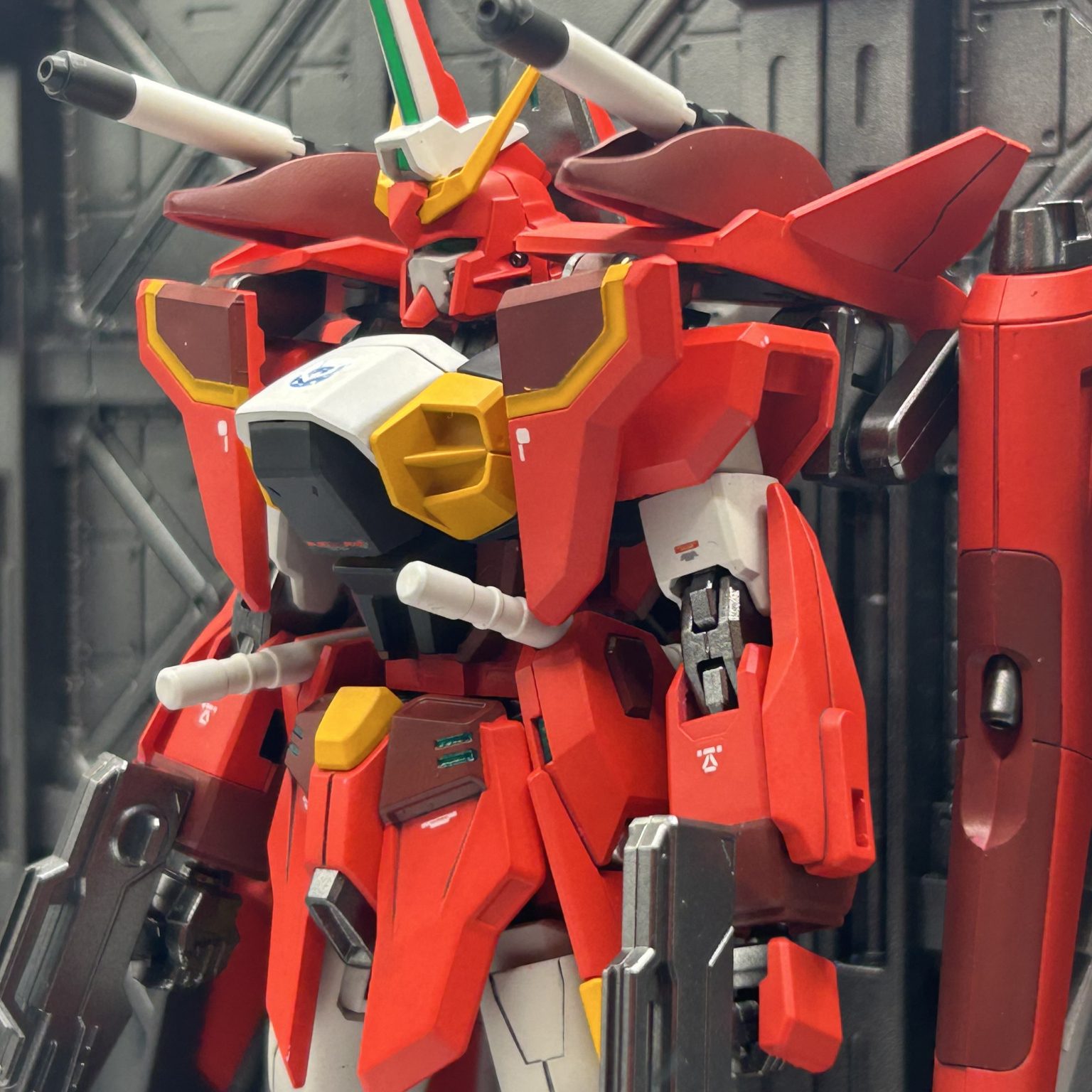 カラーリングは迷いましたが、様々な方の作品を参考にしながら、見た目がSEED機体寄りなのでカラーリングはエアマスターチックにしてみました。