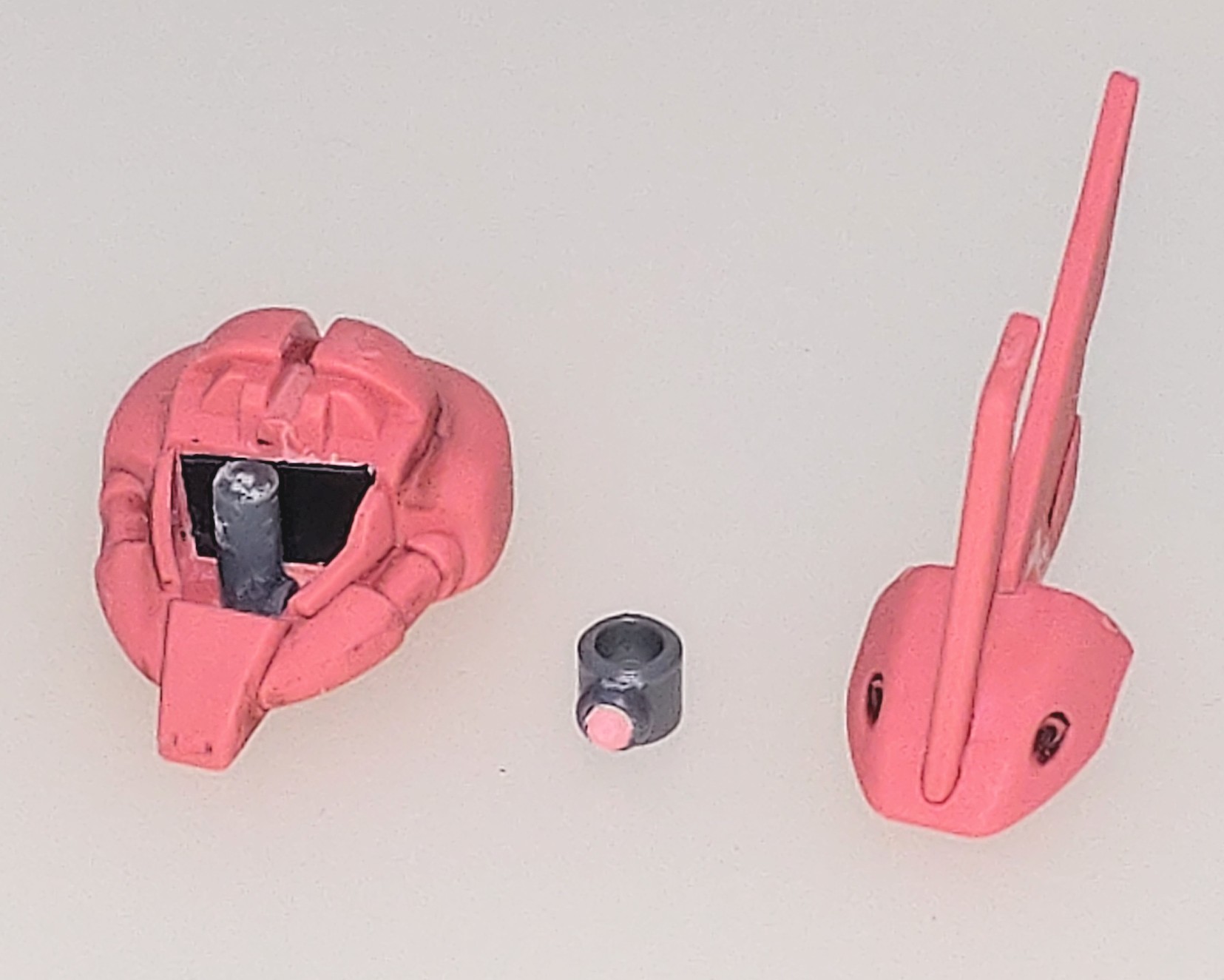 合わせ目消しを行った後にモノアイの可動を追加しました。主にコトブキヤのモビルパイプ・Hアイズの組み合わせです。またひさし部分もモノアイが収まるように内部を削り込みました。
