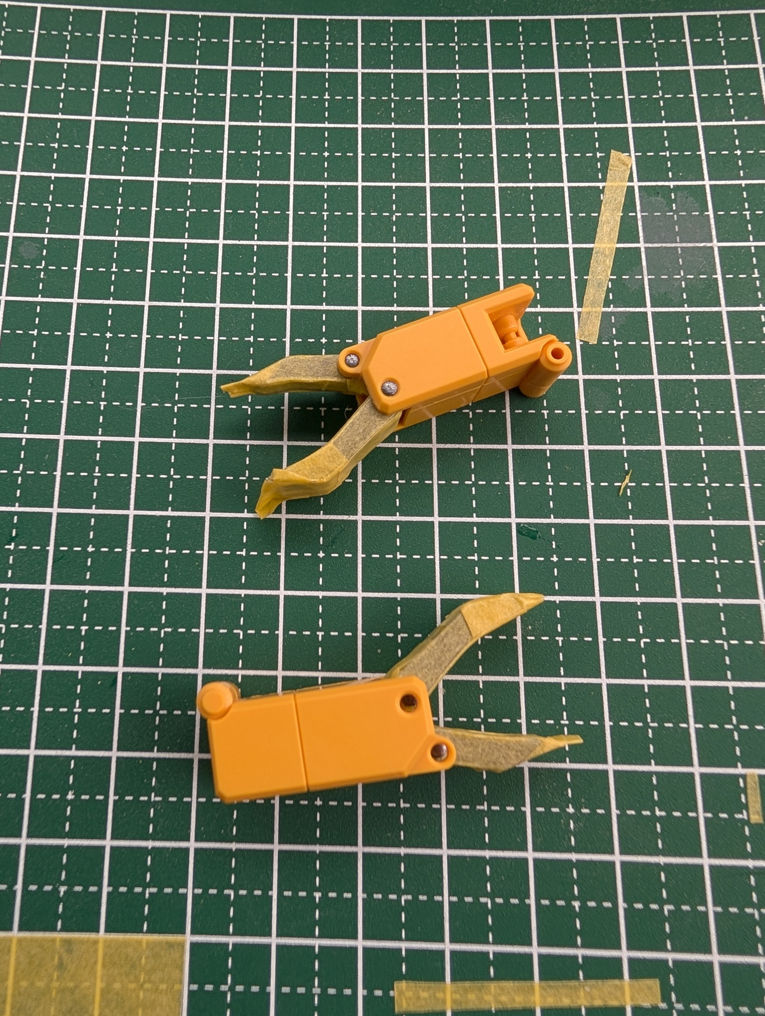 腕は後ハメが無理そうだったので爪を塗ってから処理しました。肩も同様にマスキングしてから挟み込んで処理しました。足はピンをギリギリまでカットして後ハメできました。
