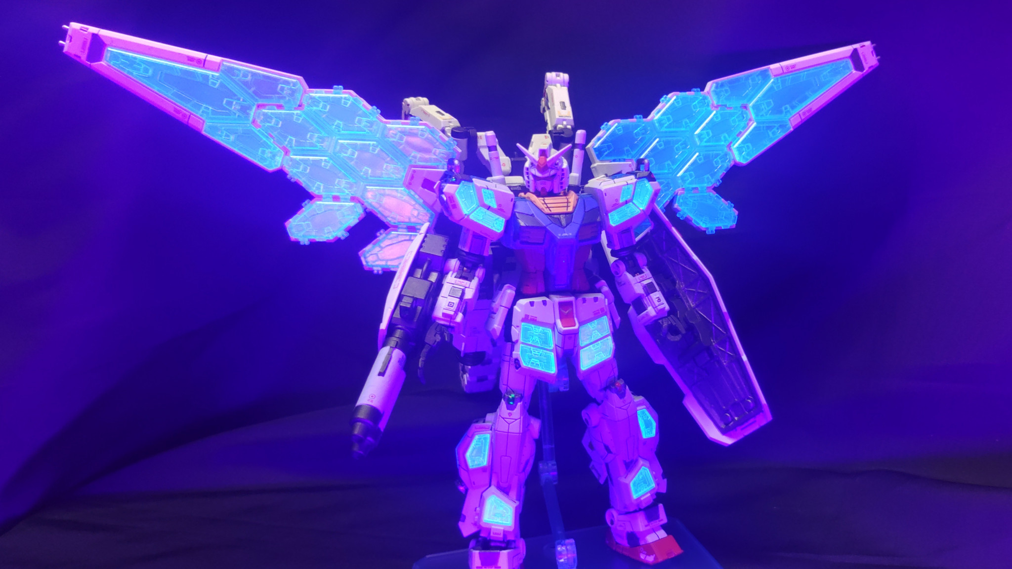 グラスフェザーユニット発光状態 いつも通りクリアーパーツは蛍光色で塗装していますので、ブラックライトで発光状態に出来ます。