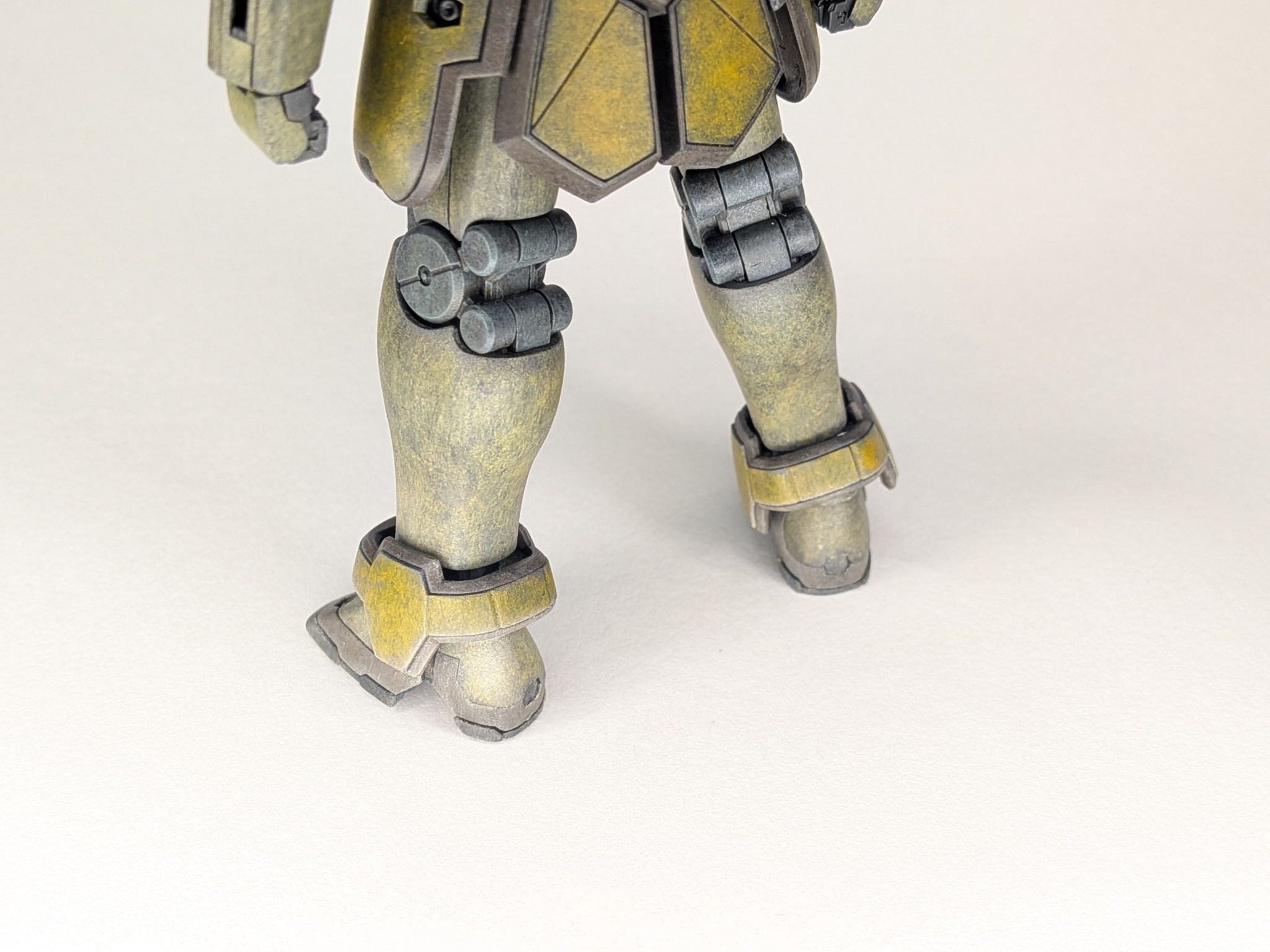 また砂漠地帯での活躍が印象的な機体なので、足、下脚の裾、アンクルガードなどにはタミヤウェザリングマスターAセットのライトサンドを擦り付けてウェザリングしました。