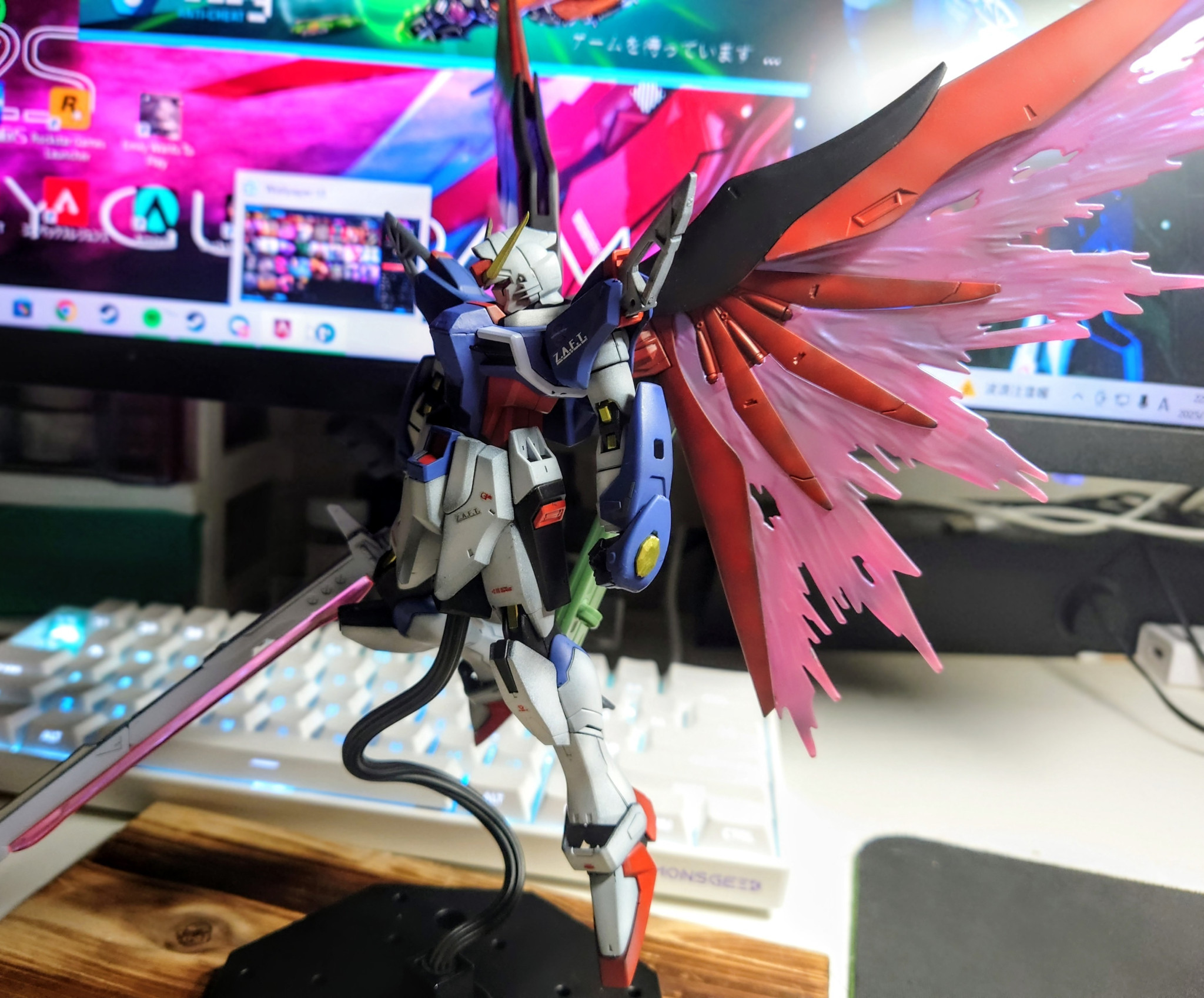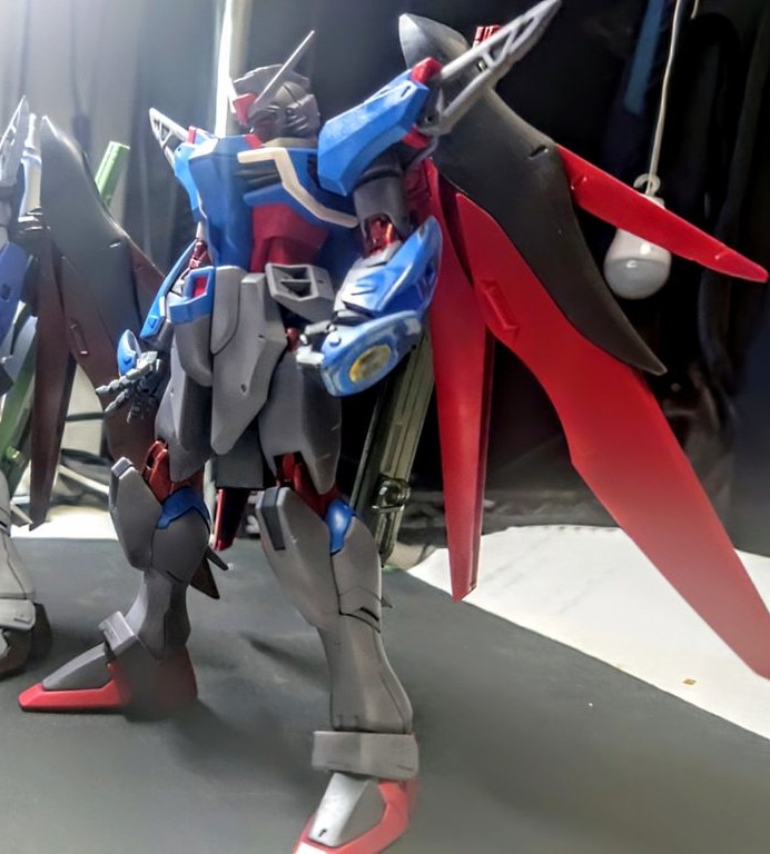 フリマサイトで購入したデスティニーガンダムを黒立ち上げ塗装で全塗装してみました。武装はビームライフルとシールド、フラッシュエッジエフェクトなどが付いてなかったです。光の翼はメカサフに白を混ぜたものの上からガイアノーツのチェリーピンクブルーを使いました。