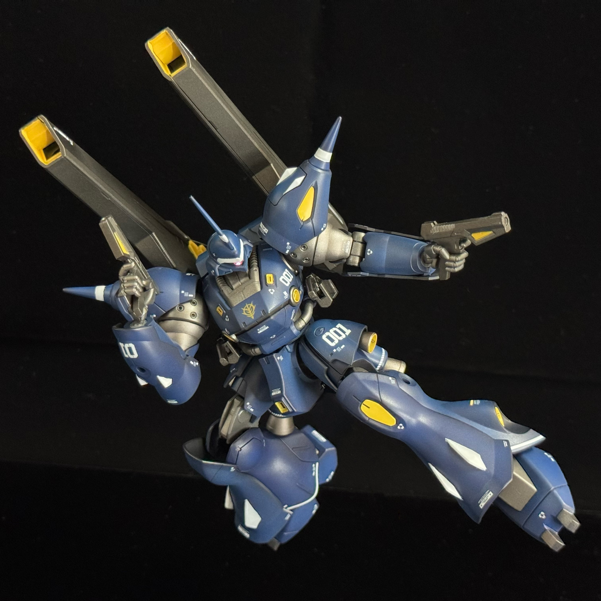 おそらくこれで通常版のケンプファーを新たに手に入れることはもうないと思うので、塗装前にわざわざバンダイのケンプファー調色表を探し出し、MGケンプファーのパッケージアートのような淡いブルーで塗るつもりでした。……ところが、いざ塗ってみたら、結局いつものように濃いめの「ケンプファーアメイジング色」に。いったいこれで何度バンダイに裏切られたことやら(zaku-kao4)。