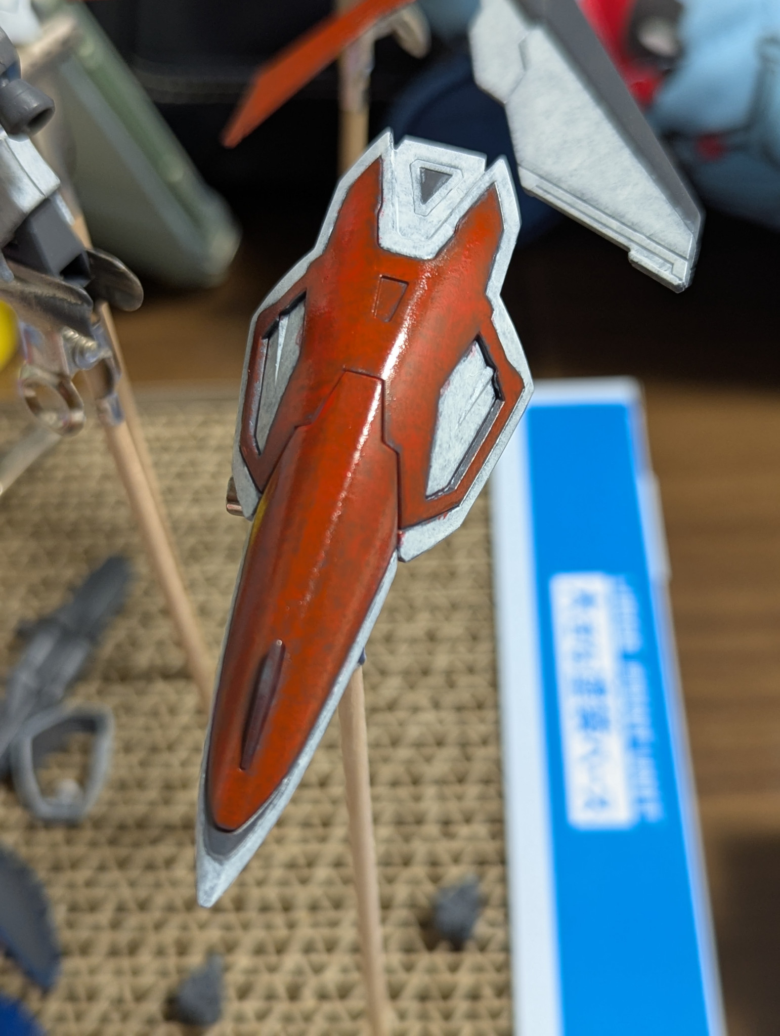 羽の赤部分の中にある白い塗り分け、ミスって赤一色にしちゃって後から白重ねたんですが、そのせいでここだけ赤いスミ入れが…🤣