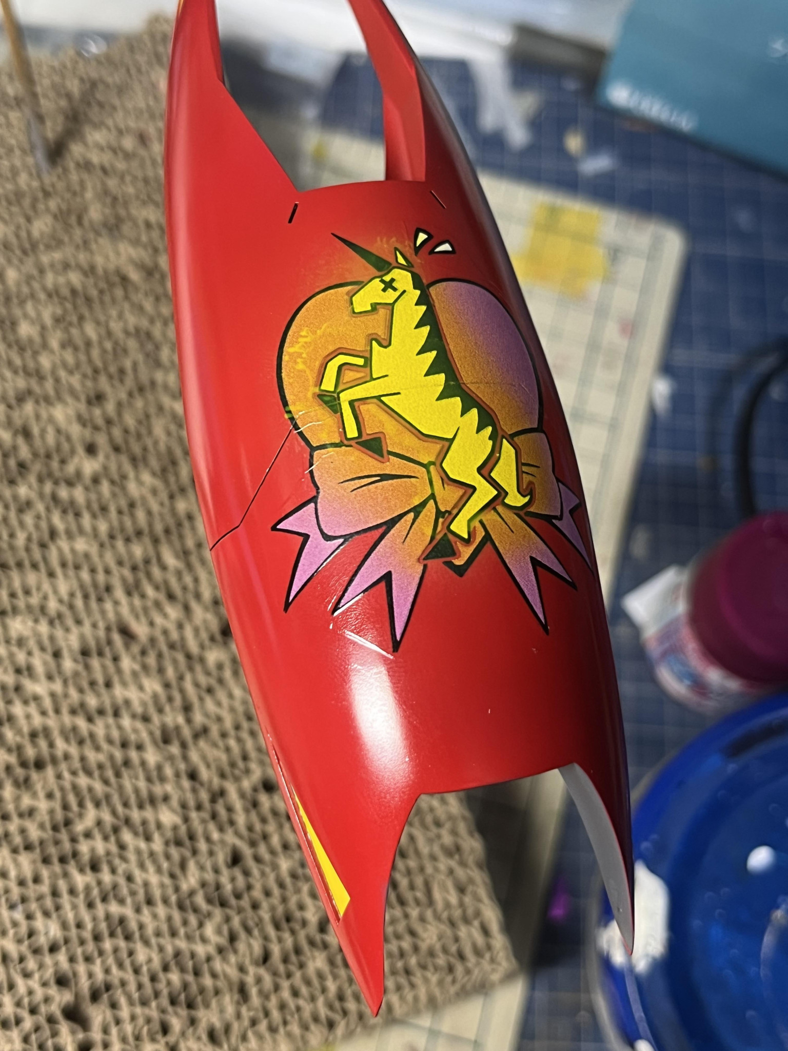 デカールは2枚重ね貼りしましたが、それでもユニコーンの黄色の発色が物足りなかったので、水性ホビーカラーを吹いてはみ出しは拭き取り。