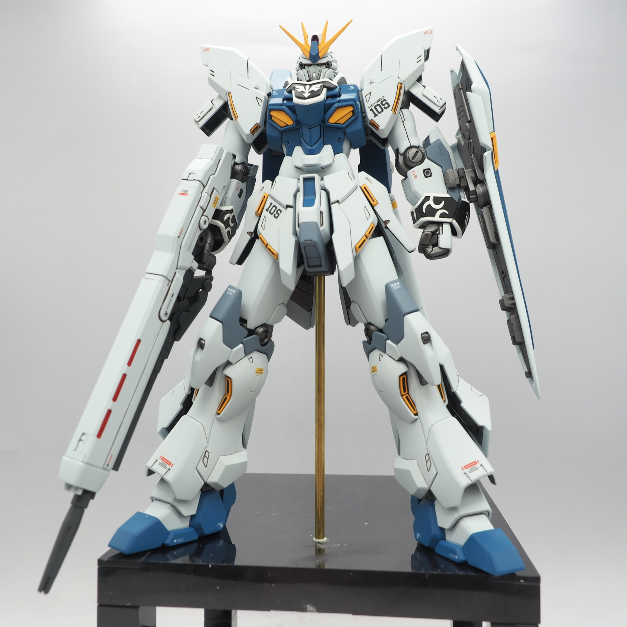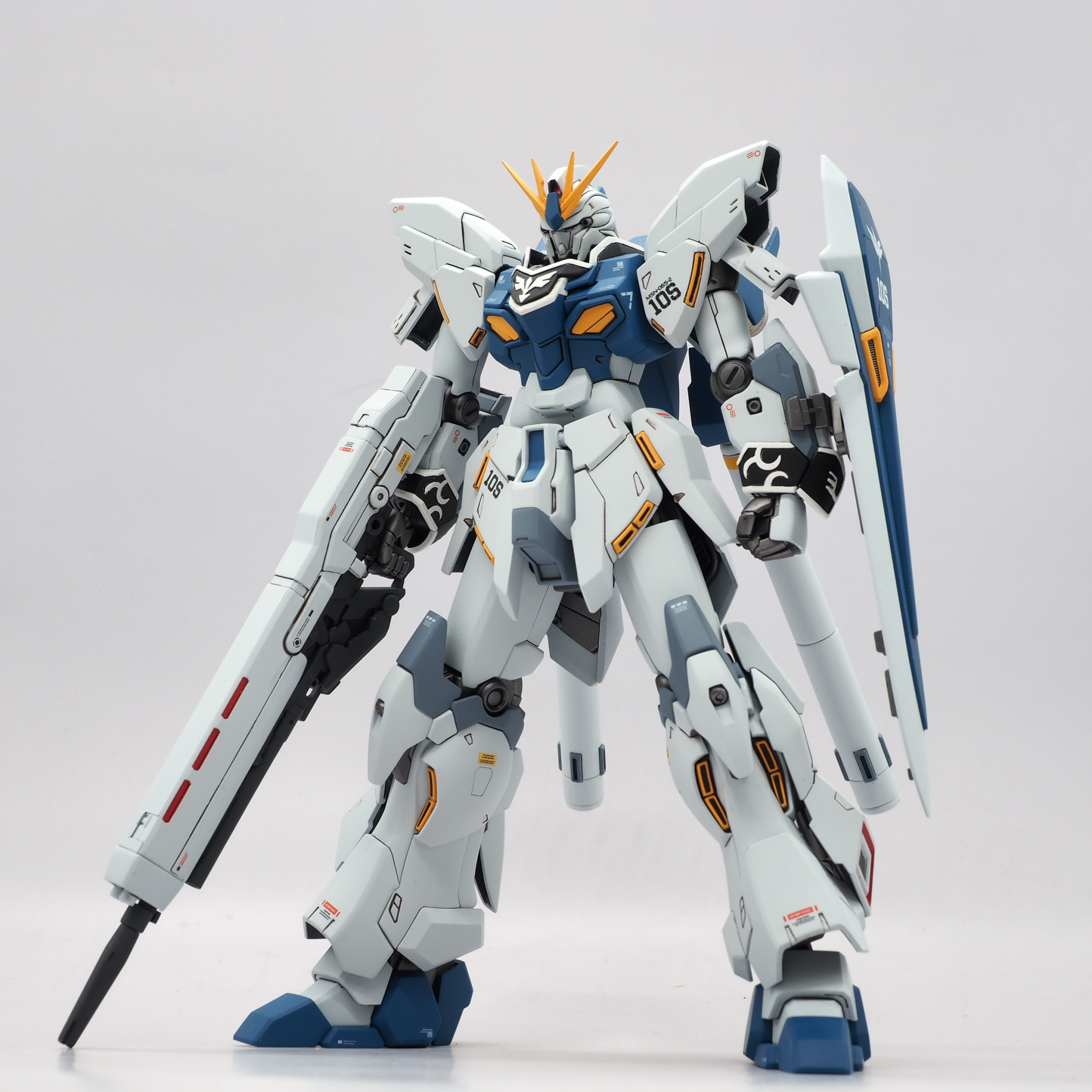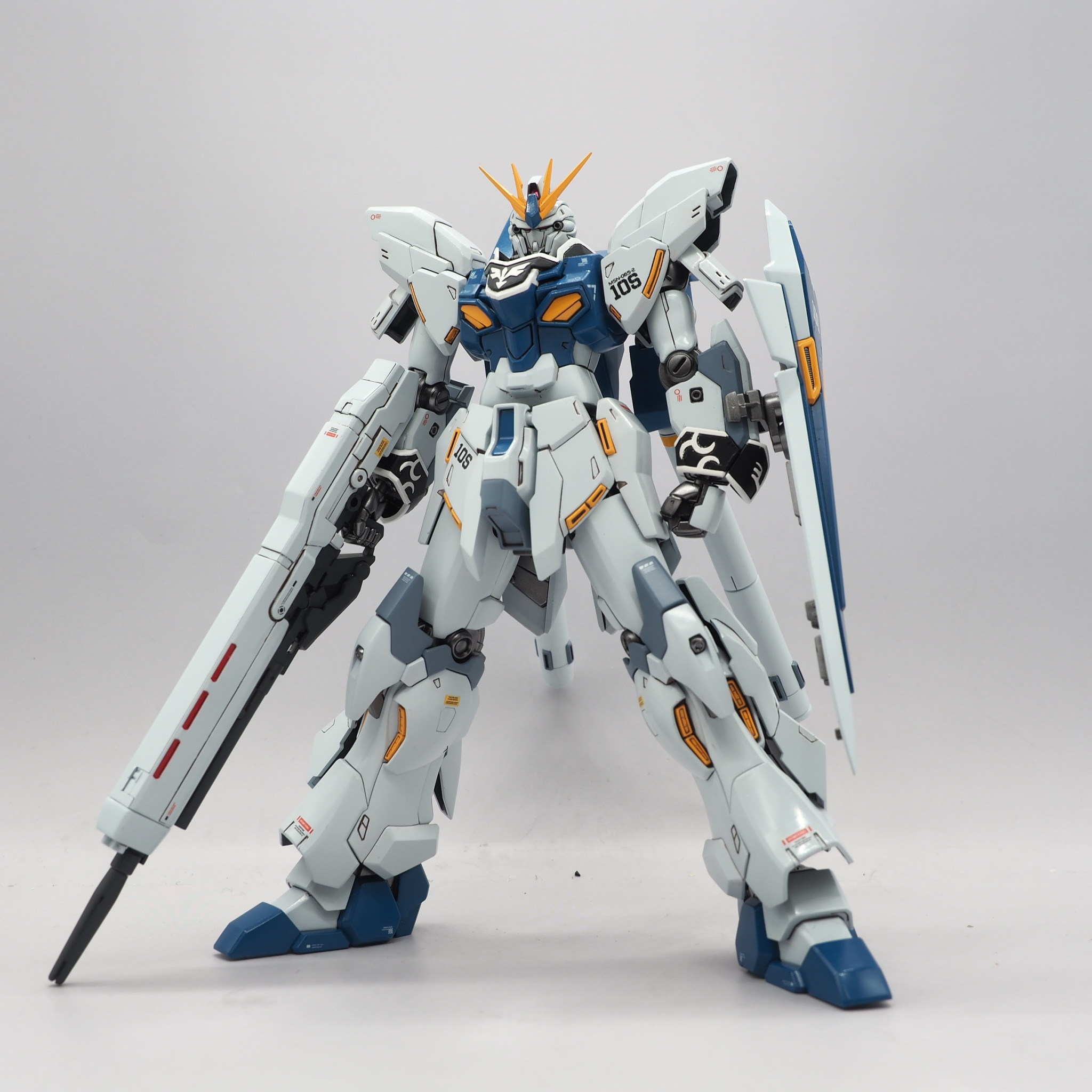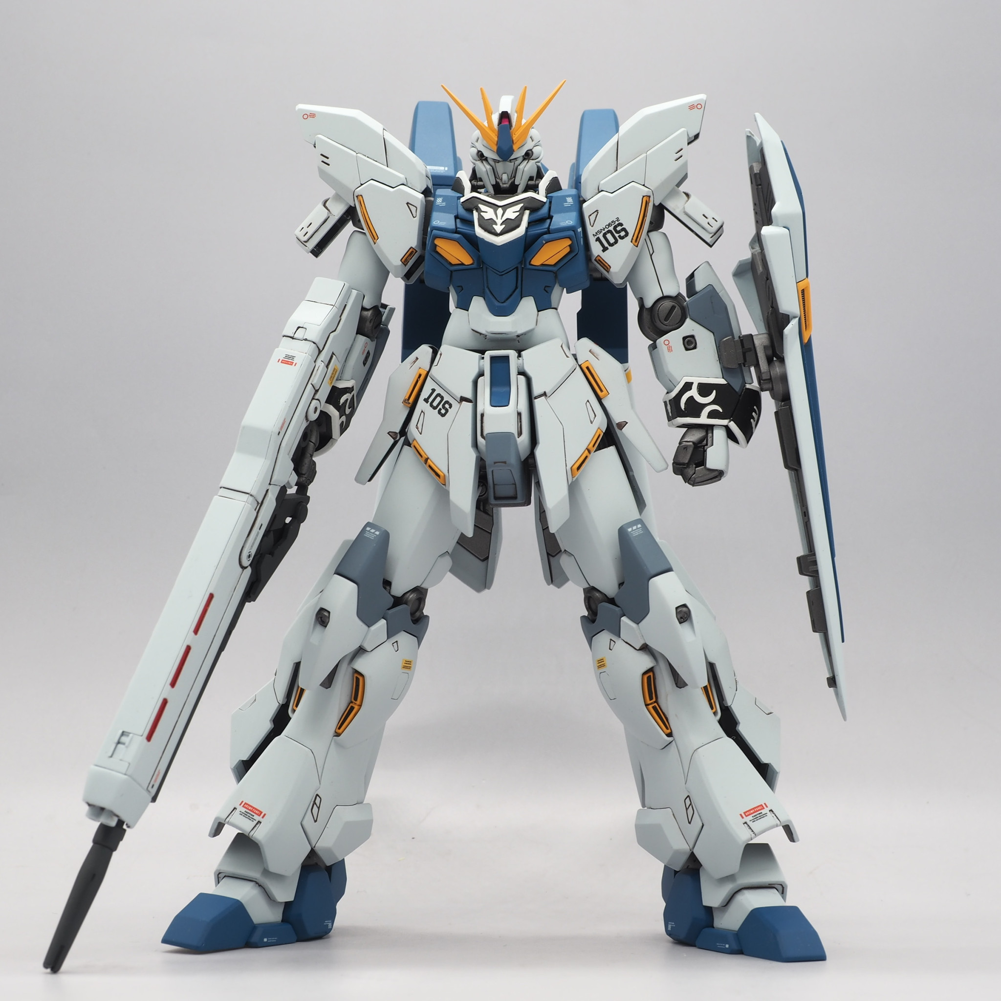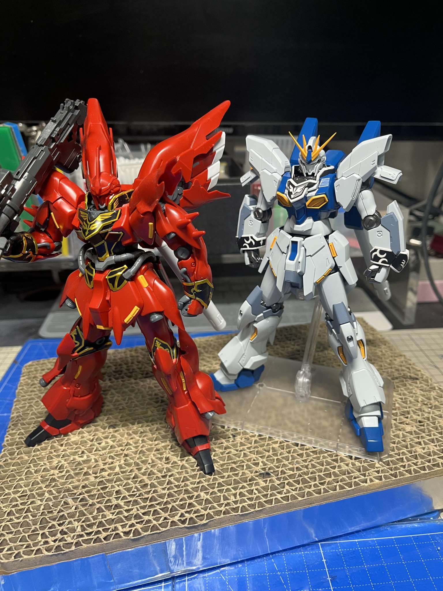 νガンダムと並べてみると似てるとわかりますね。 νガンダムは親戚とシナンジュは兄弟、と言ったところですね