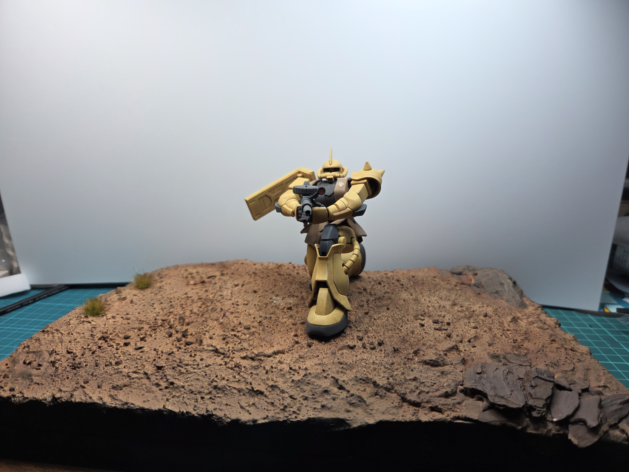 ジオラマの地面の色に近い色をウェザリングカラーで調色して、わからないくらい軽くウォッシングをしてからつや消しを吹いてます