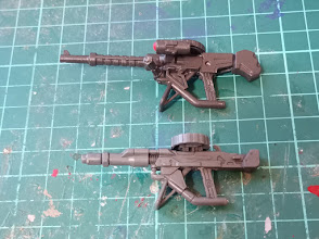 ちょっと体が大柄になったのに合わせてハイザックのマシンガンを改造して大きくしました。(下はザク付属のマシンガン)