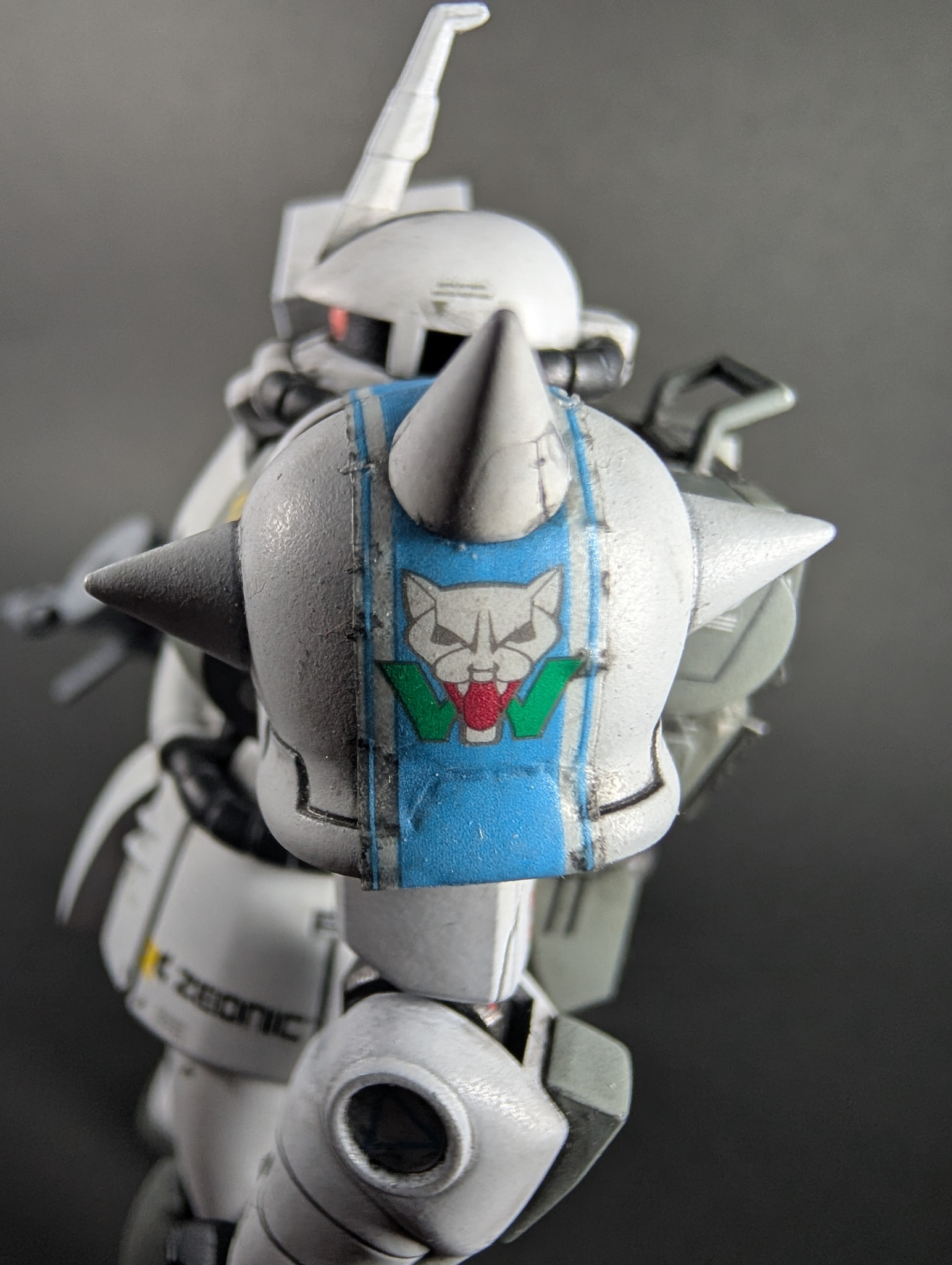 昔、シン・マツナガ機を再現しようと旧キットの高機動型ザクの黒いパーツに必死こいて白を塗りたくった記憶が…(zaku-kao4)