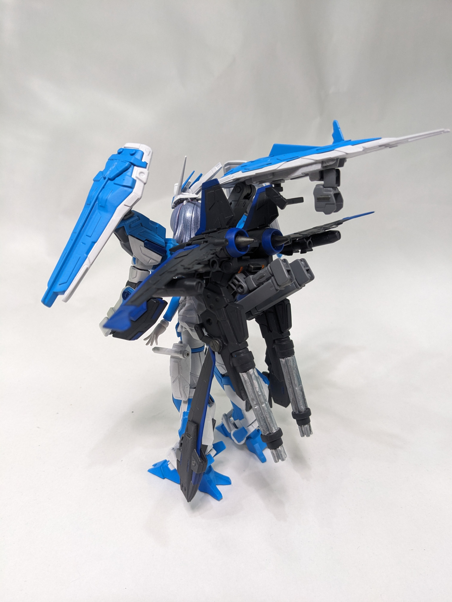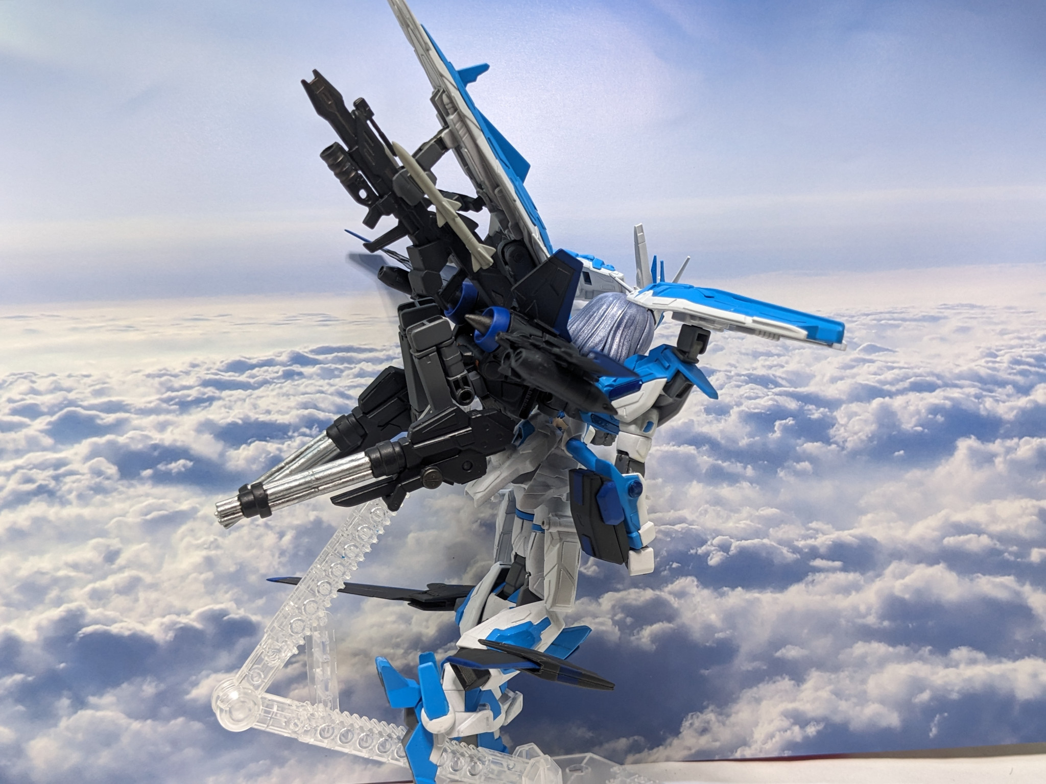 飛行ユニットのミサイルやガトリングガン、腕部の隠しガトリング、ビームライフルとミサイルなどなど、この重量増加に伴い脚部にほじゅよくを追加して飛行能力を補助している。