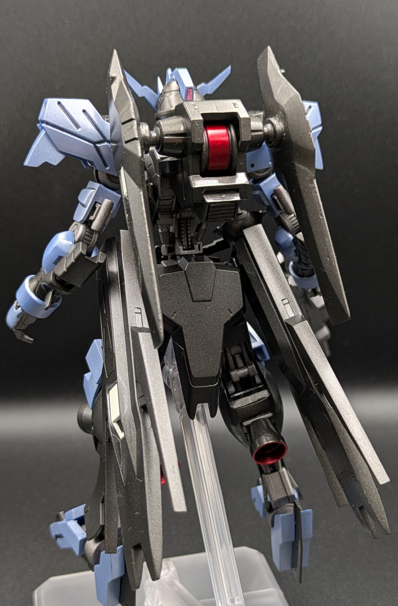 リアクターとバーニア内部はガンクロームの上からクリアレッドを吹いてキャンディ塗装にしています。背面ブースターの肉抜き穴は埋めるのが大変でした。