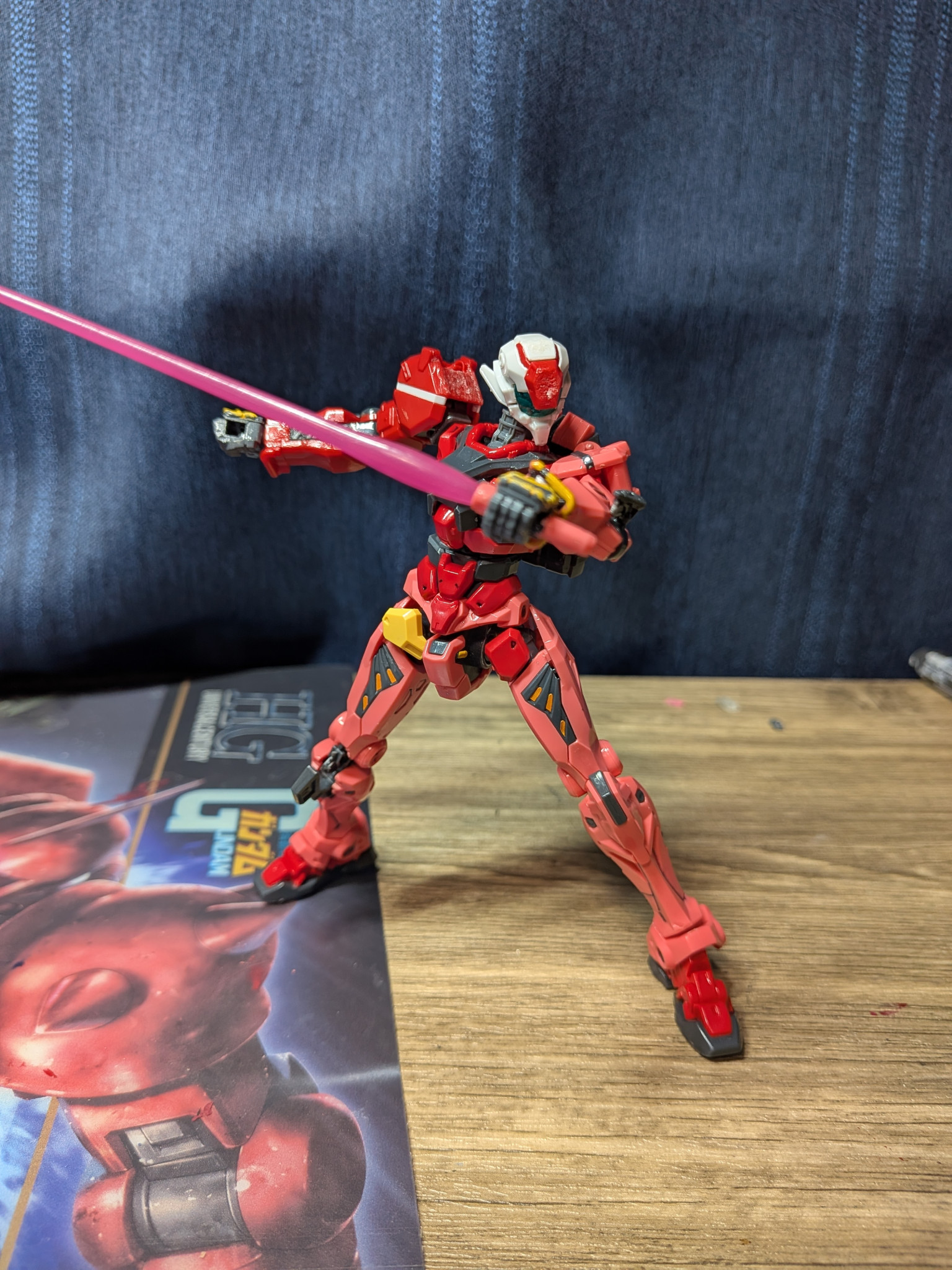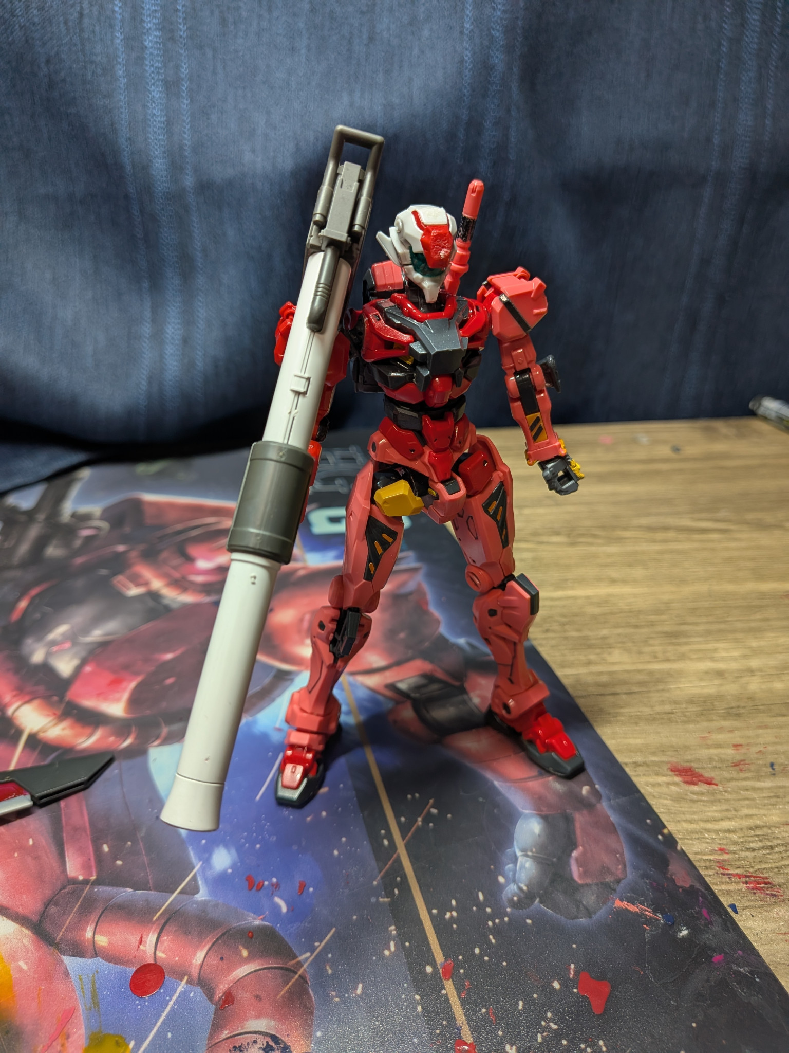 一応設定も作りました。キケロガとの決戦で大破、コアファイターがなくなってしまった赤いガンダムをヒゲマン(シャリア・ブル)が軽キャノンをベースに改修したMS。そして、マチュがヒゲマンにシュウジのところに行きたいと言ったことでジフレドのサイコミュを搭載し、ゼクノヴァを起こしてシュウジの元へ行けるようにしたのが本機。ニャアンがパイロットとなっている。武装は軽キャノンのライフルを改修したもの。軽キャノンのパーツは鹵獲した軽キャノンのパーツを使っているため、ボロボロのパーツもある。コアファイターは軽キャノンのものをキャノンを外し、塗装したものが使用されている。(実際は軽キャノンのパーツを無くしただけ)