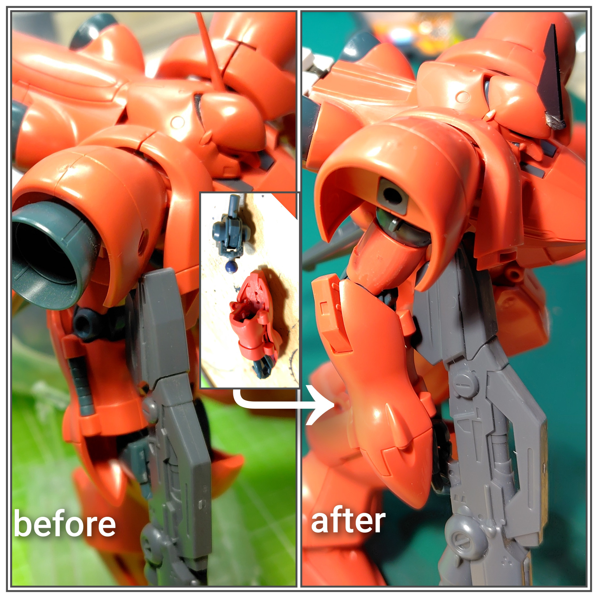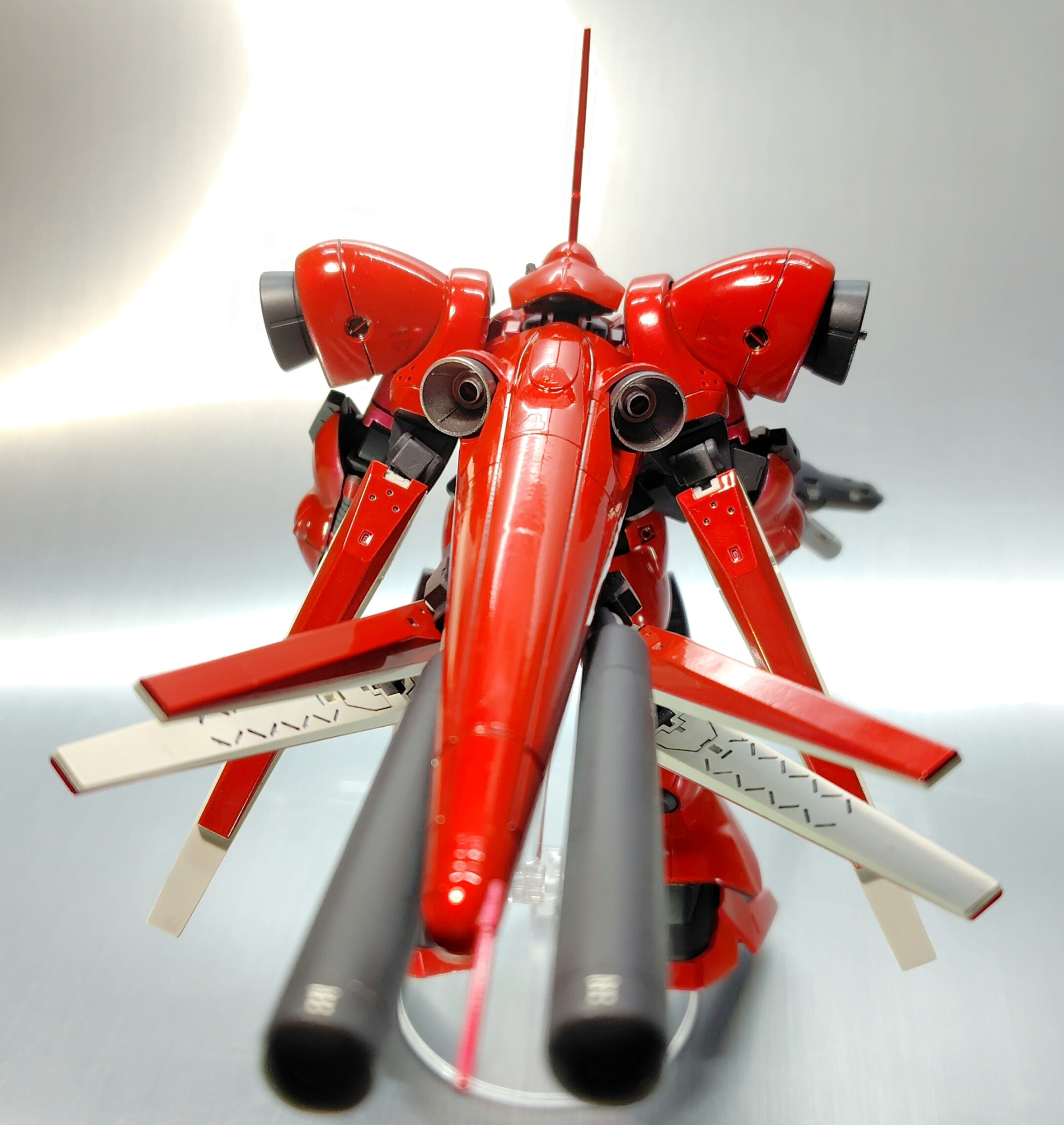 あとキライではないのですが背中のナマズのしっぽ感に変化をつけたくて、ジャンクで取っておいたハイニューのフィンファンネルを放熱板の様に使えるかと。逆シャア劇中でギュネイが放熱板表現してたのでまさに脇後ろのちょっと邪魔な放熱板の代わりにちょーどよいのかと。