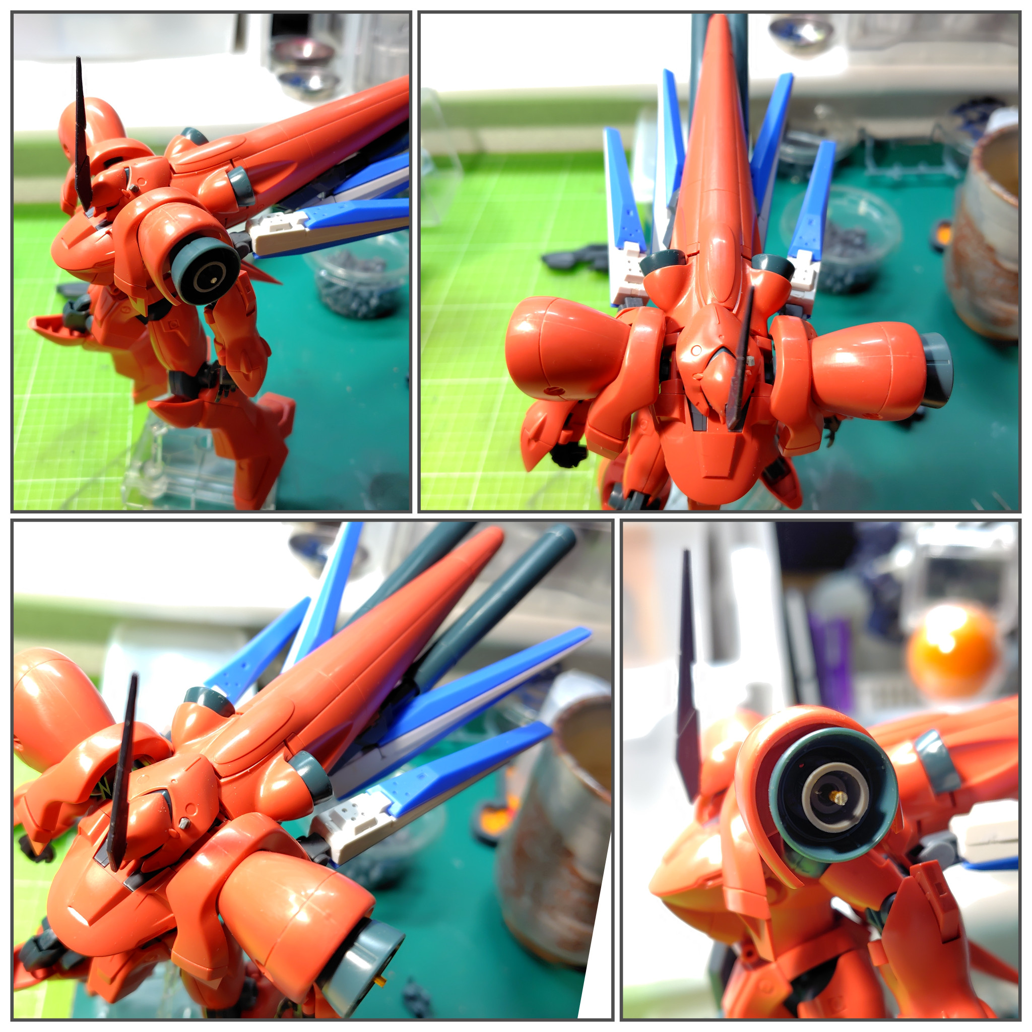 元々のプロペラントタンクの位置があまりにも不自然だったので何とかしよーと思ったのですがナマズしっぽに這わせるだけに落ち着いてしまった。タンクとしての意味合いがあまり感じられないので無理に装着しなくてもいい気がしますね。