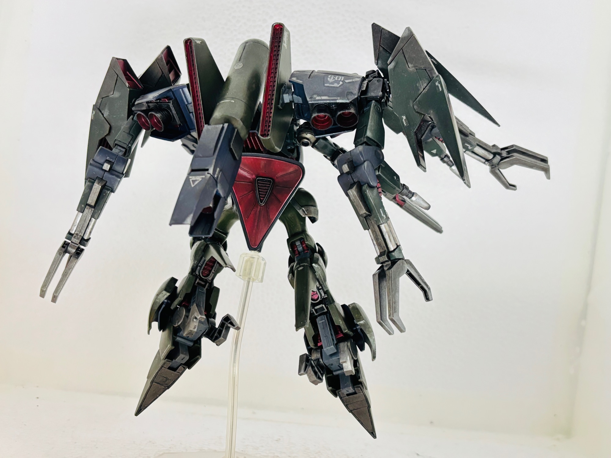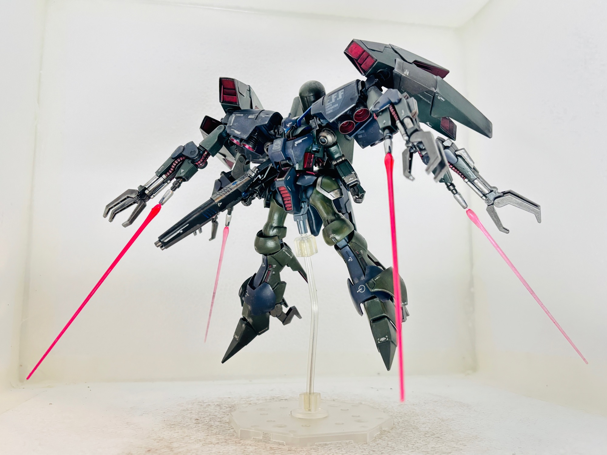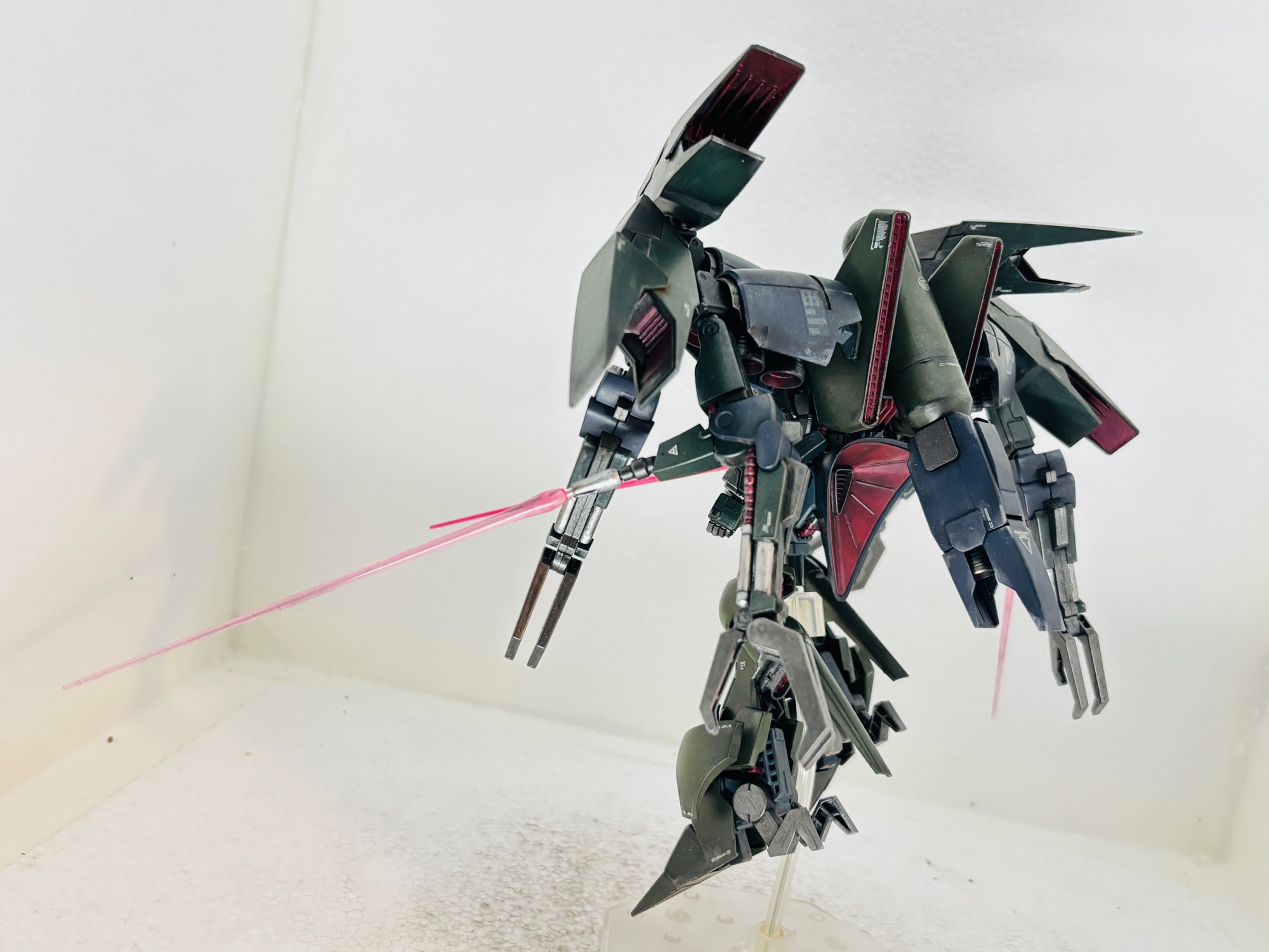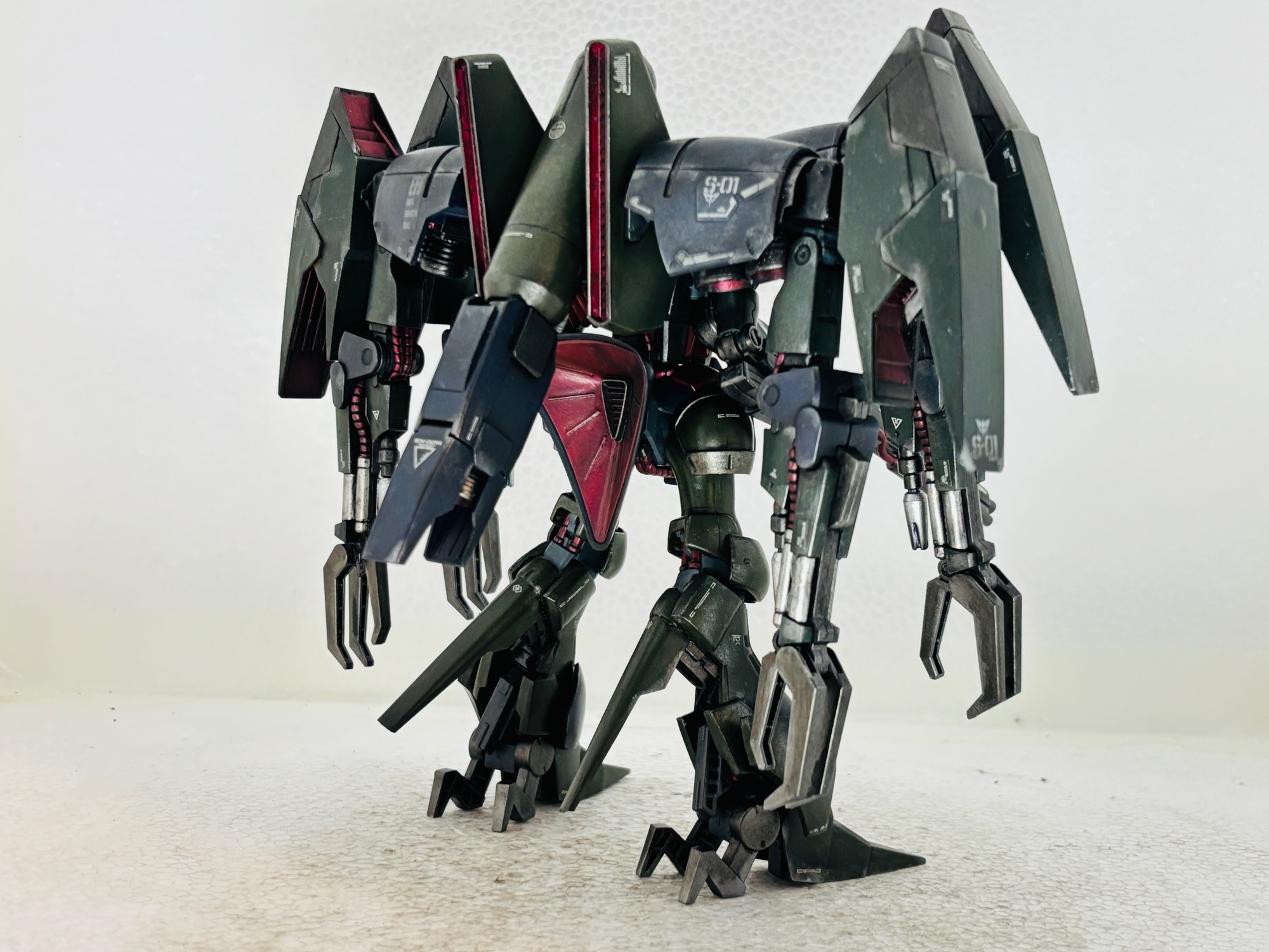 『シーマガラハウは生きていた。』と言う妄想設定、第三弾。バイアランカスタム1号機、2号機同時製作で余剰パーツとジャンクパーツを盛ってみました。先ずは1号機、Hi-νガンダムの腕をメインアームとしてサブアームを4本にした近接白兵戦特化のアルティメット仕様です。筆塗り部分塗装、墨入れ、デカール、つや消しトップコート、汚しの仕上げです。