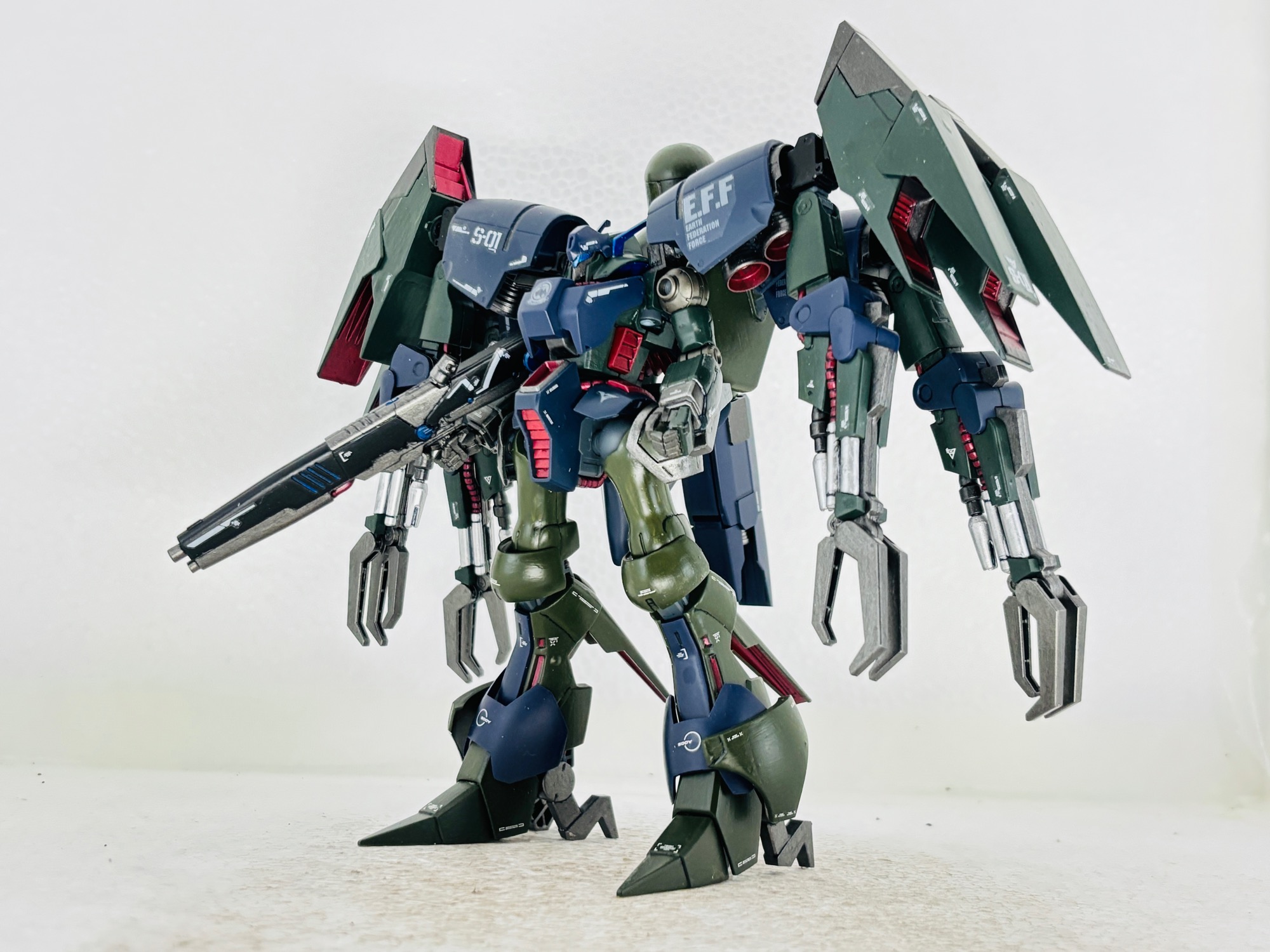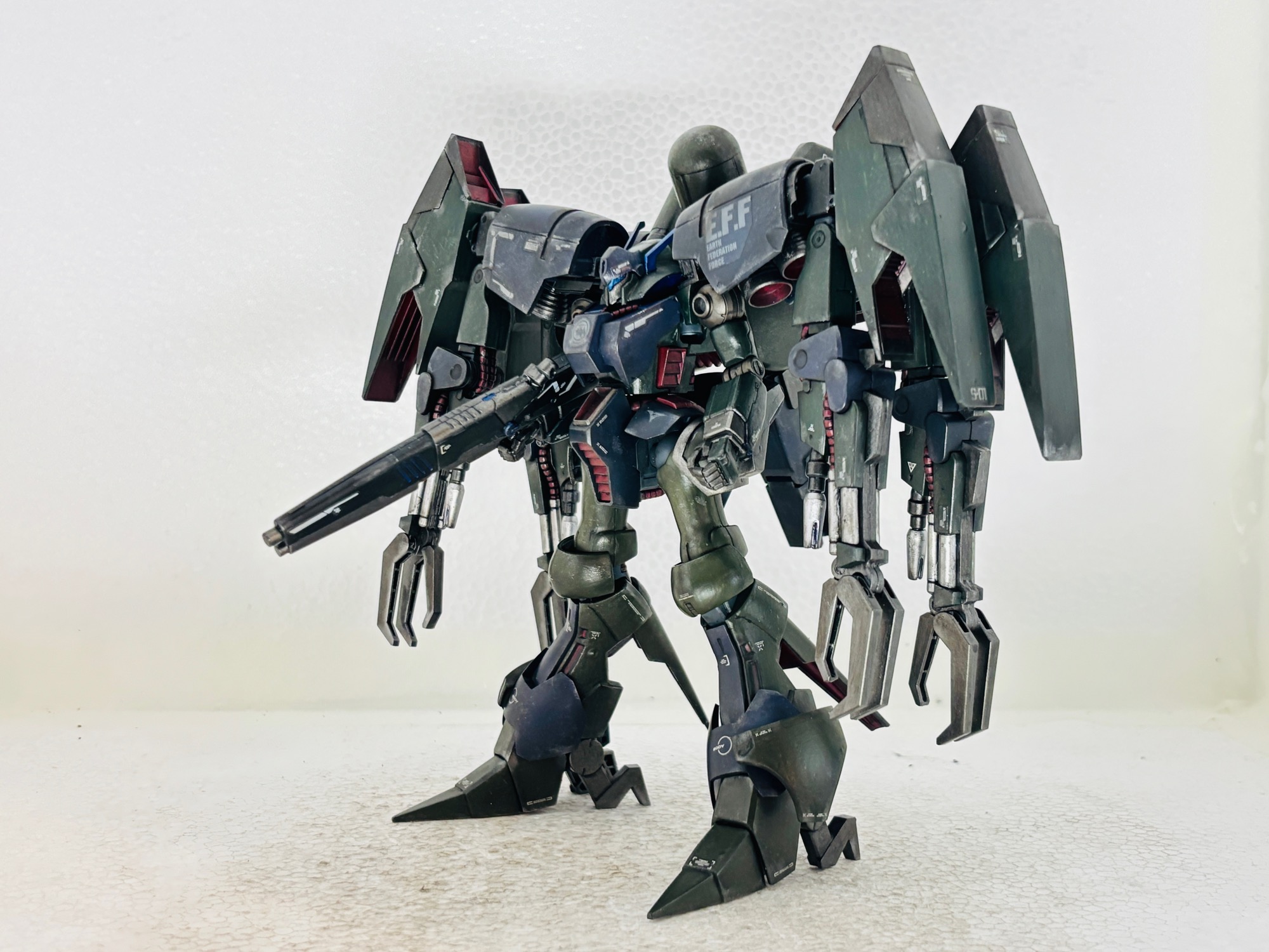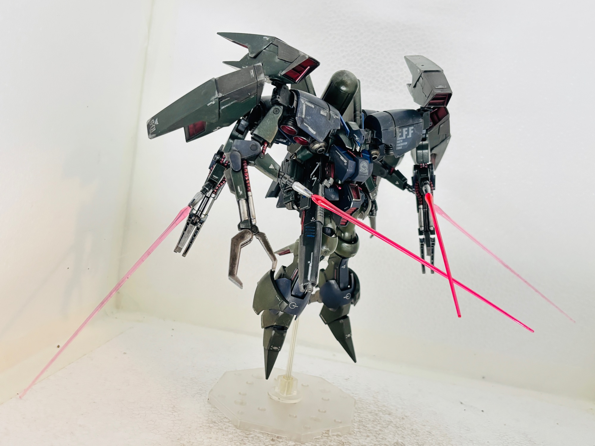 『シーマガラハウは生きていた。』と言う妄想設定、第三弾。バイアランカスタム1号機、2号機同時製作で余剰パーツとジャンクパーツを盛ってみました。先ずは1号機、Hi-νガンダムの腕をメインアームとしてサブアームを4本にした近接白兵戦特化のアルティメット仕様です。筆塗り部分塗装、墨入れ、デカール、つや消しトップコート、汚しの仕上げです。