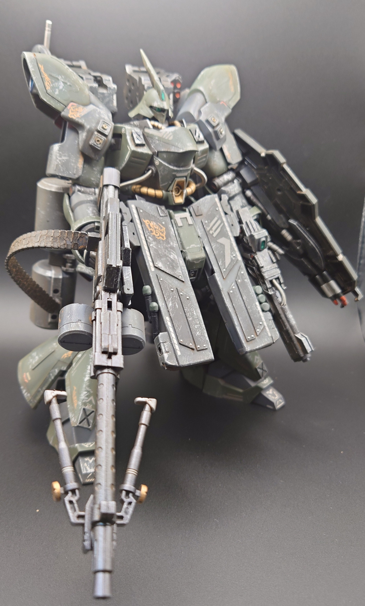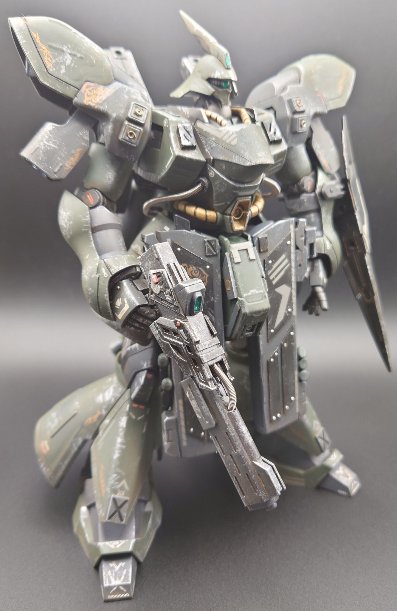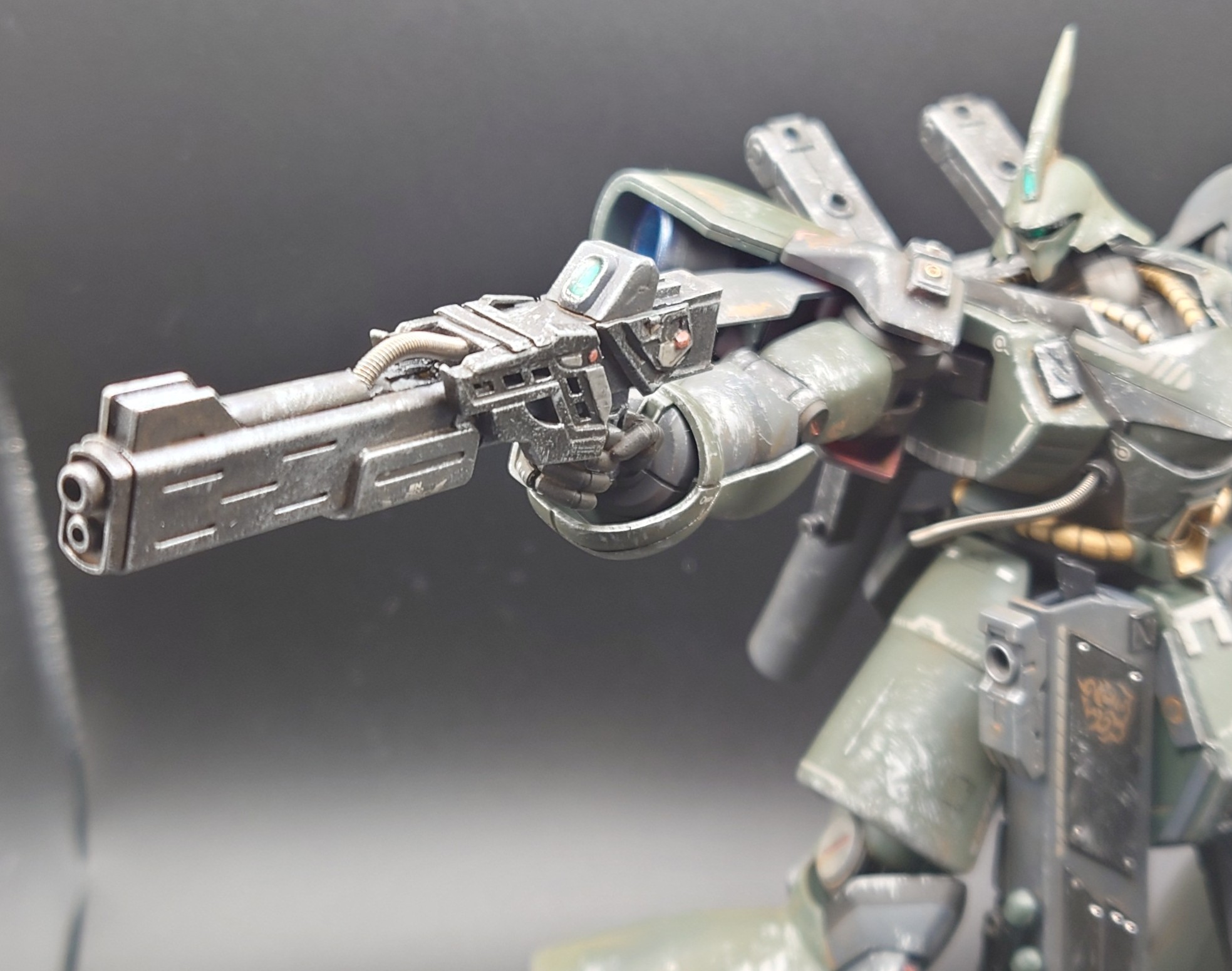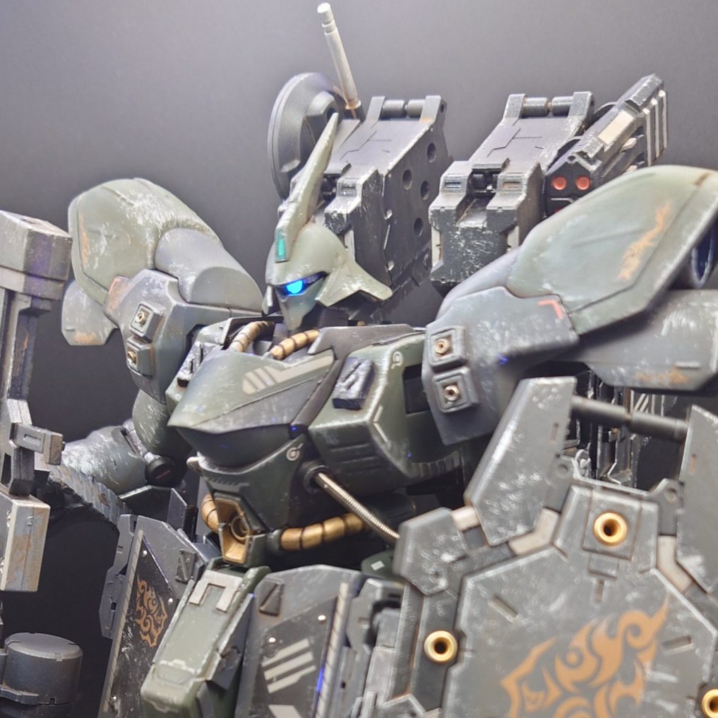 フロントスカートは元のモノの上からプラ板を貼って作成。リヤスカートはザクIIIから流用。肩にブースターを追加。武装は30MMのモノを組み合わせています。