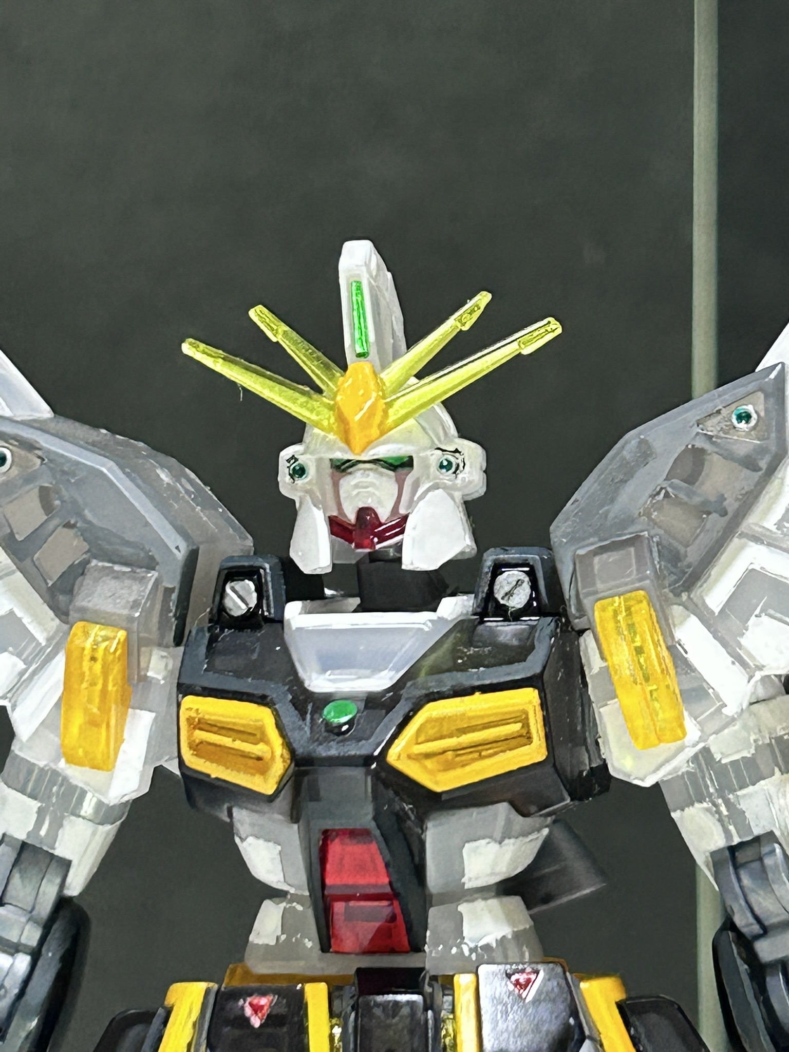 顔アップ。クリアを残したことでデスティニーの血涙のようになった顔がチャームポイント。前作からの教訓でアンテナは基部以外クリア残し。胸のダクトも実物だとかなり奥行きがある感じで良いです。