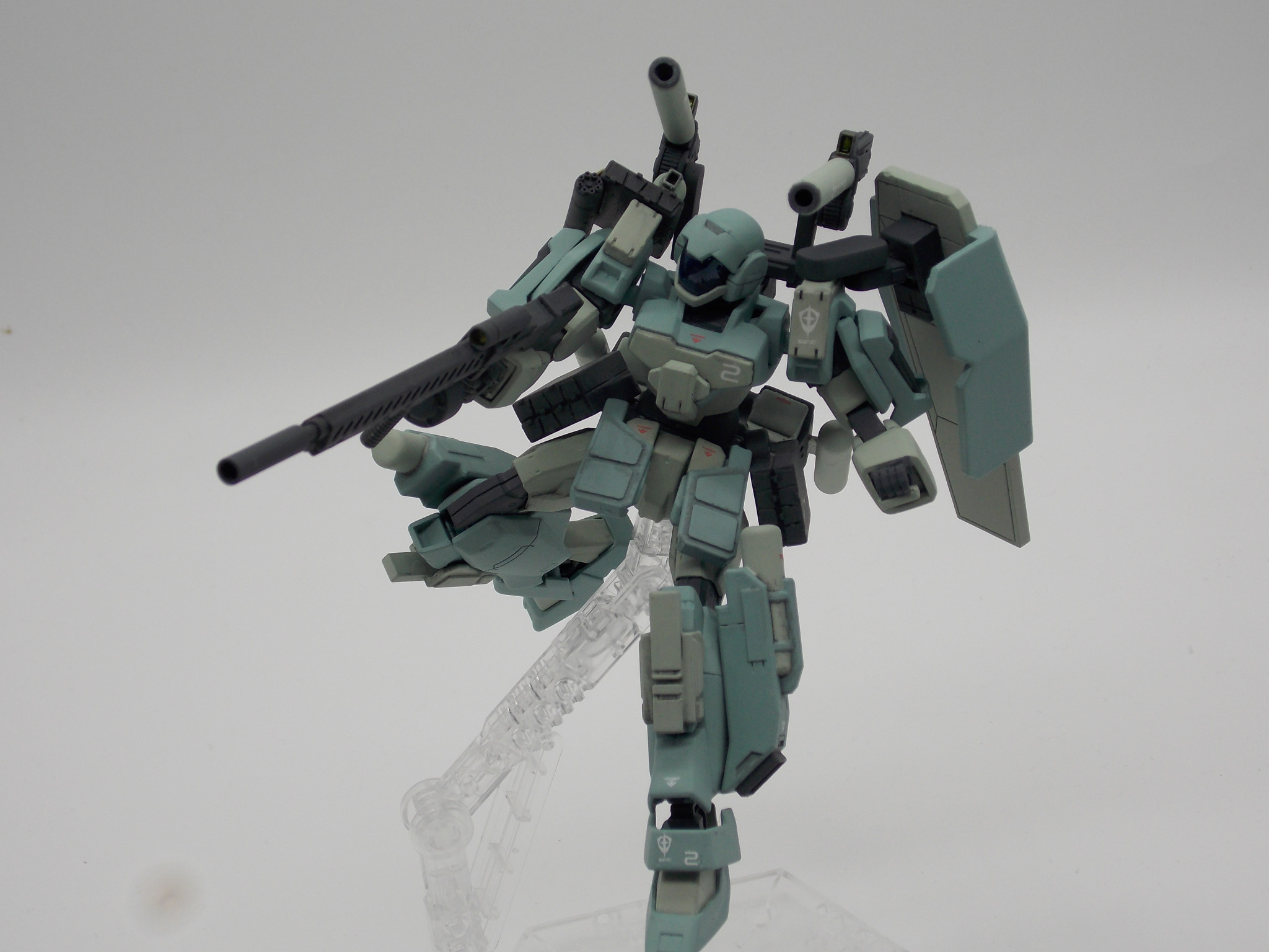 全身に増加装甲や武器がついてますが、稼働時間の延伸と運動性の向上に振ったため、AGE-1のアサルトジャケットやグランサと比べると装甲は少なめ。代わりに左肩部にラージシールドが装備されているとかなんとか。