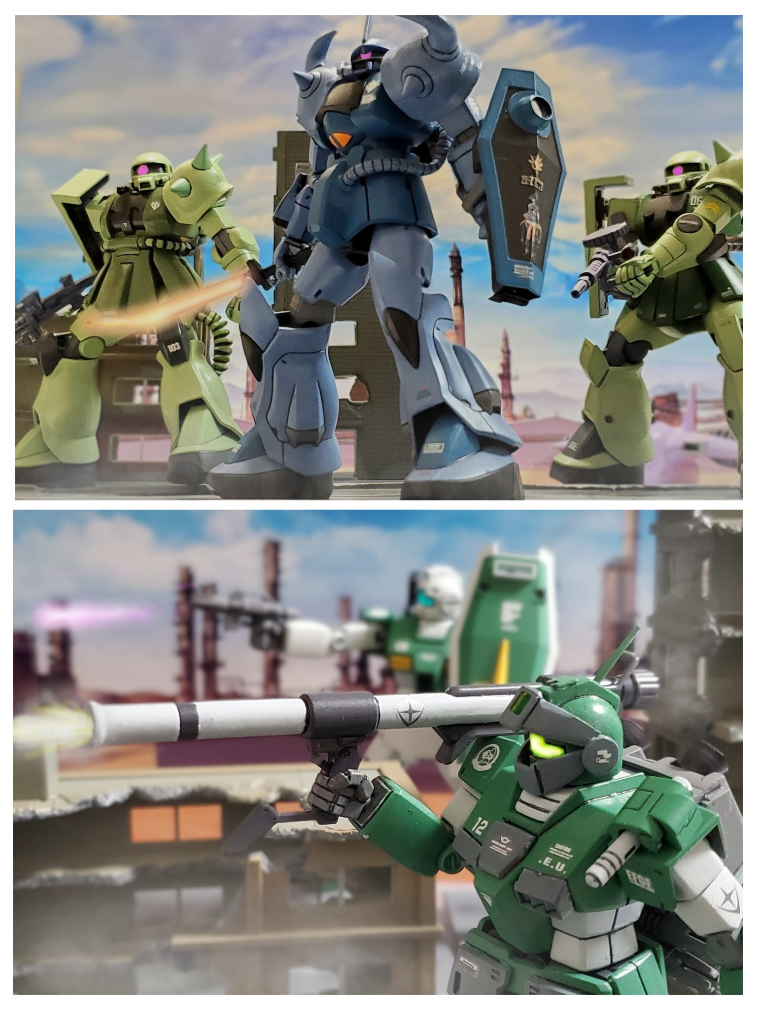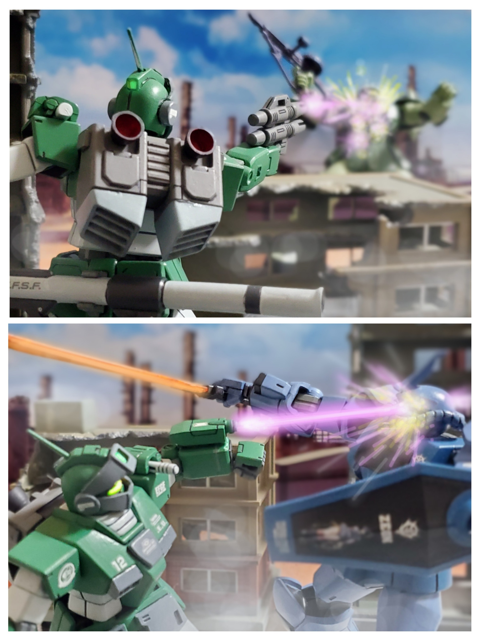 廃墟と化した都市部を利用し交戦する両軍。ロン・コウ少尉は取り回しに優れた二連装ビームガンでザクを撃破していく。このビームガンは上下交互に放つ事で連射性能と集弾破壊力を得ており、スナイパーカスタムの標準装備として採用されたのである。