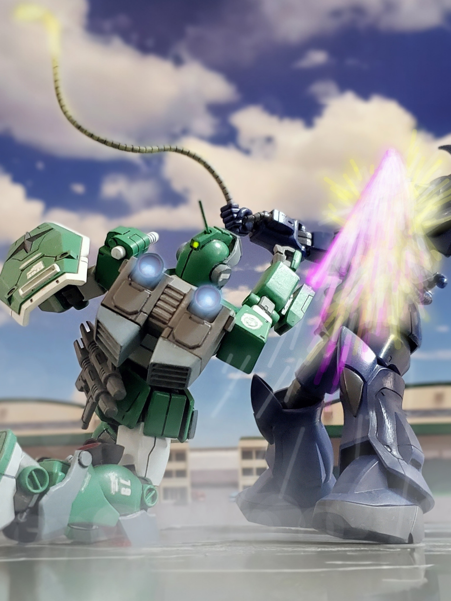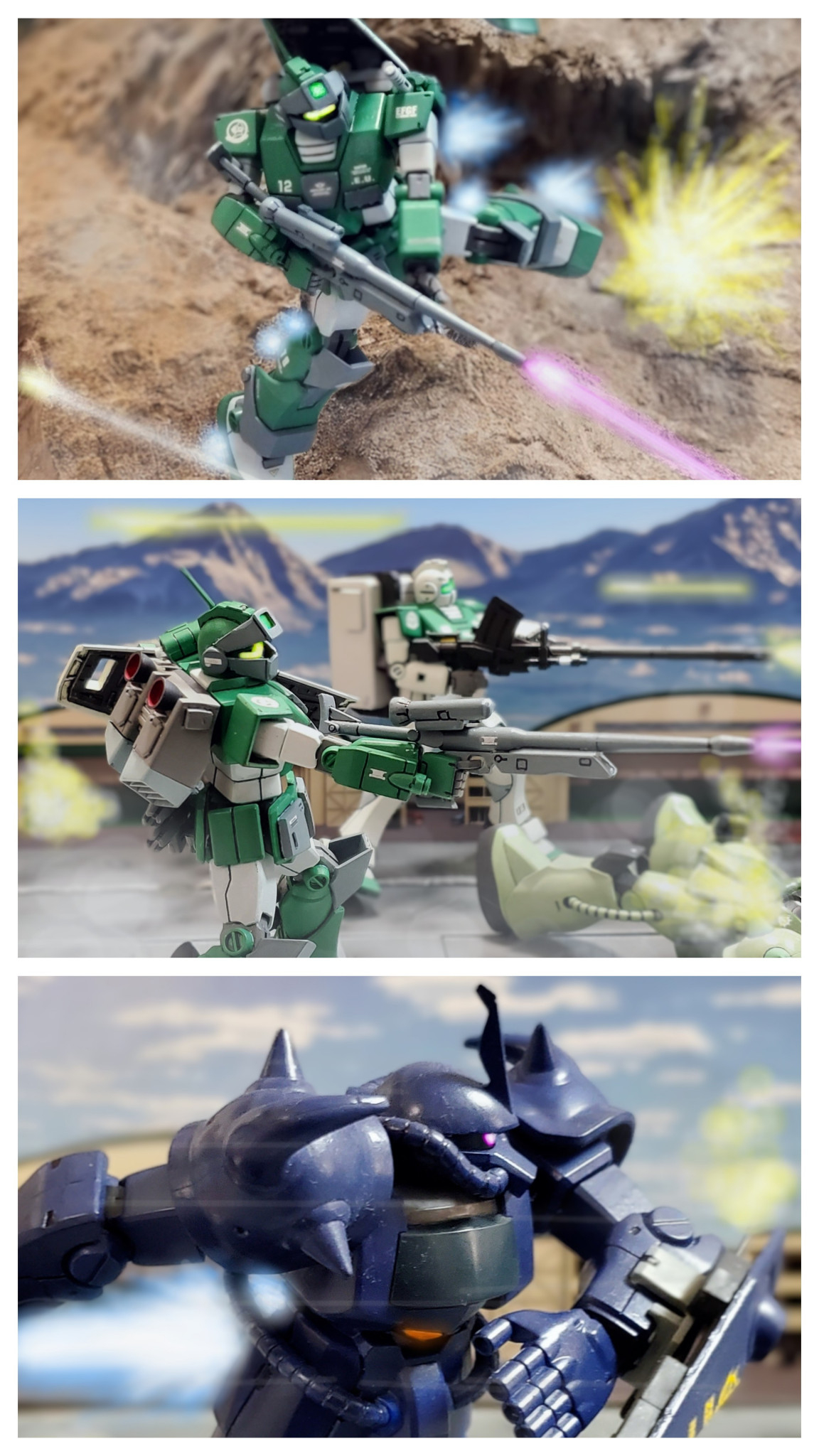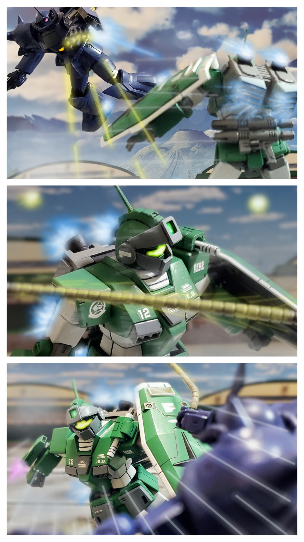 連邦MS部隊をすり抜けジム・スナイパーカスタムに強襲をかけるグフタイプ。左腕の5連装マシンガンが火を吹きスナイパーカスタムを襲う。警告アラームに素早く反応しロン・コウ少尉は間一髪で回避する👍️